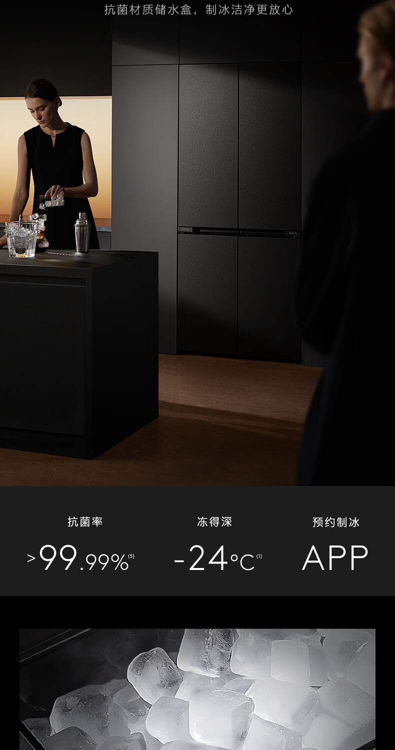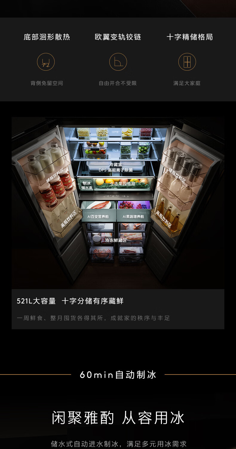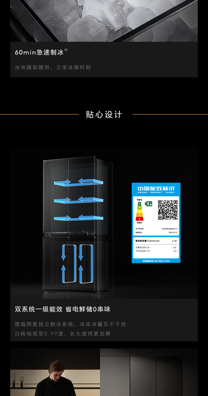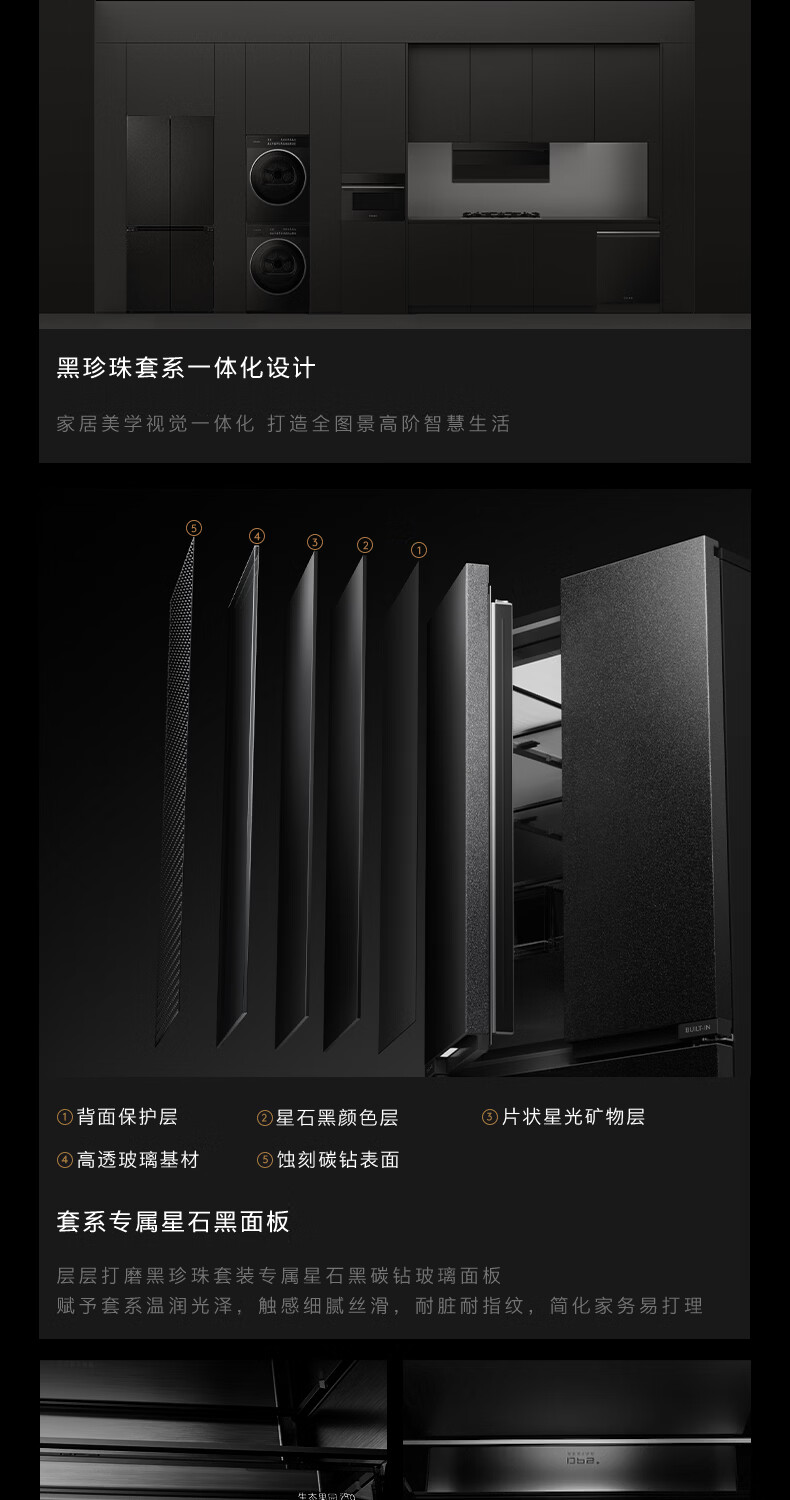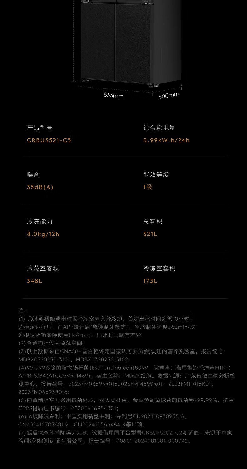 COLMO黑珍珠521L十字门冰箱自动制冰纯平全嵌一级能效双系统风冷无霜以旧换新星石黑CRBUS521-C3