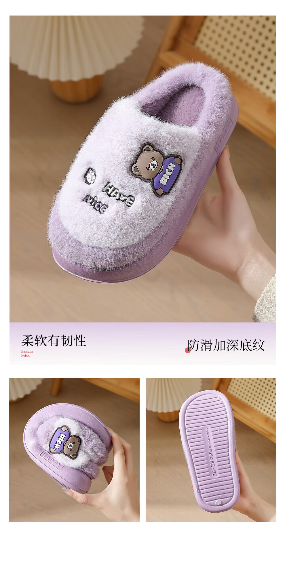 FZT厚底男士棉拖鞋加绒加厚秋冬季2026新款毛绒保暖室内家居毛毛拖鞋 紫色【厚底防滑】 36-37 适合35-36