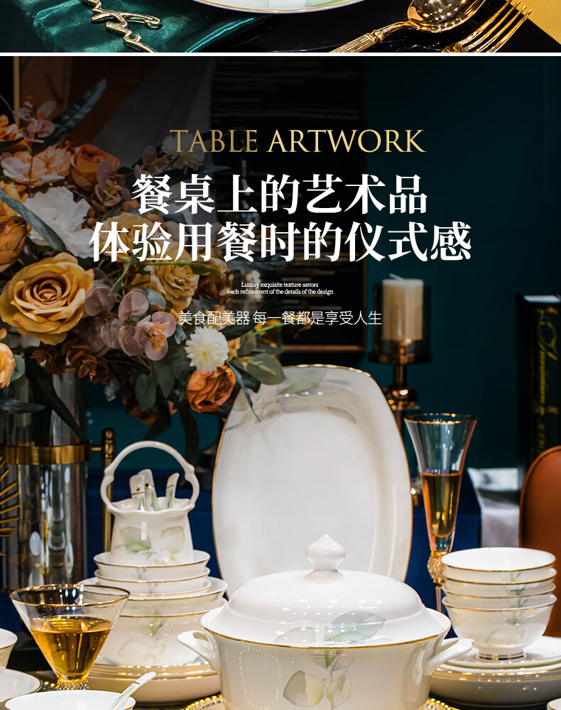 精缔陶瓷JINGDI 碗盘餐具整套景德镇高档中式骨瓷餐具套装陶瓷碗盘碟筷整套送礼 圆形标准配大汤碗 66件套