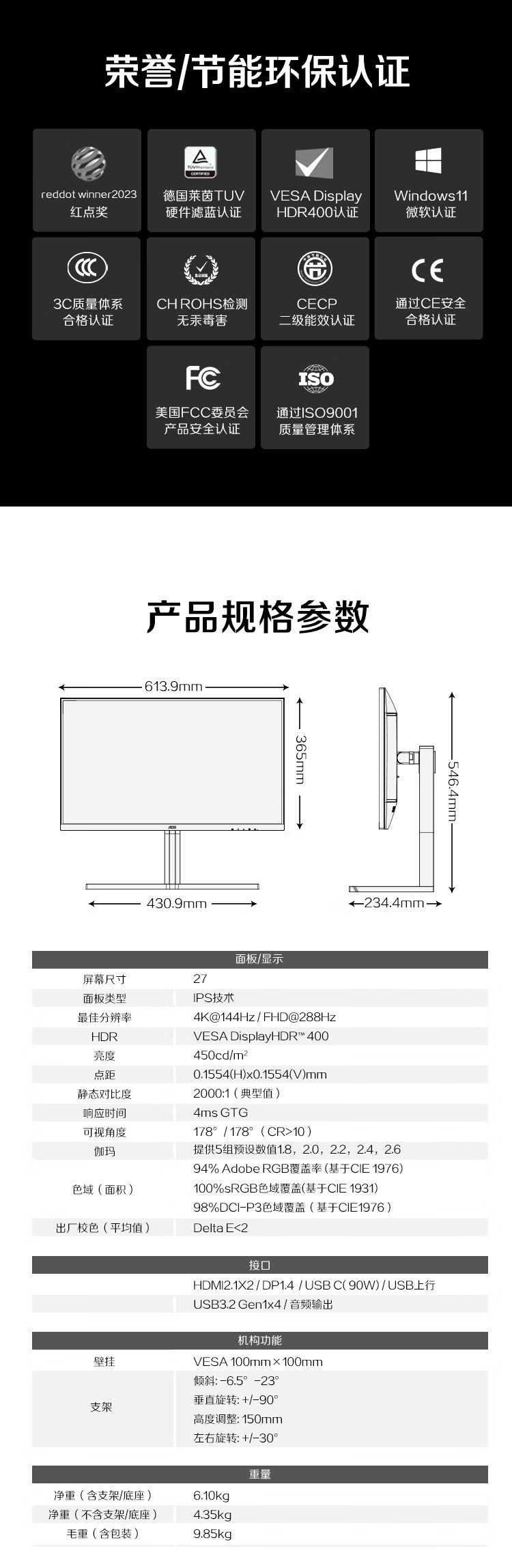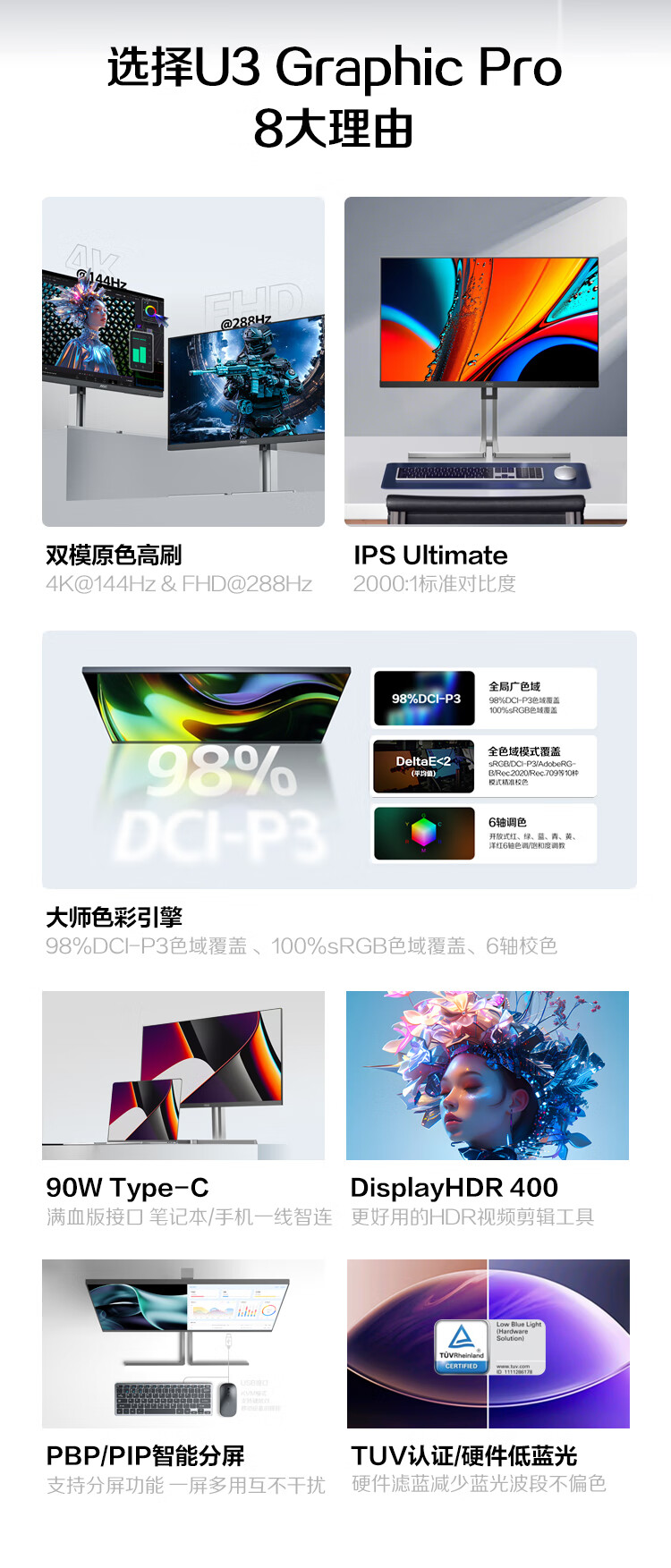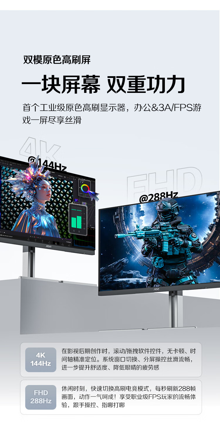 AOC 27英寸4K 144Hz双模FHD 288Hz HDR400 Type-C96W 硬件低蓝光 macmini节能游戏办公显示器U27U3XD