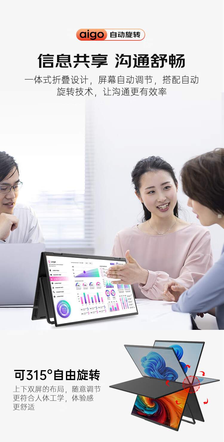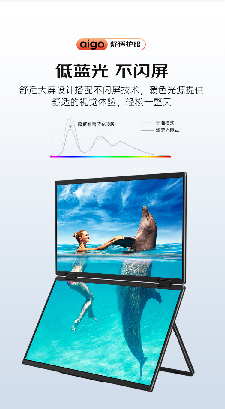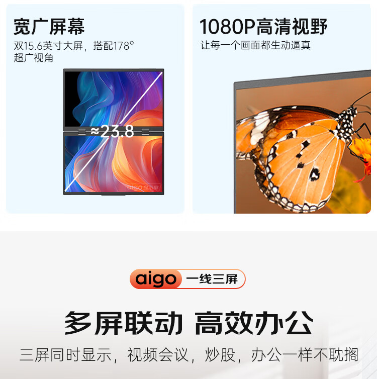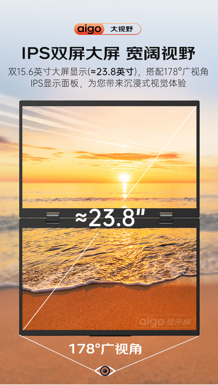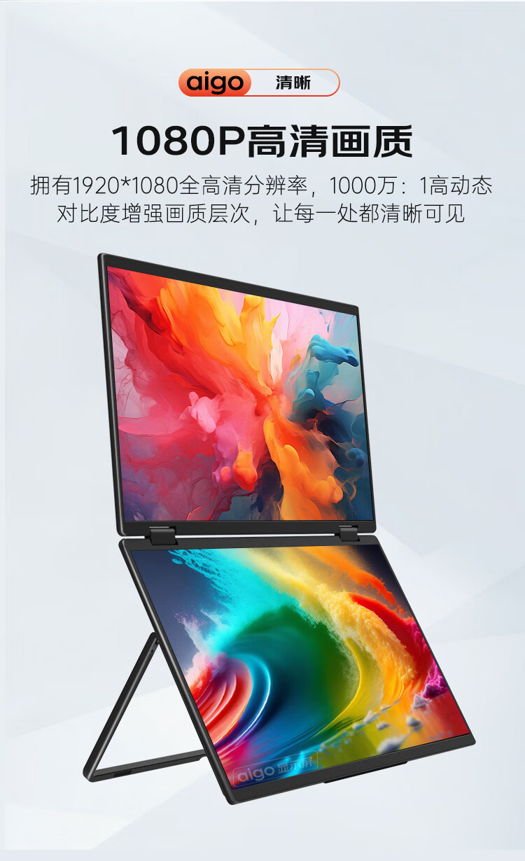 爱国者aigo15.6英寸双屏便携式显示器可折叠扩展三屏笔记本电脑副屏 办公炒股电脑扩展屏一线通金属外壳
