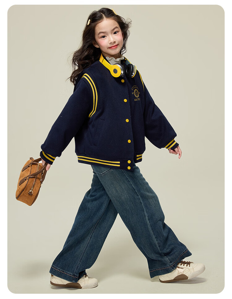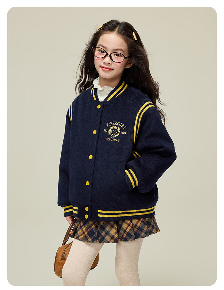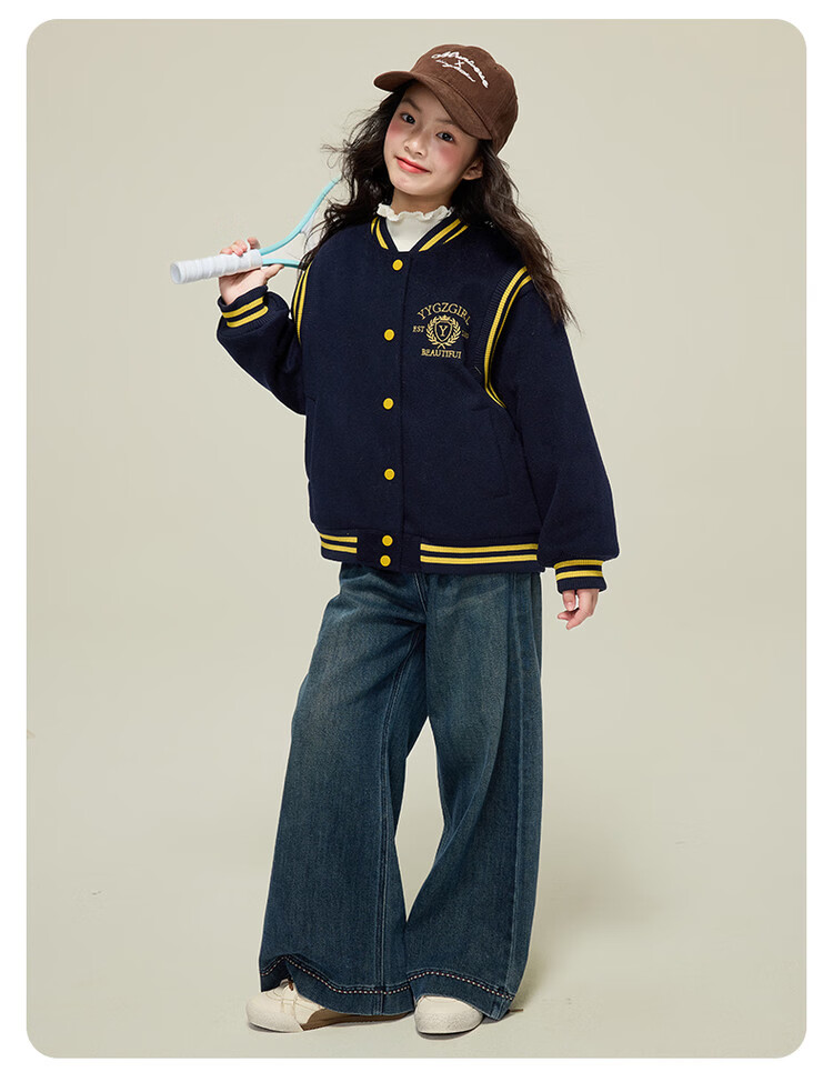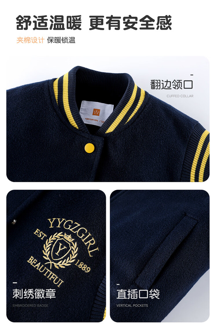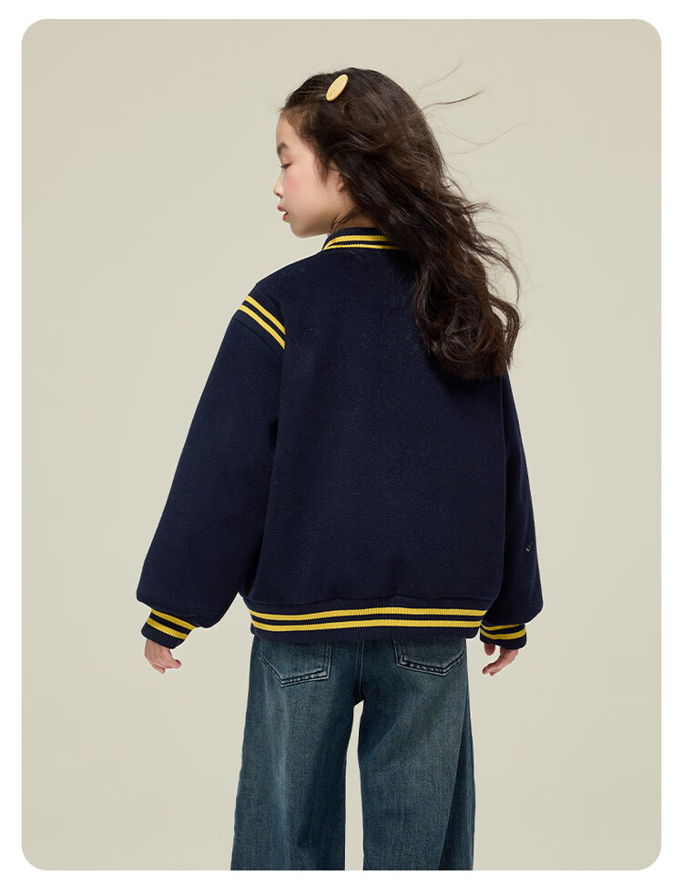 媛媛公主女童毛呢外套25秋冬学院风撞色刺绣夹棉加厚棒球服儿童户外夹克 藏青色 110