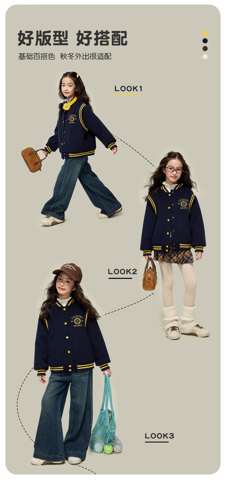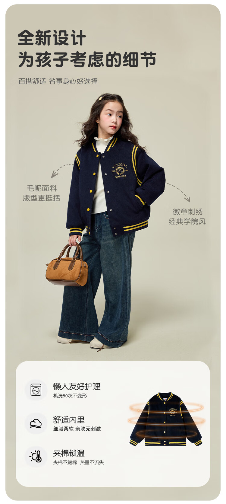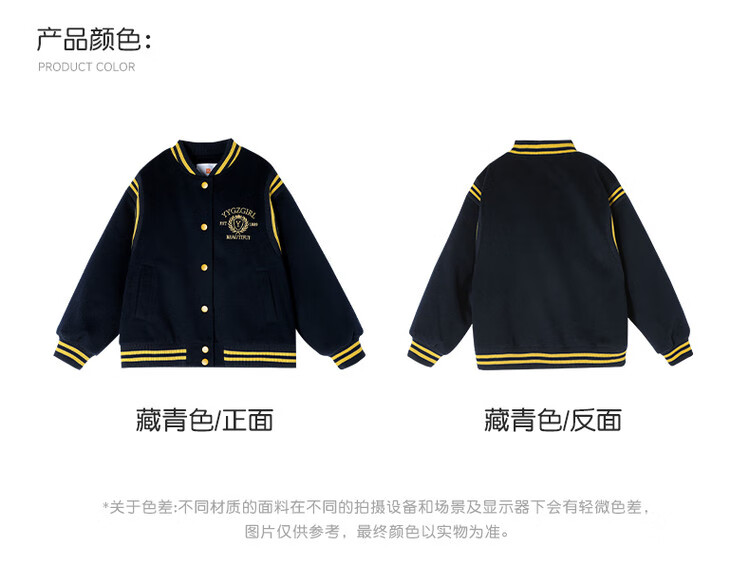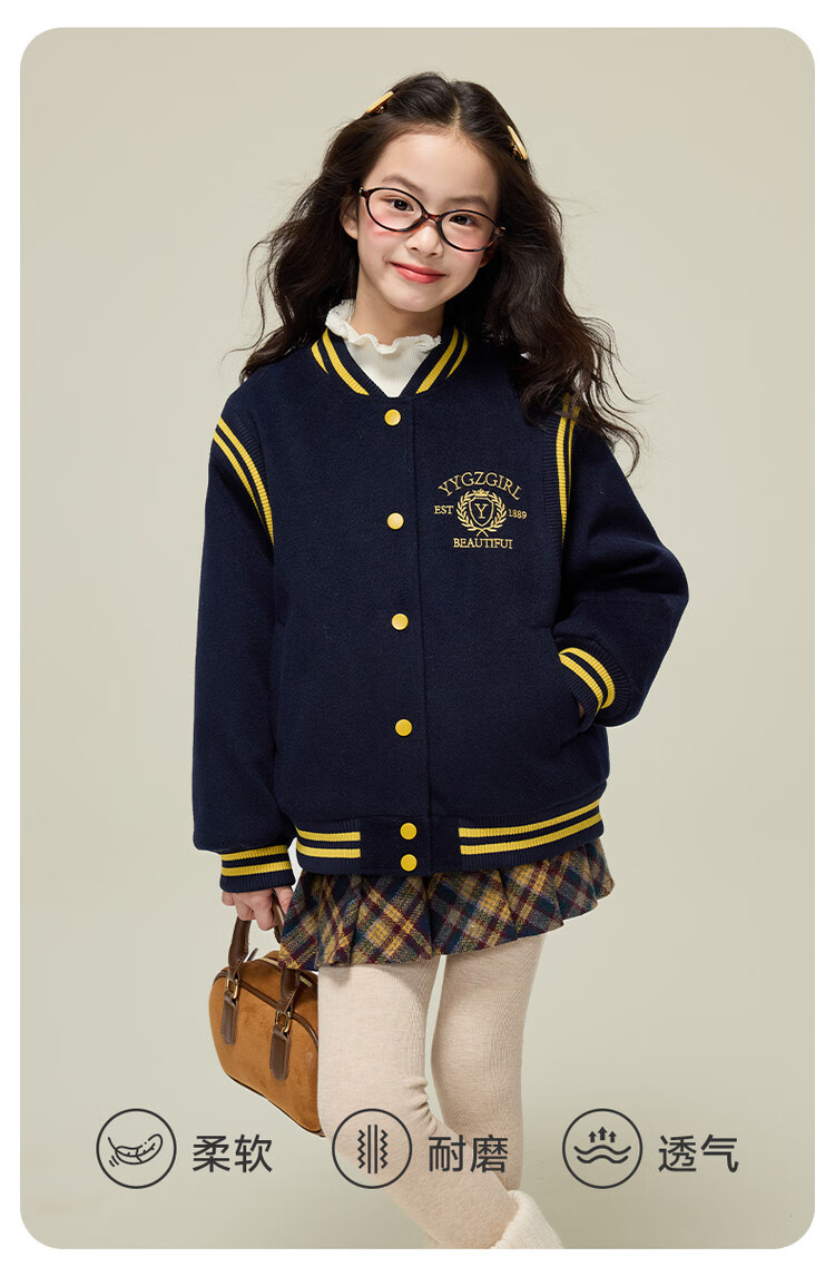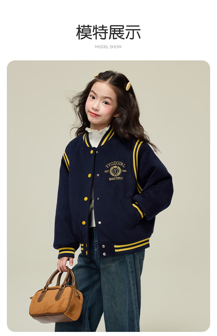 媛媛公主女童毛呢外套25秋冬学院风撞色刺绣夹棉加厚棒球服儿童户外夹克 藏青色 110