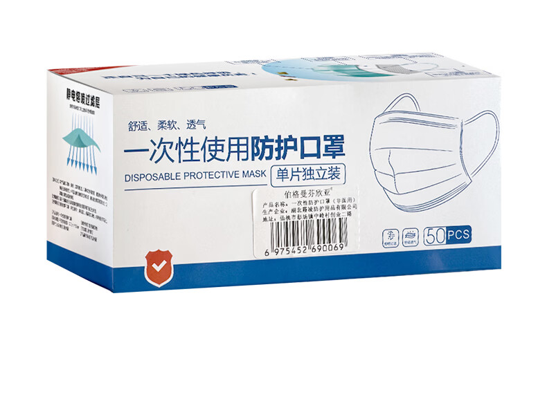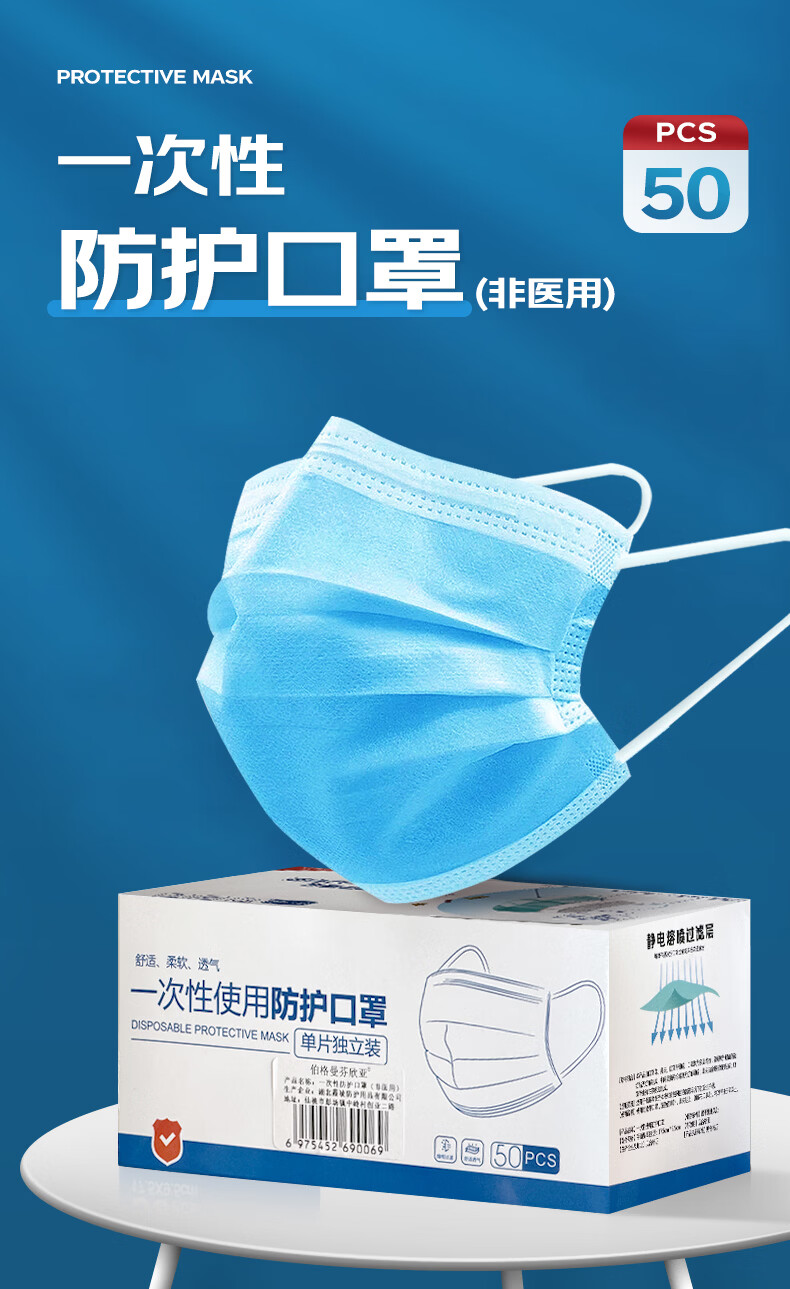 伯格曼芬欣亚口罩一次性独立包装50只三层透气薄款非医用防护使用口罩wn 50片/包