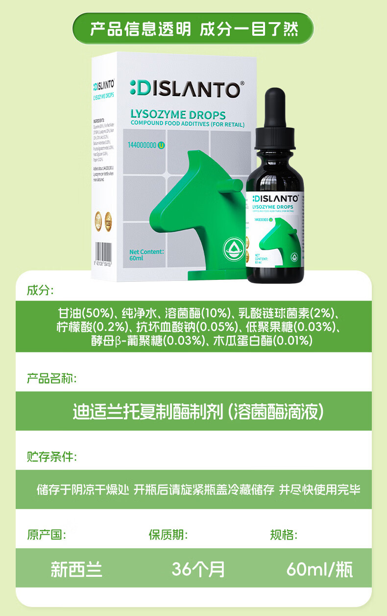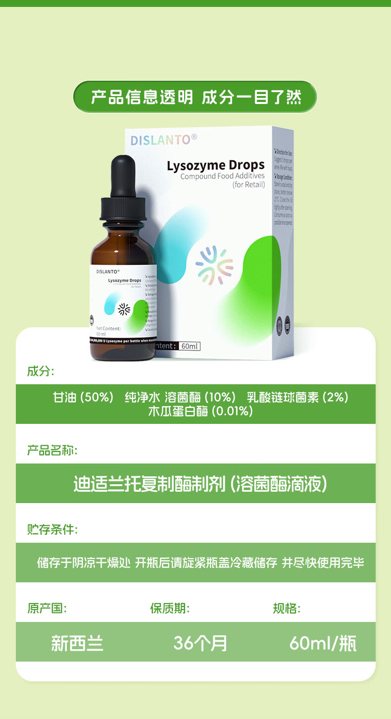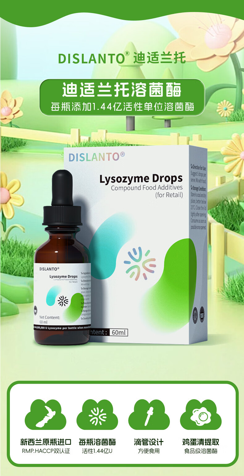 迪适兰托溶菌酶滴剂复配酶乳酸链球菌素蛋白酶弱酸性溶菌酶新西兰原装进口 【新西兰进口】溶菌酶 60ml*1瓶