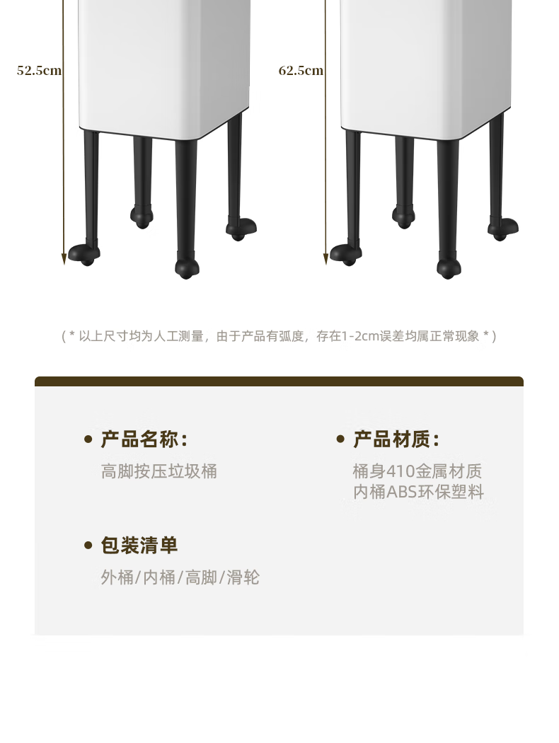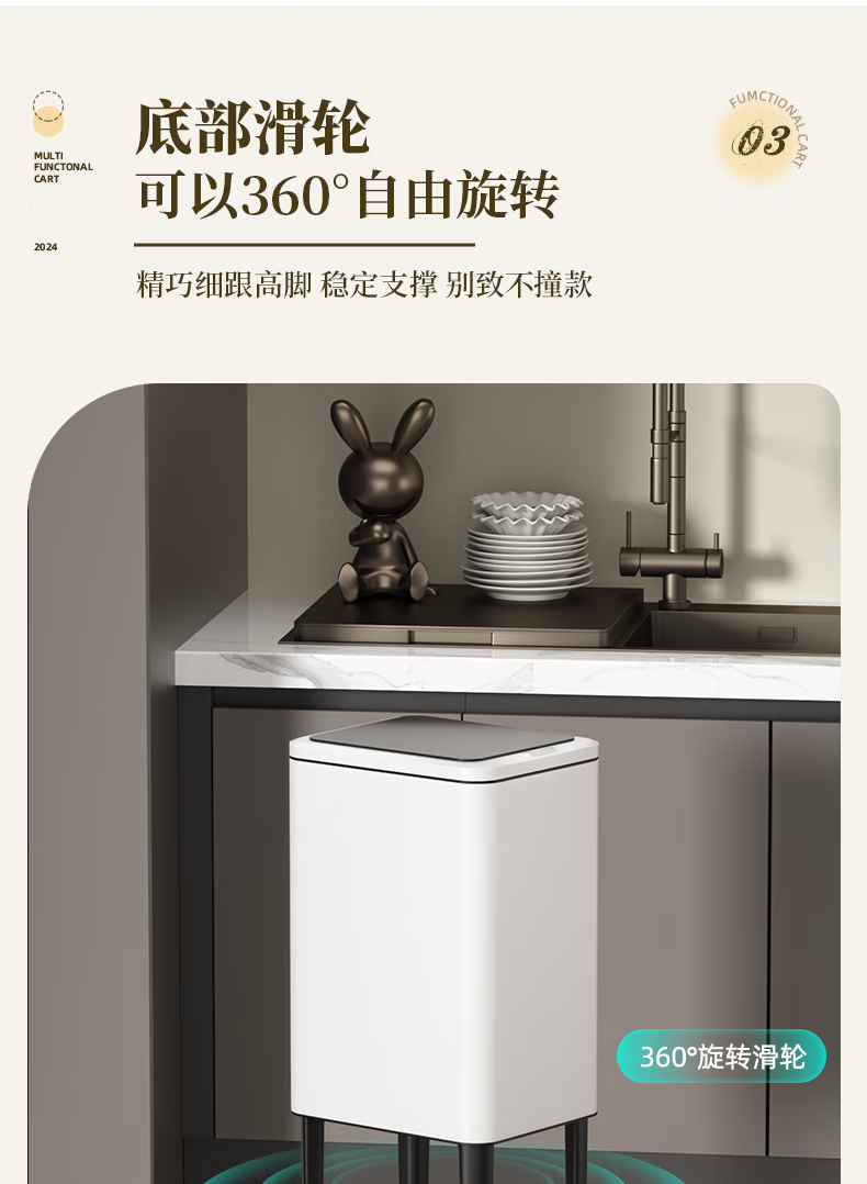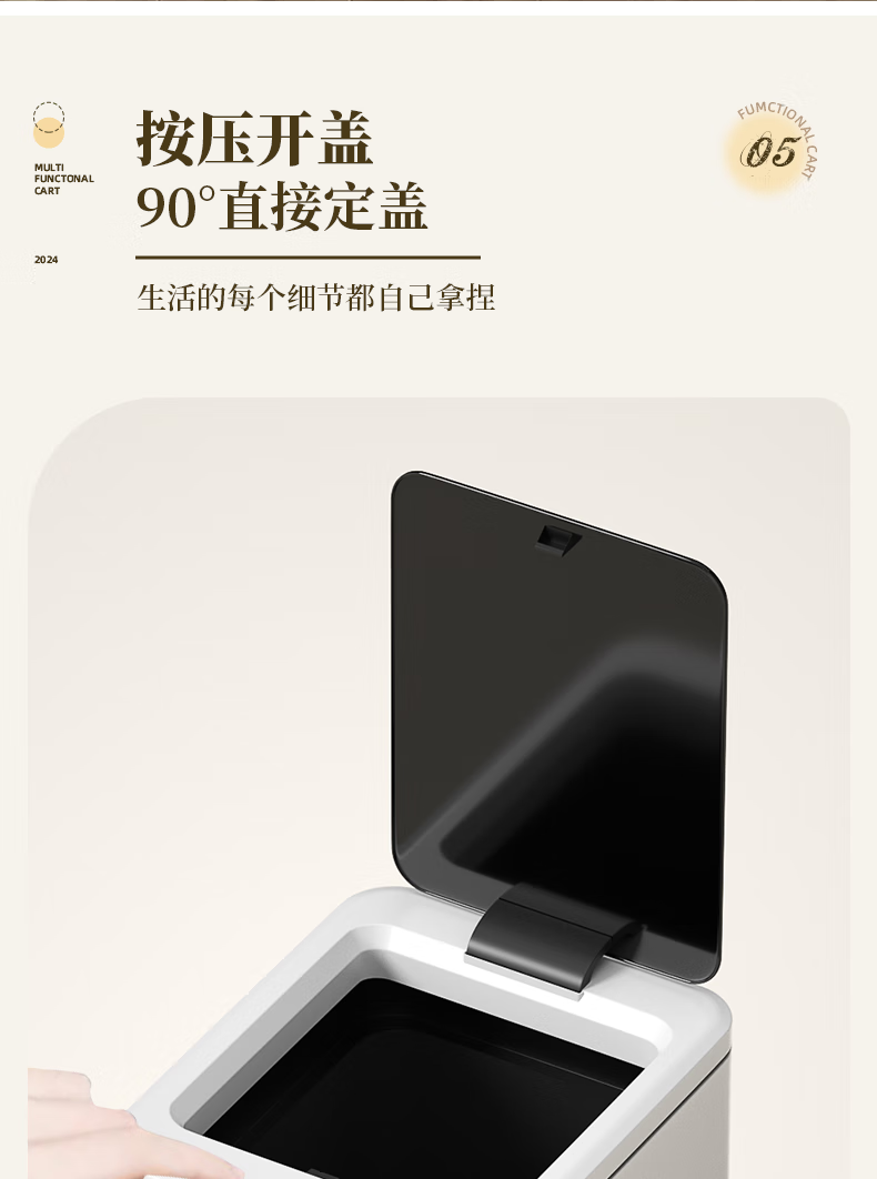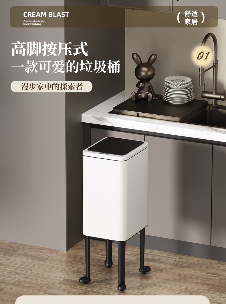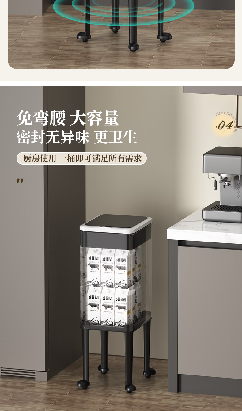 帝梵厨房垃圾桶带滑轮轮子家用可移动卫生间卧室大容量厨房客厅带盖 15L砂钢银丨按压式【高脚带轮】