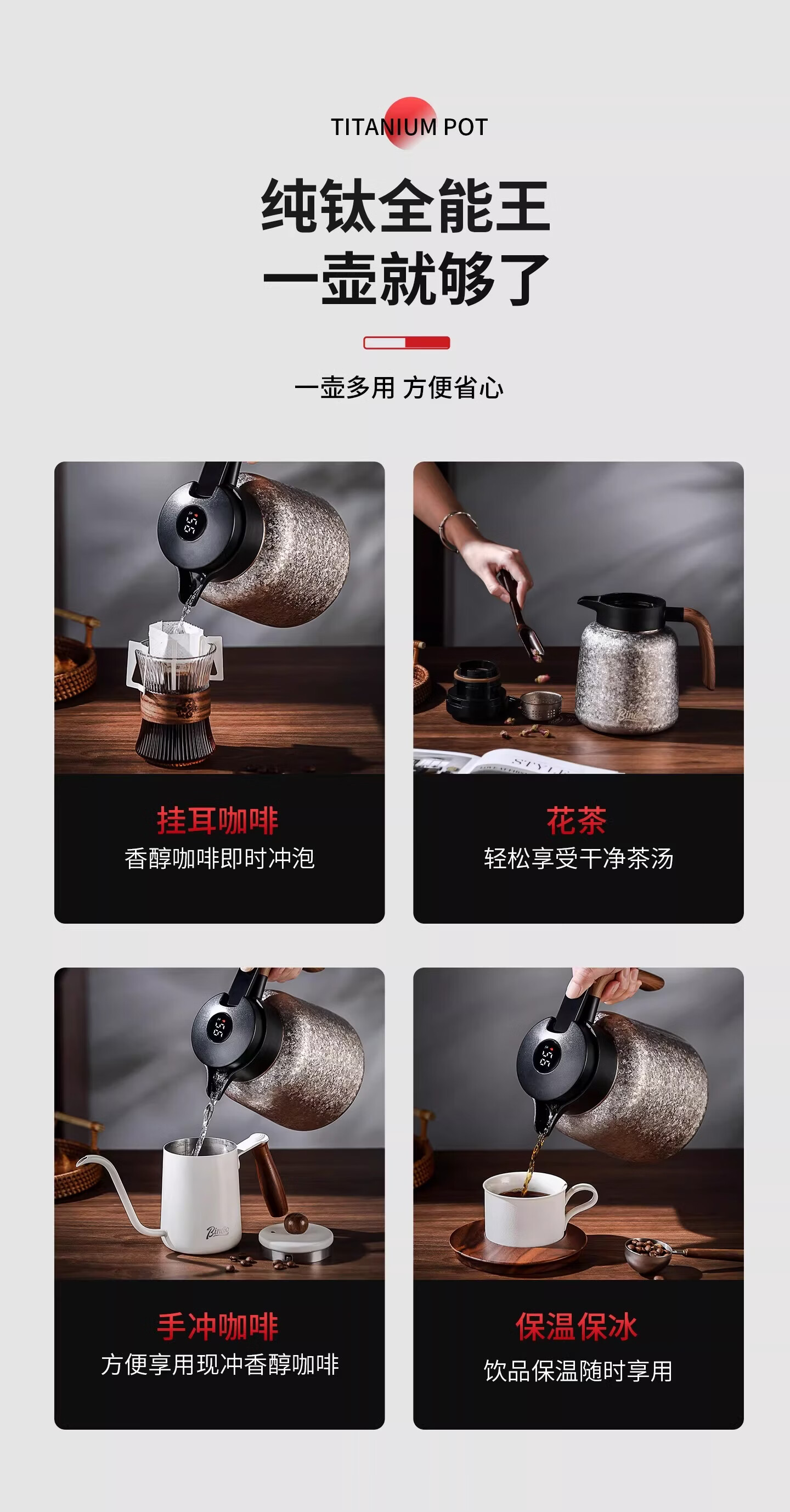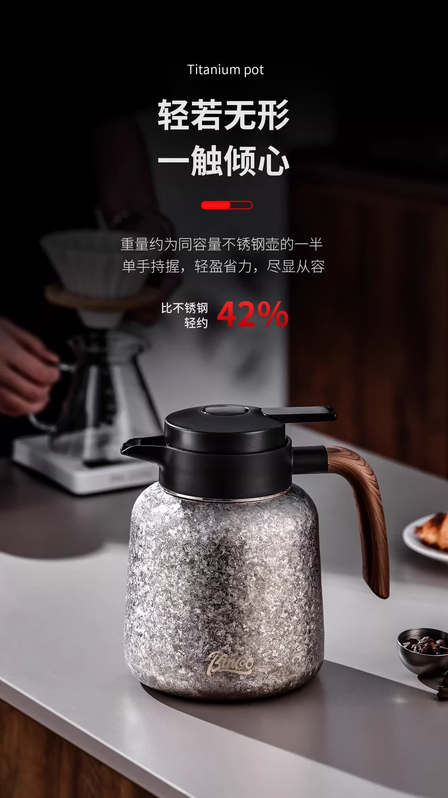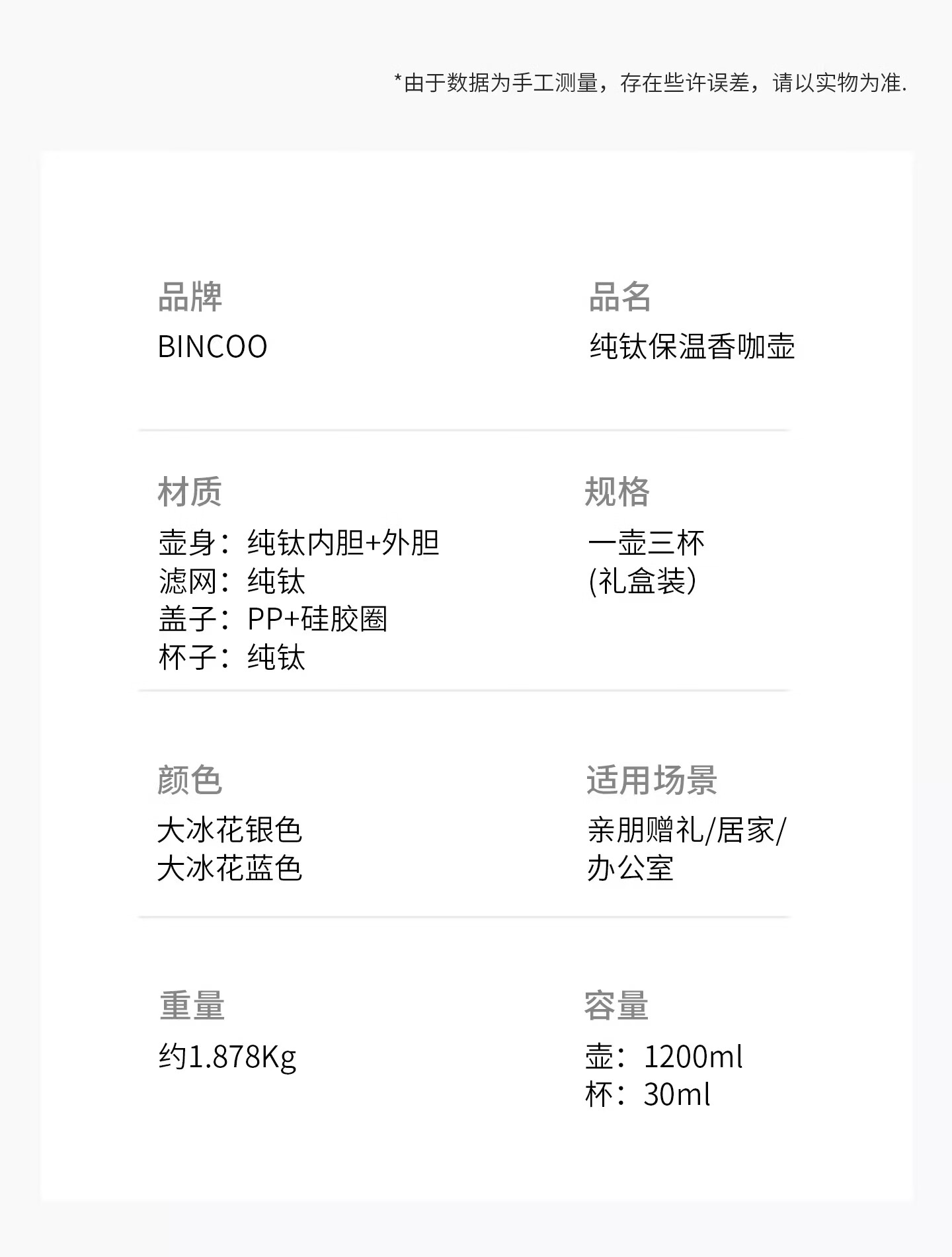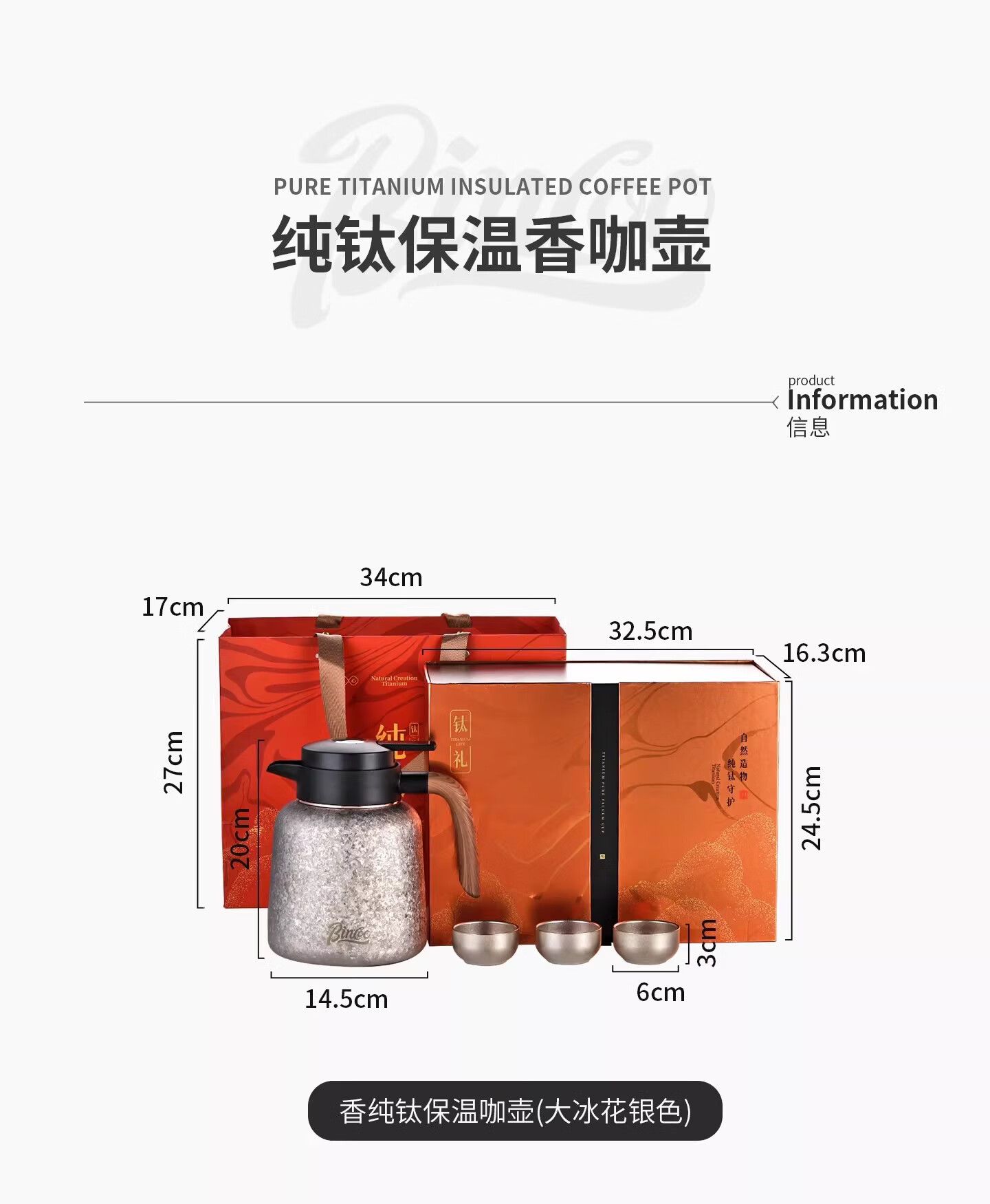 Bincoo纯钛保温壶大容量咖啡壶家用焖茶壶办公室闷泡壶显温热水瓶 冰花银1.2L【一壶三杯礼盒装】