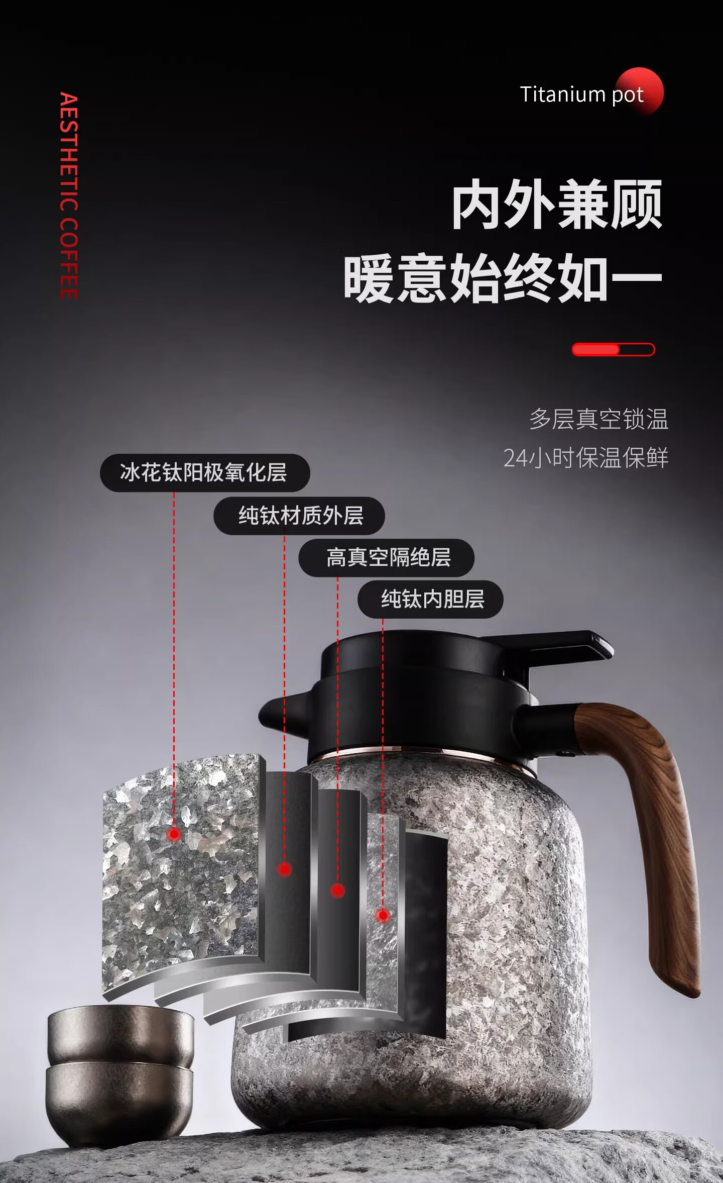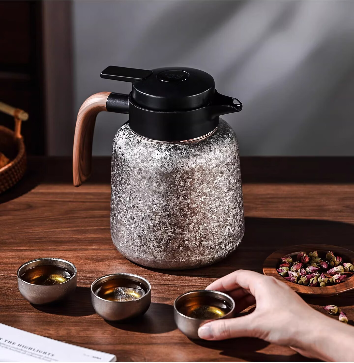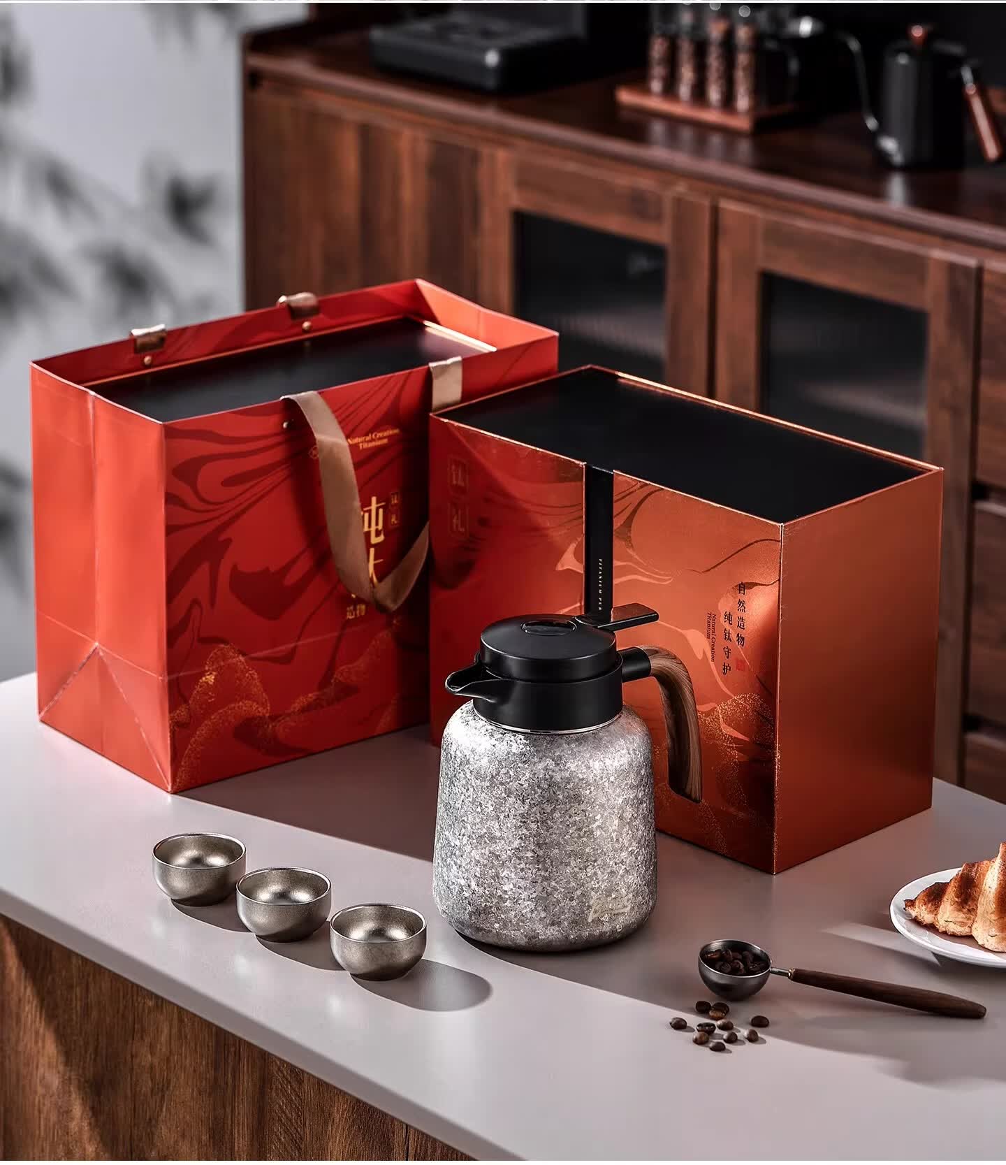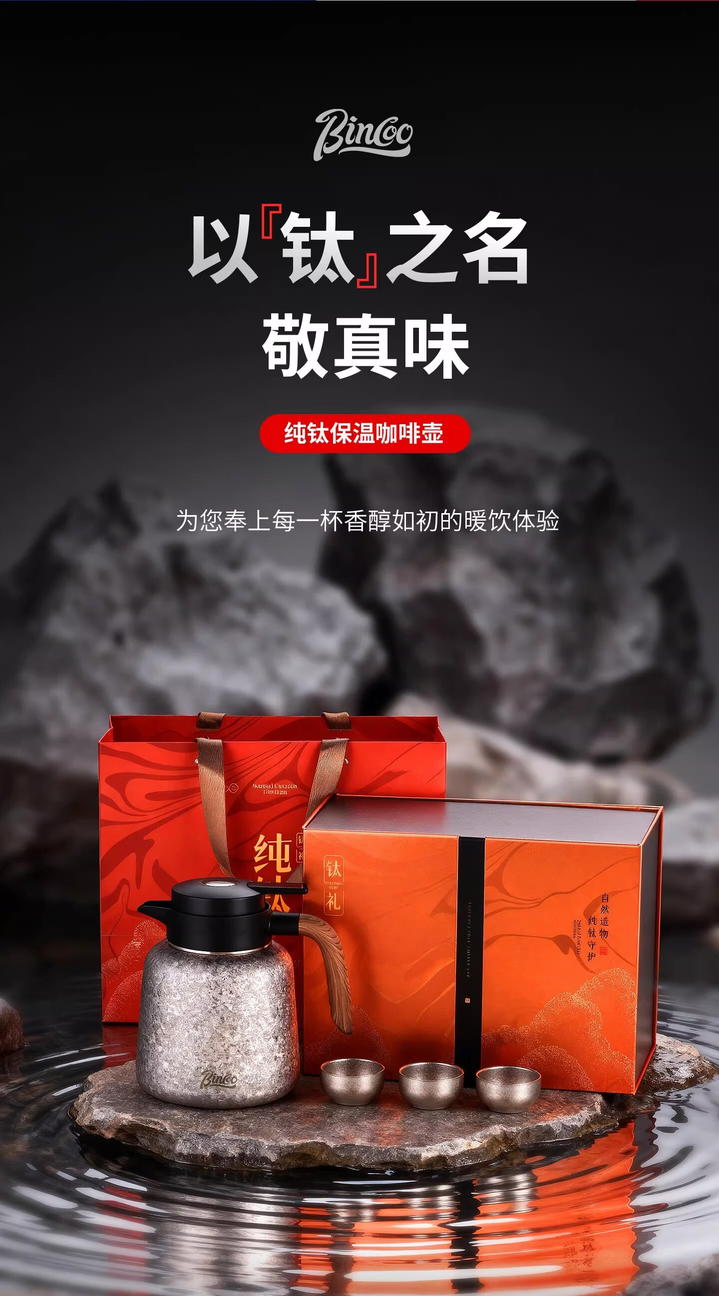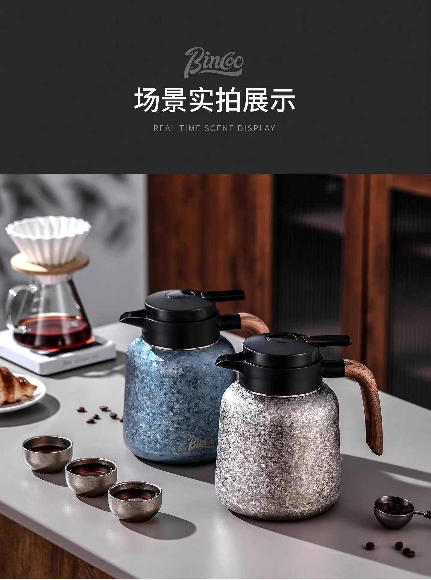 Bincoo纯钛保温壶大容量咖啡壶家用焖茶壶办公室闷泡壶显温热水瓶 冰花银1.2L【一壶三杯礼盒装】