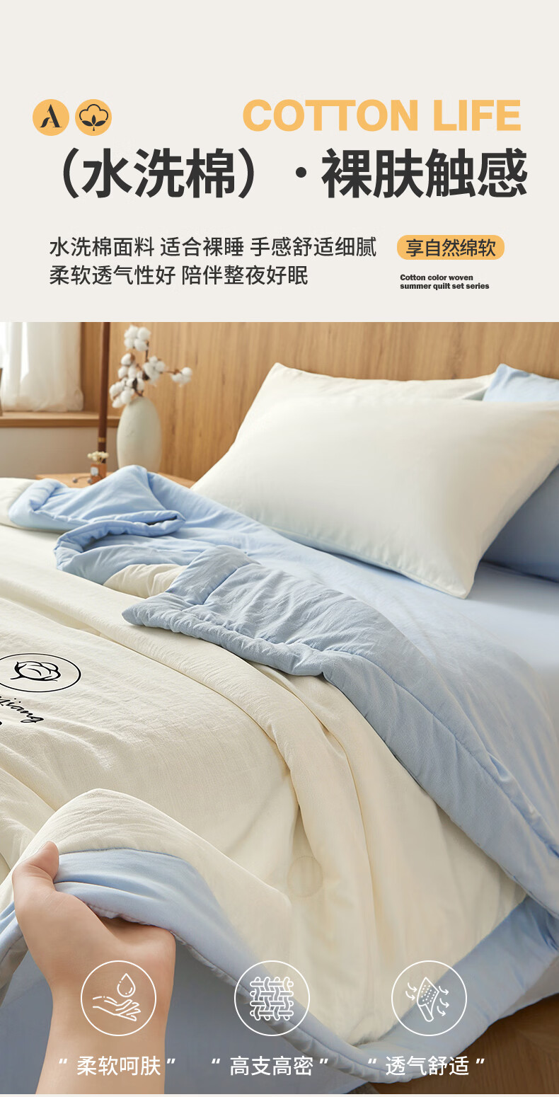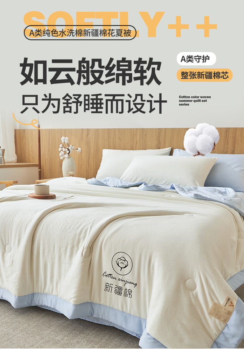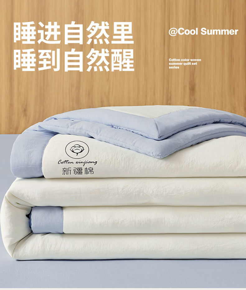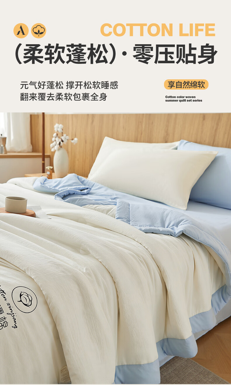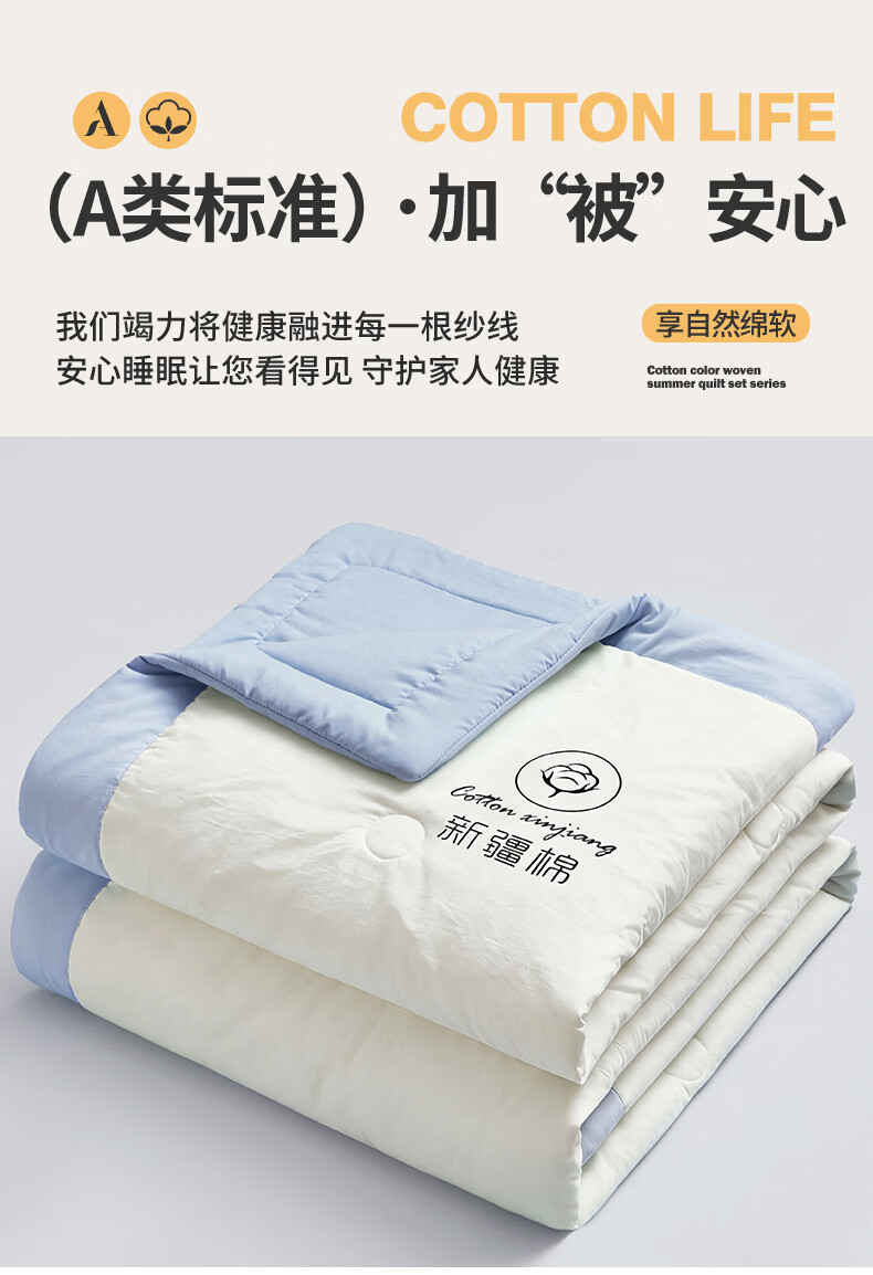 雅鹿A类夏凉被纯棉全棉新疆棉花空调被200x230cm夏季可机洗薄被子被芯 素夏-白蓝 (轻盈柔软 不跑棉不结团) 150x200cm【宿舍被】