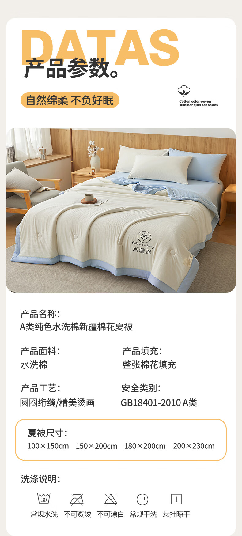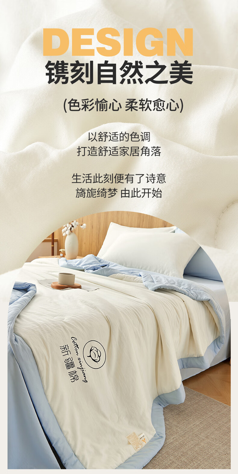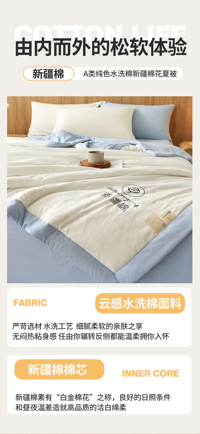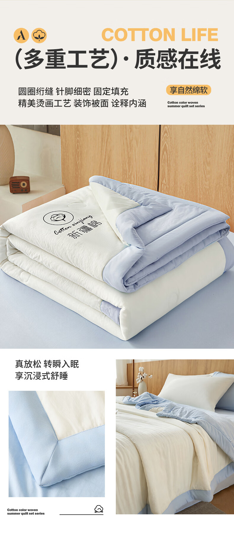 雅鹿A类夏凉被纯棉全棉新疆棉花空调被200x230cm夏季可机洗薄被子被芯 素夏-白蓝 (轻盈柔软 不跑棉不结团) 150x200cm【宿舍被】