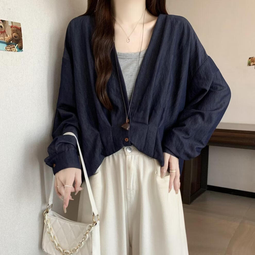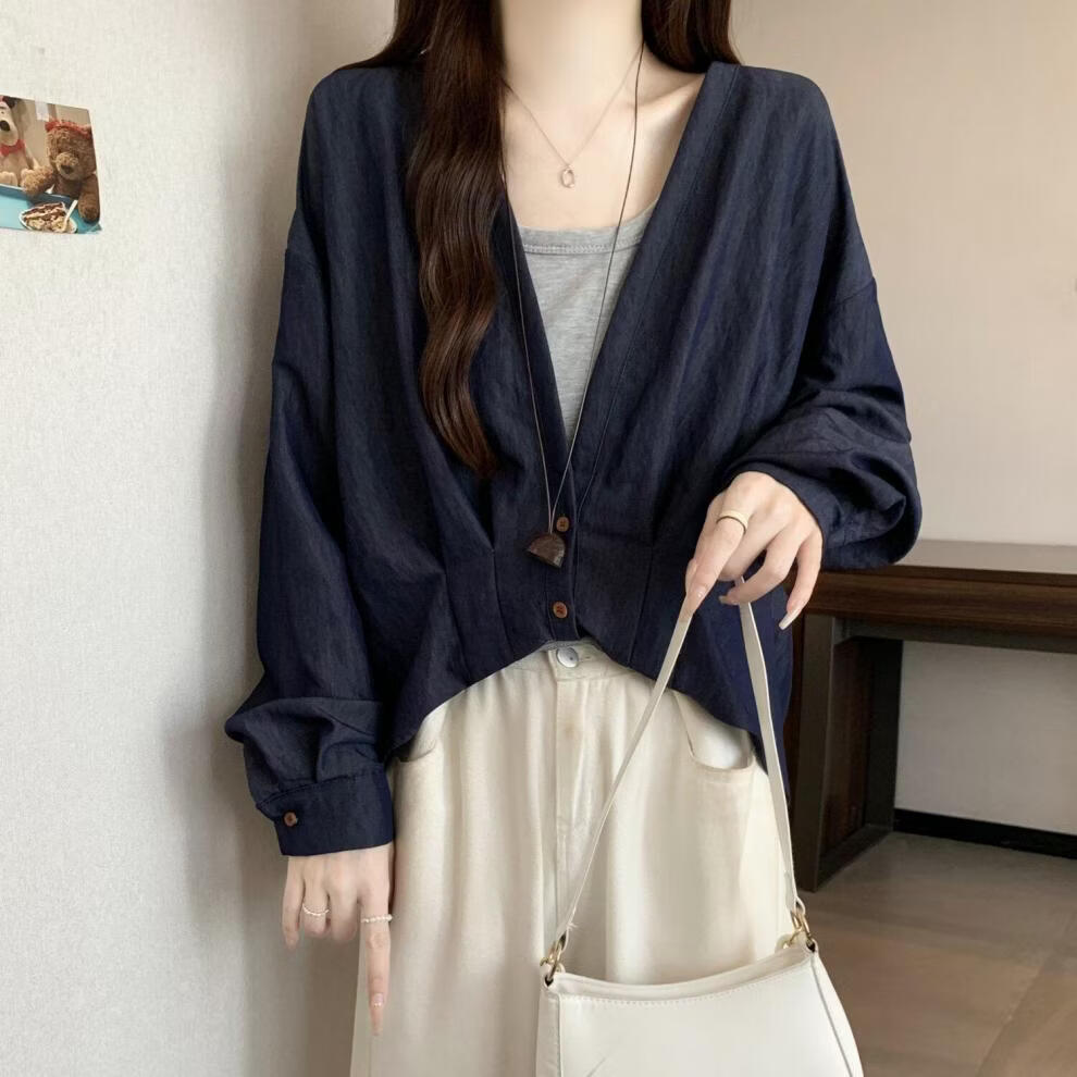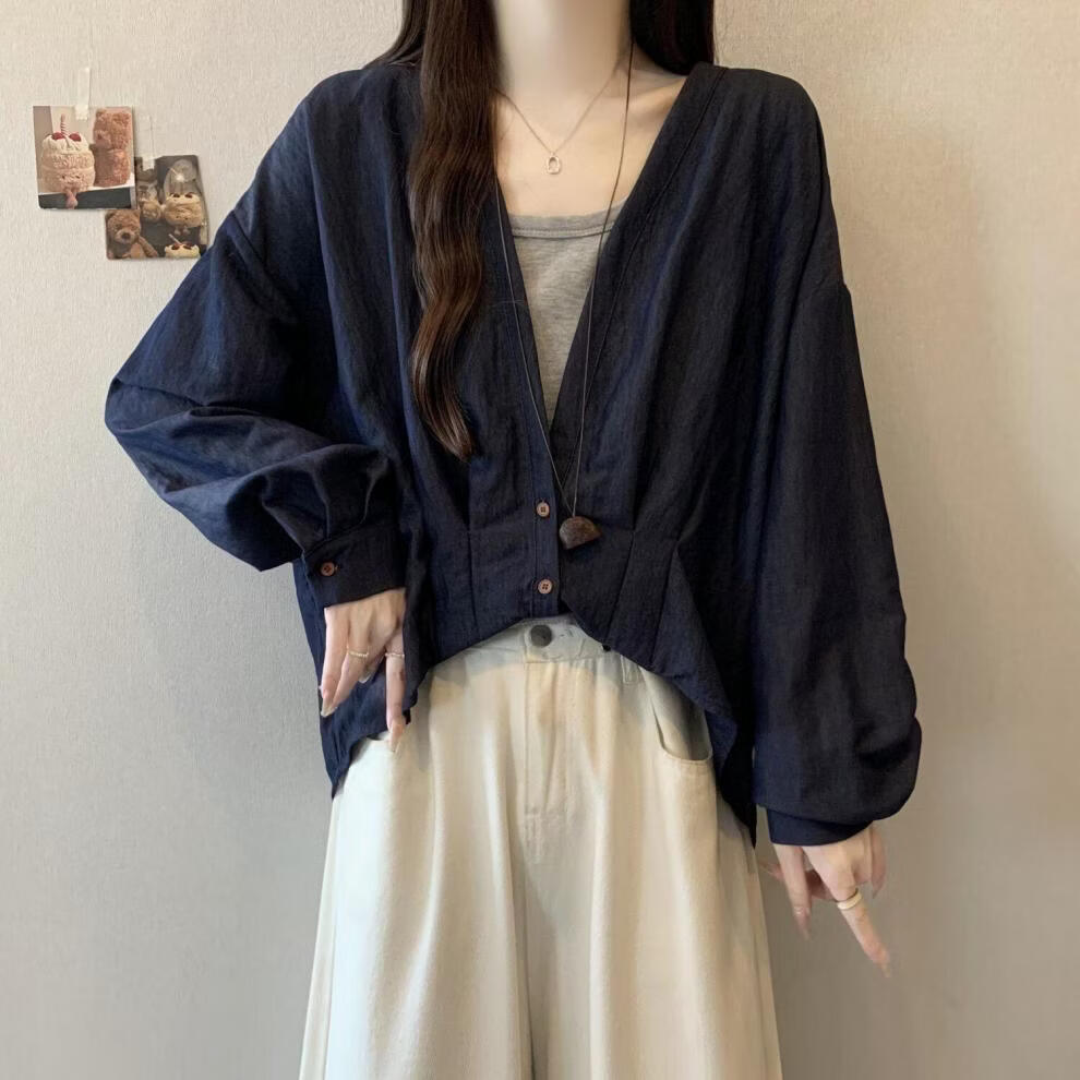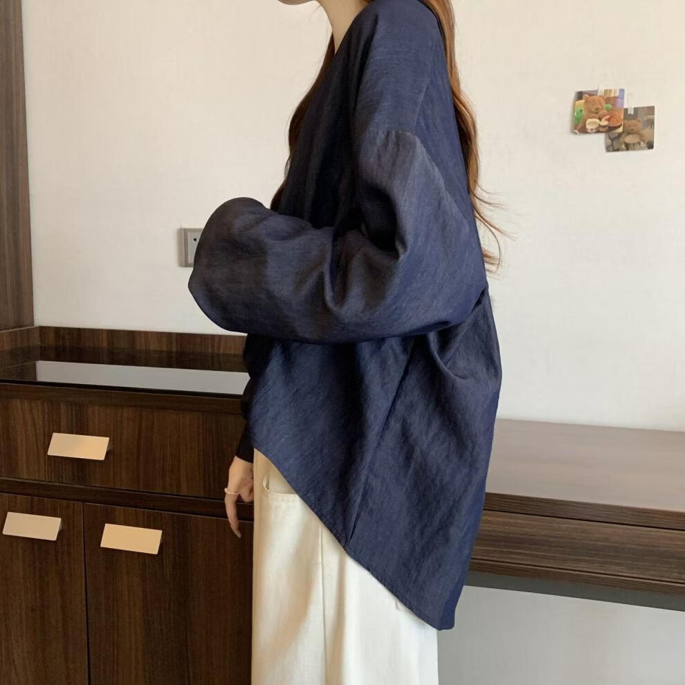 MODX假两件领长袖衬衫女2026早春新款大码胖遮肚设计感不规则上衣 牛仔蓝今年流行/小众/高端轻奢/甜辣/显瘦/遮肚/遮肉/ L