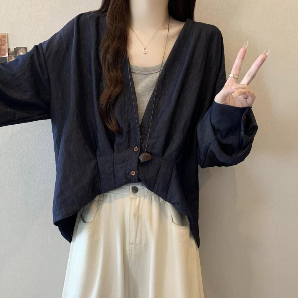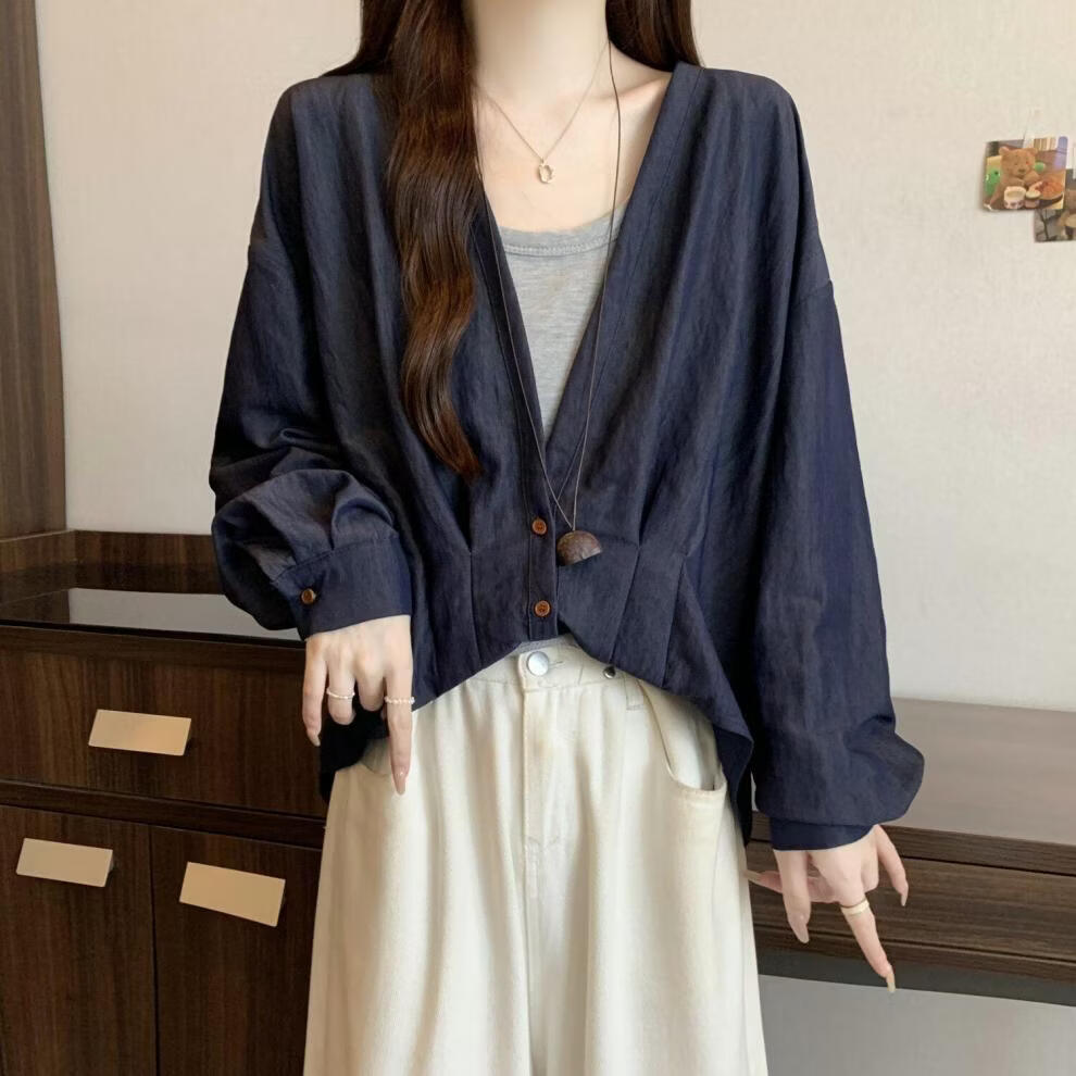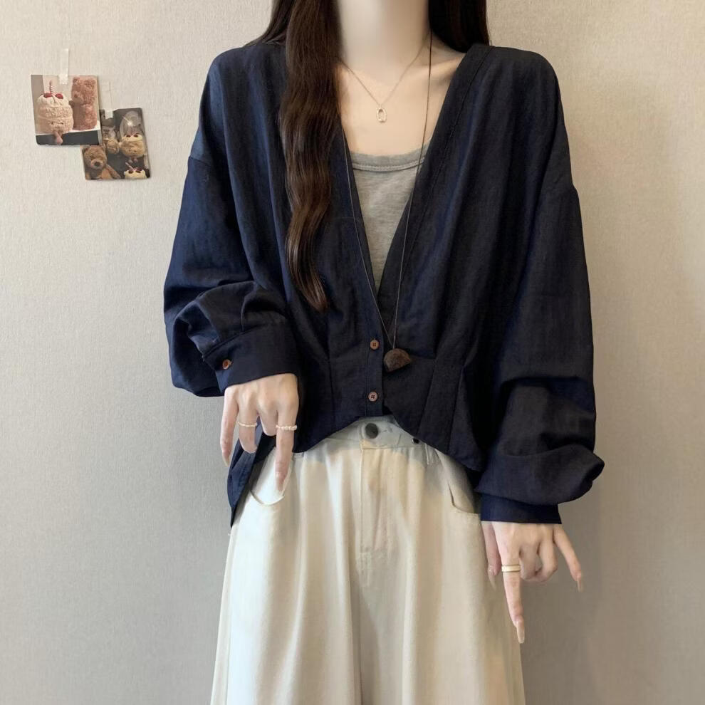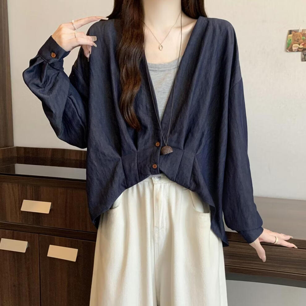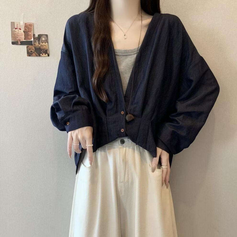 MODX假两件领长袖衬衫女2026早春新款大码胖遮肚设计感不规则上衣 牛仔蓝今年流行/小众/高端轻奢/甜辣/显瘦/遮肚/遮肉/ L