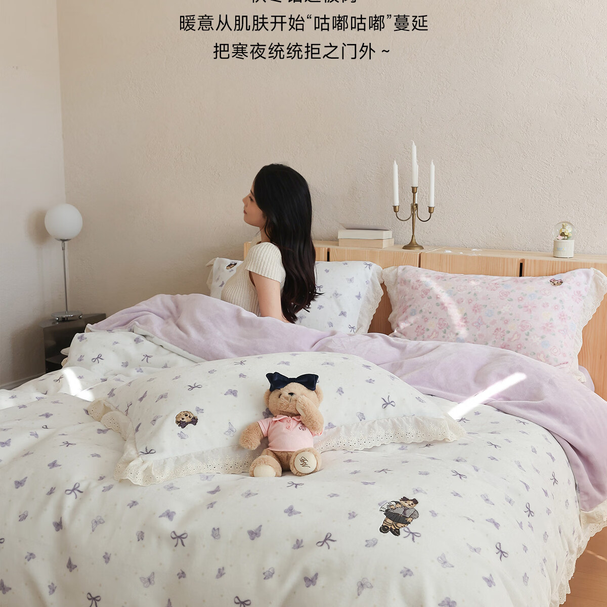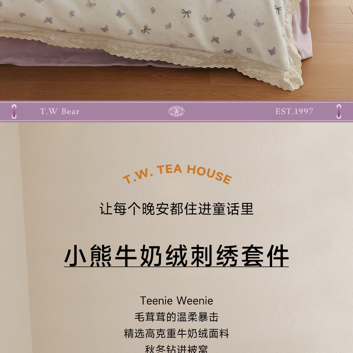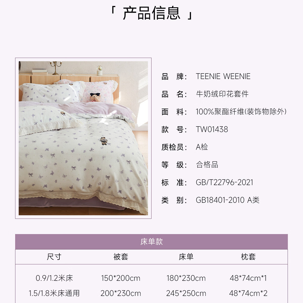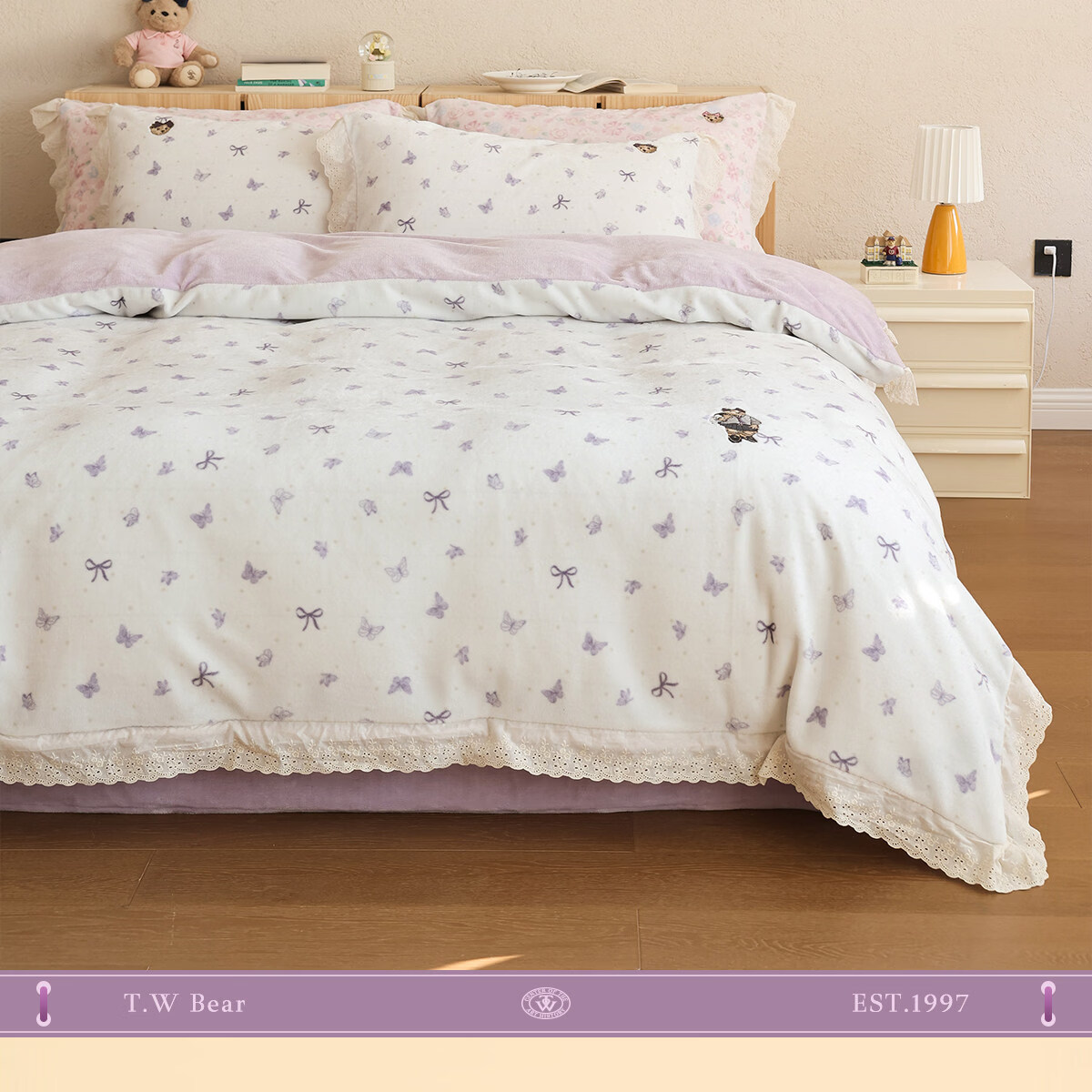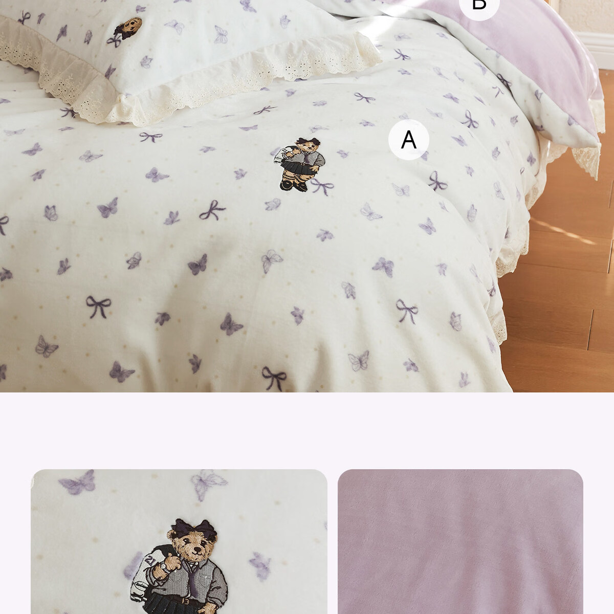 Teenie Weenie小熊A类少女粉碎花牛奶绒保暖四件套法式蕾丝花边被套加厚三件套 小熊慕斯系列-花粉 0.9/1.2m 床单款 被套150*200cm 三件套