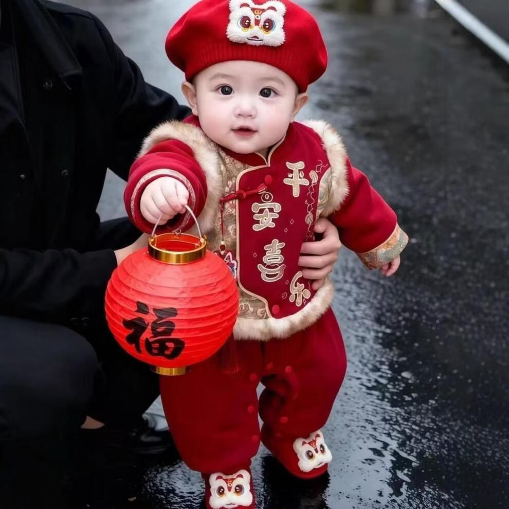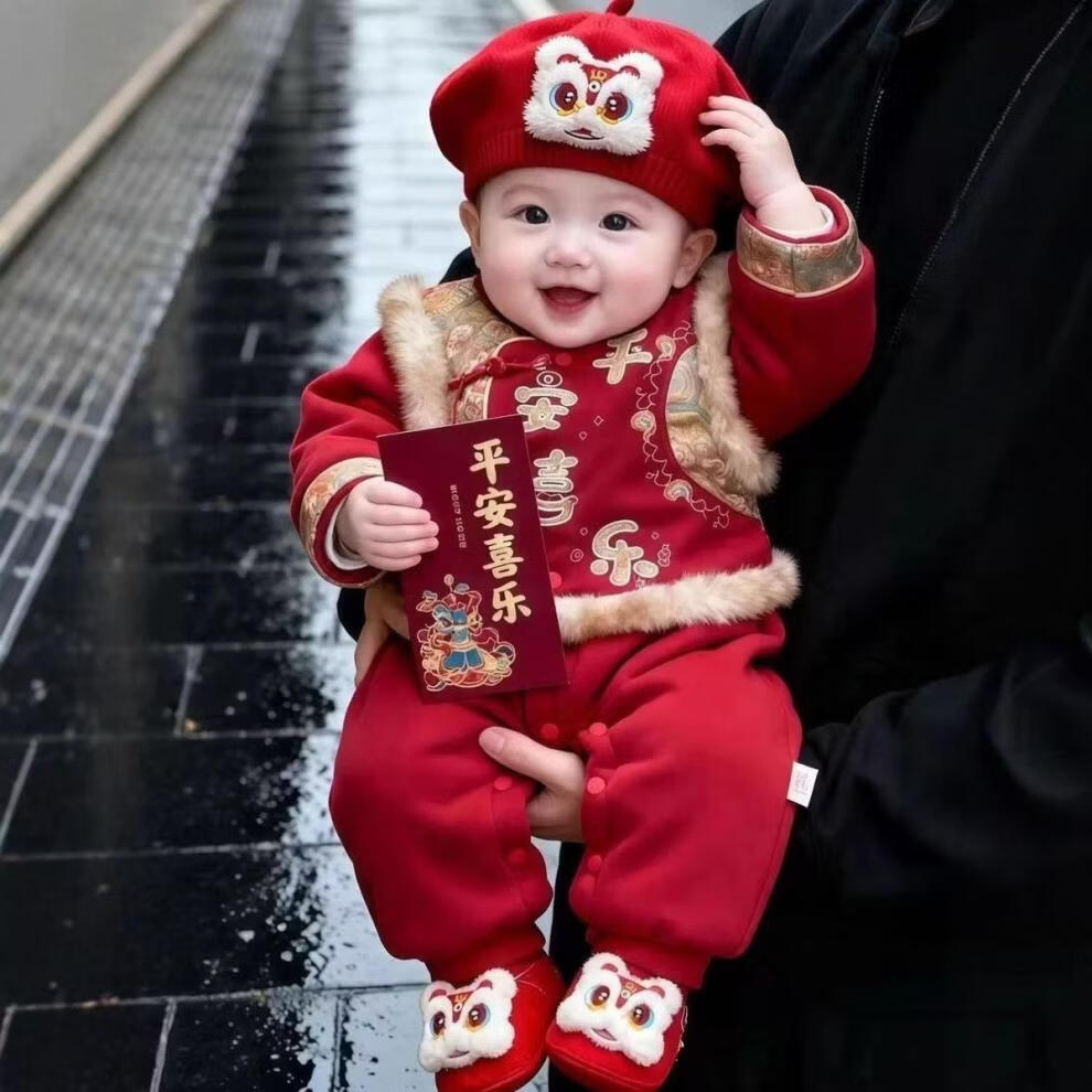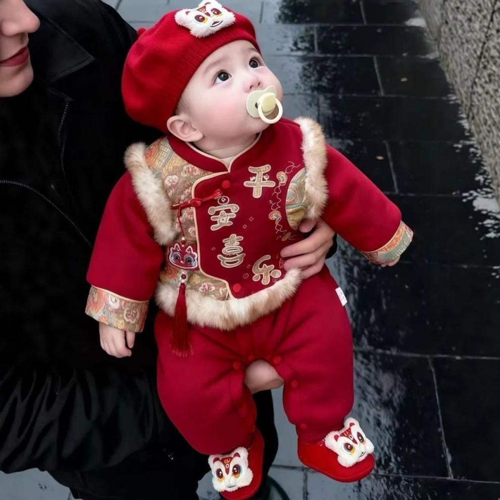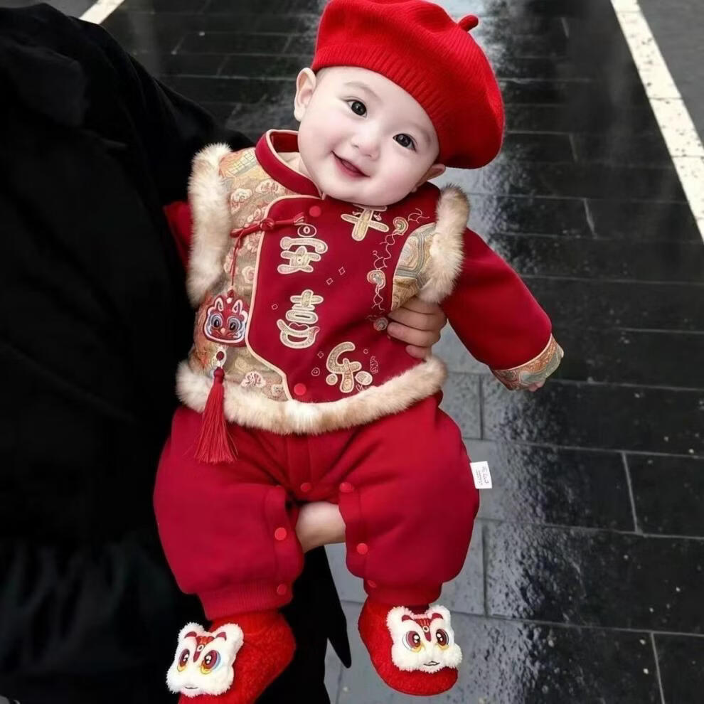 G.duck冬季婴儿衣服喜庆中式拜年服加厚连体衣周岁百天哈衣宝宝过年连体 红色【红锦平安加棉加厚】两件套 66cm