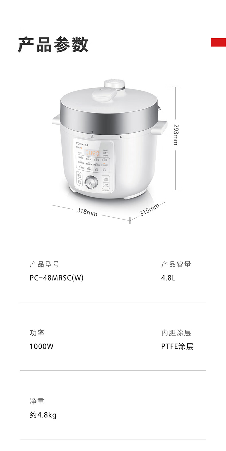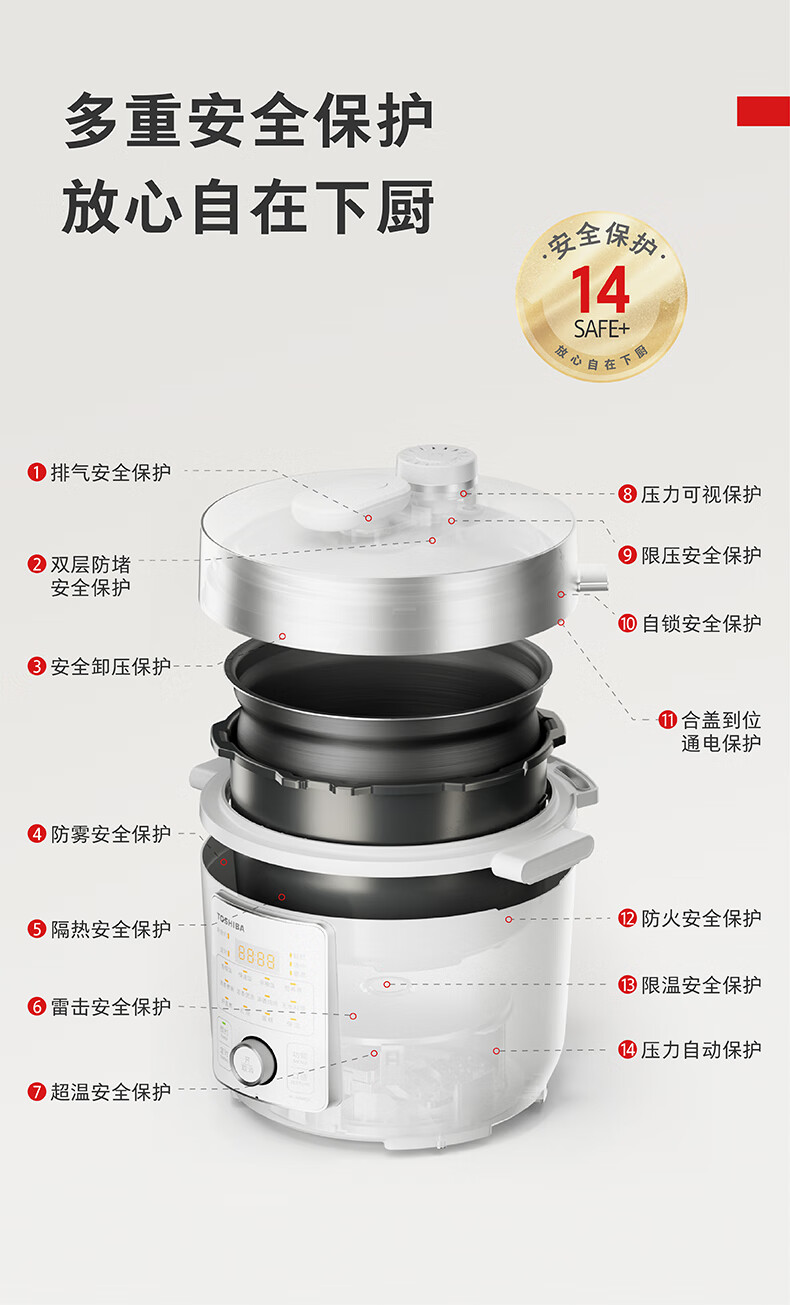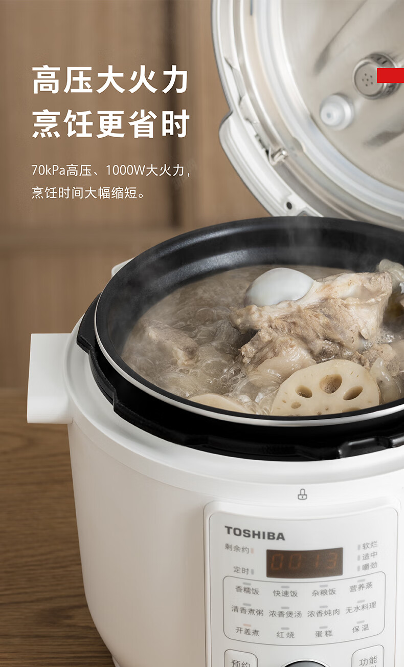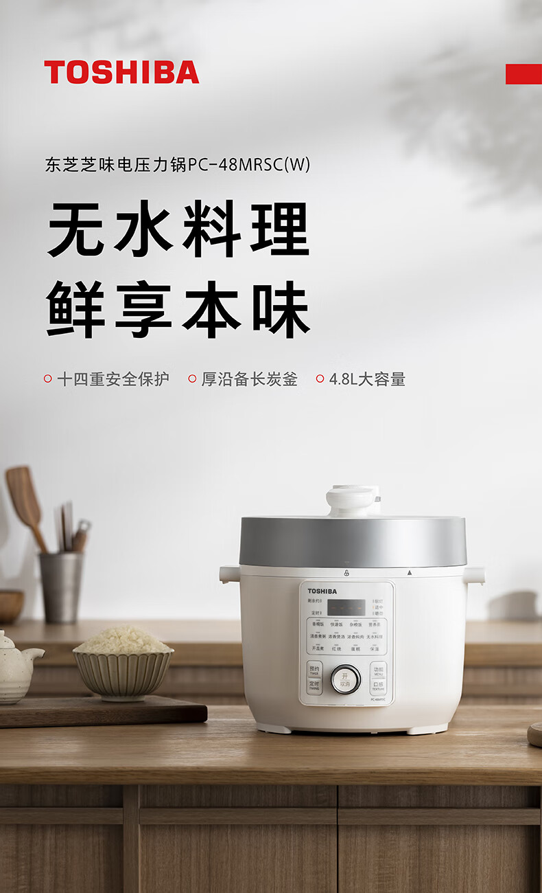 东芝(TOSHIBA)304不锈钢0涂层芝味2-4人家用多功能迷你中高压锅智能预约电饭煲14重安全保护 大容量 双内胆 4.8L PC-48MRSC(W)