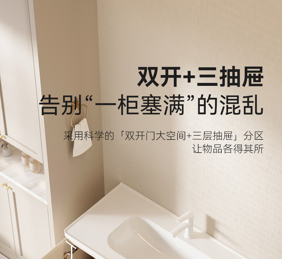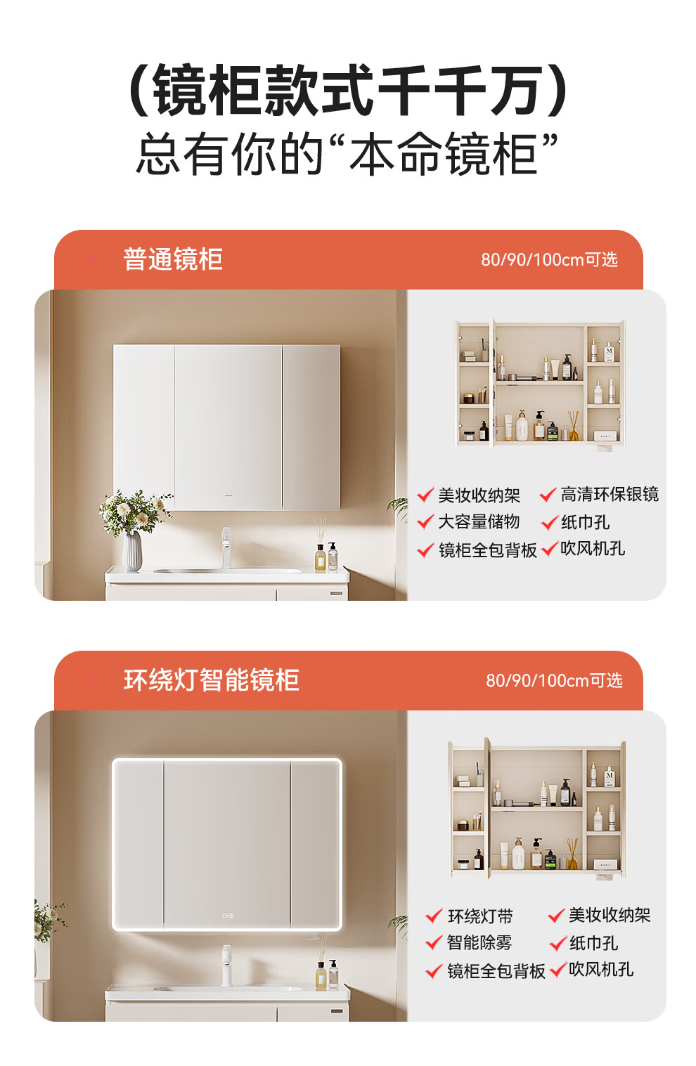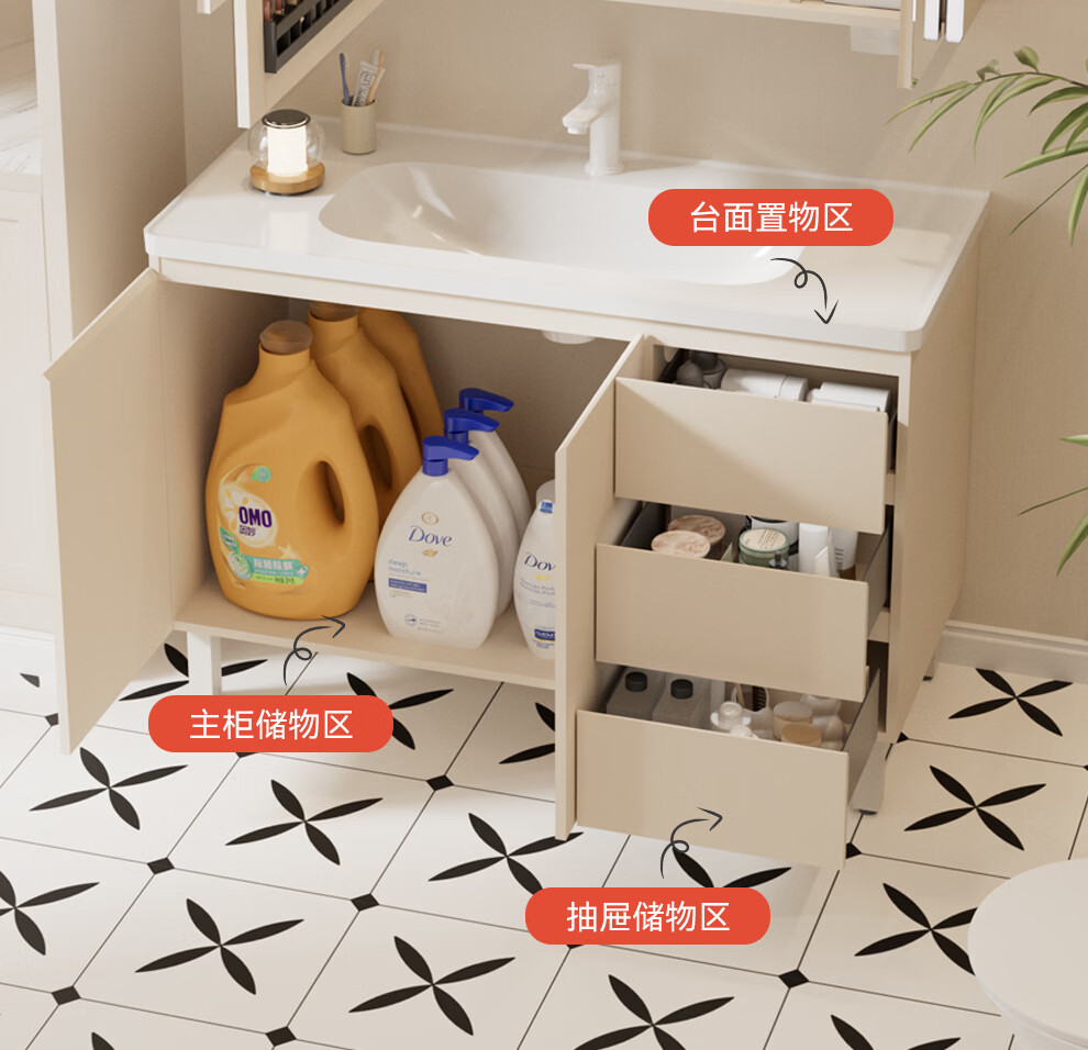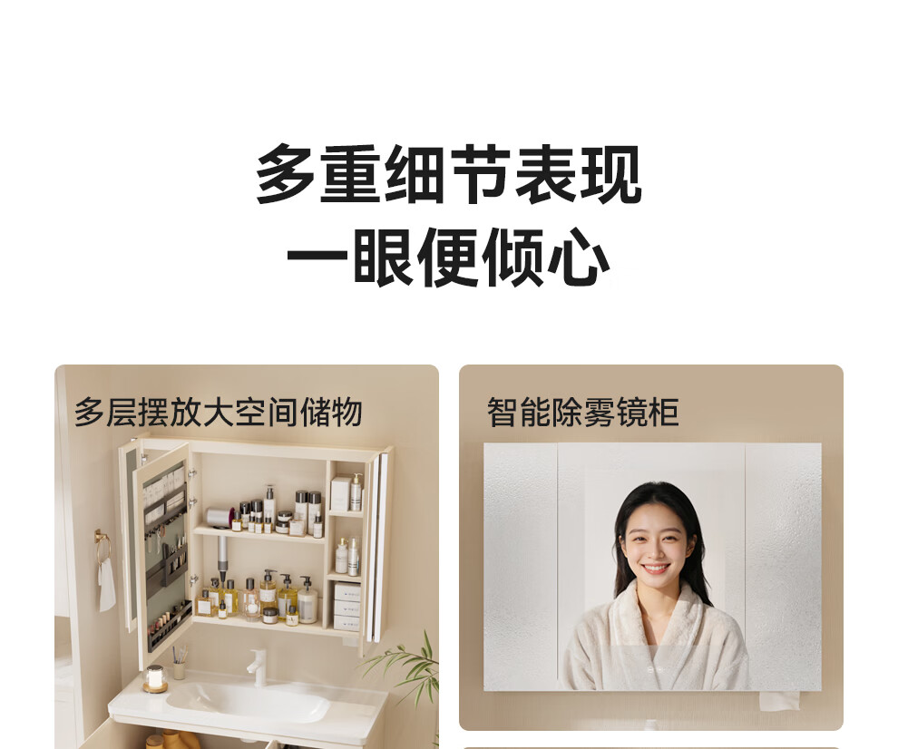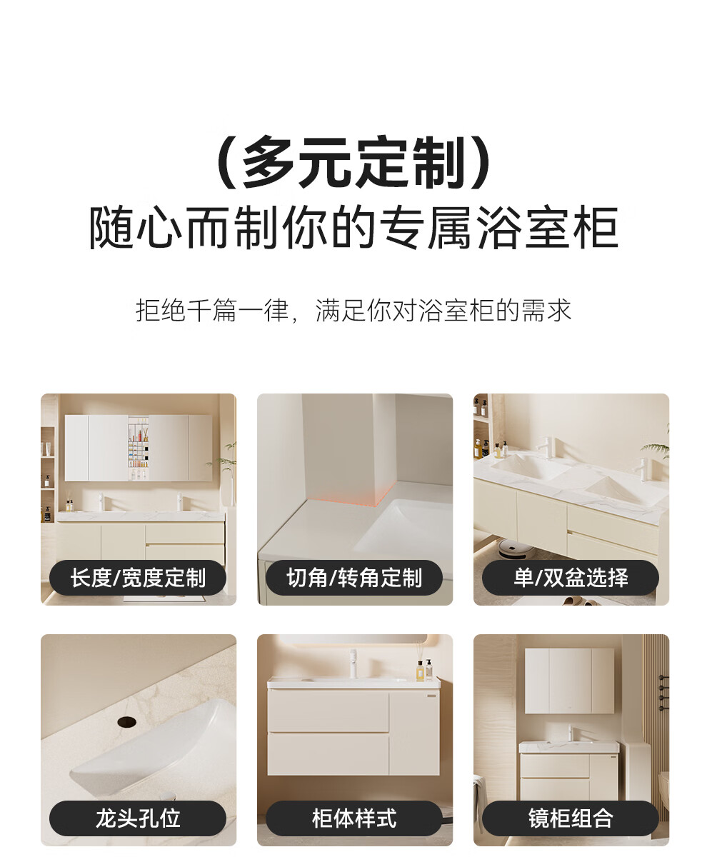 浪鲸(SSWW)卫浴新款奶油风浴室柜陶瓷一体盆多层实木落地智能浴柜可定制0410 环绕灯智能镜柜丨美妆架+除雾+陶瓷盆-80cm 不含龙头