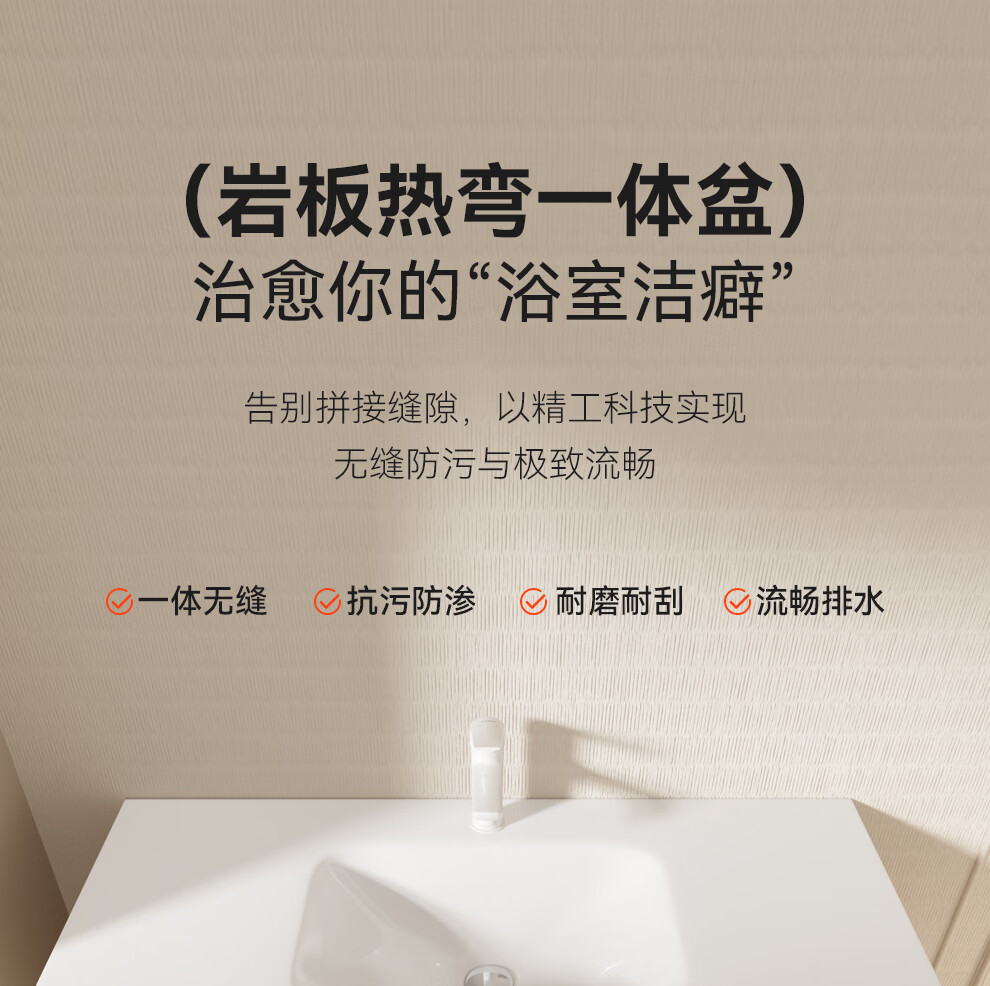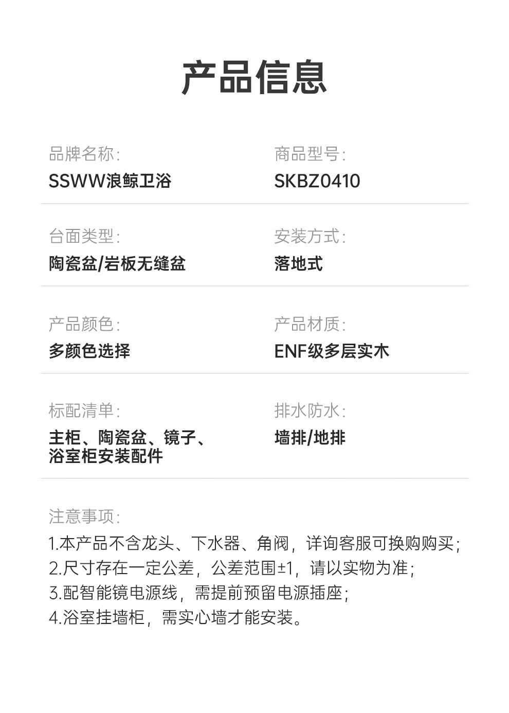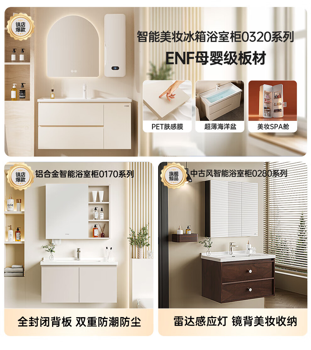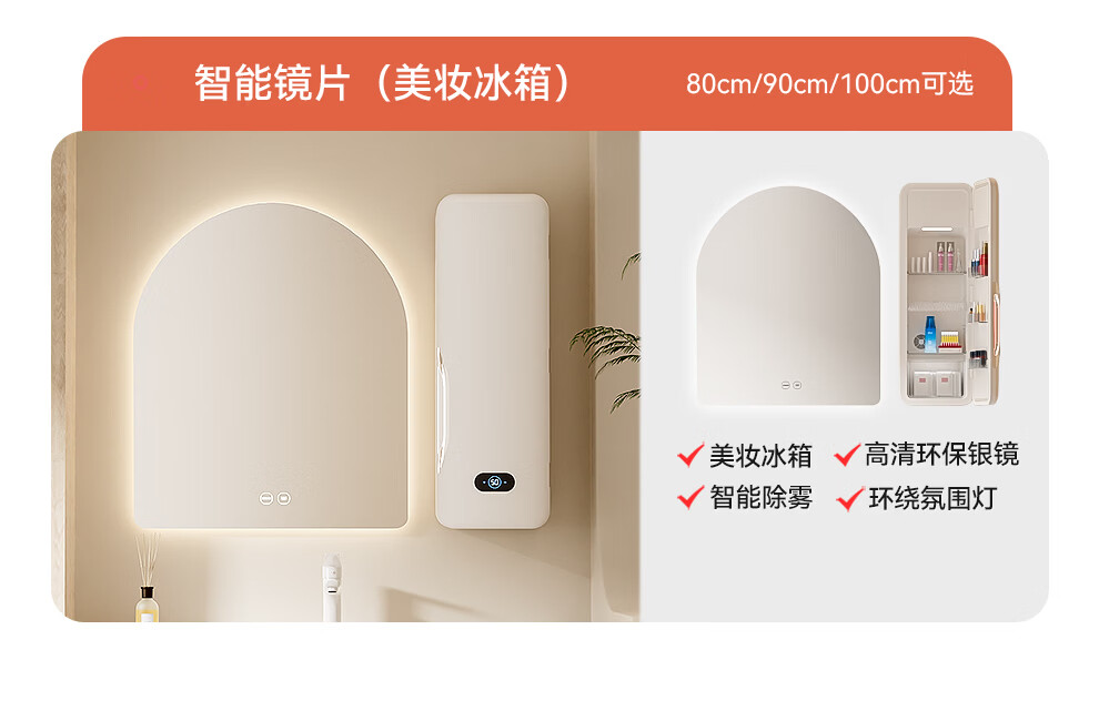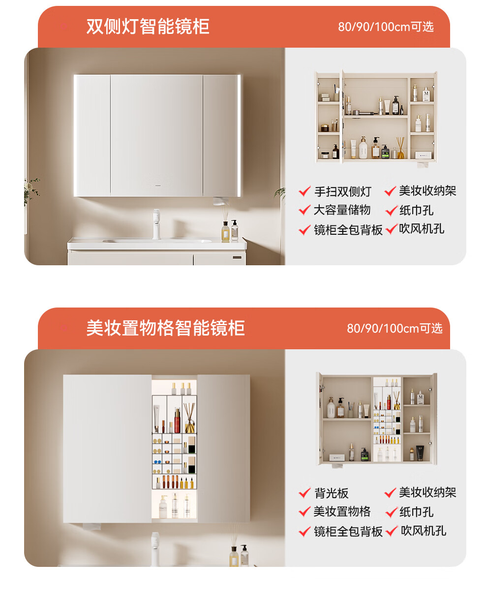 浪鲸(SSWW)卫浴新款奶油风浴室柜陶瓷一体盆多层实木落地智能浴柜可定制0410 环绕灯智能镜柜丨美妆架+除雾+陶瓷盆-80cm 不含龙头