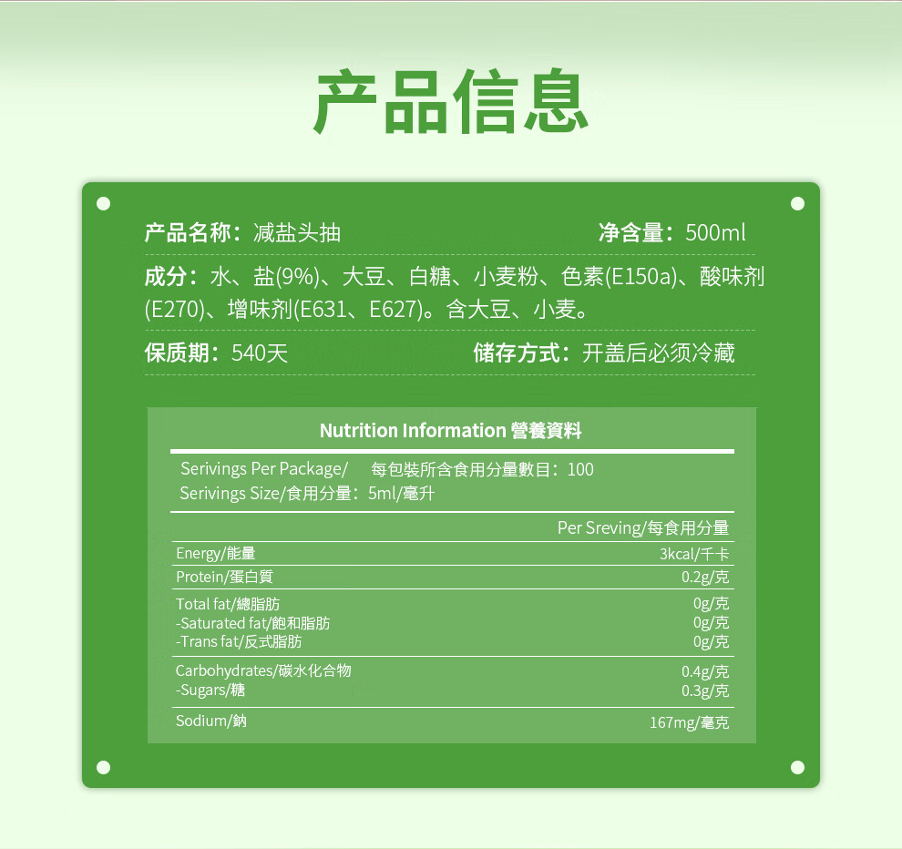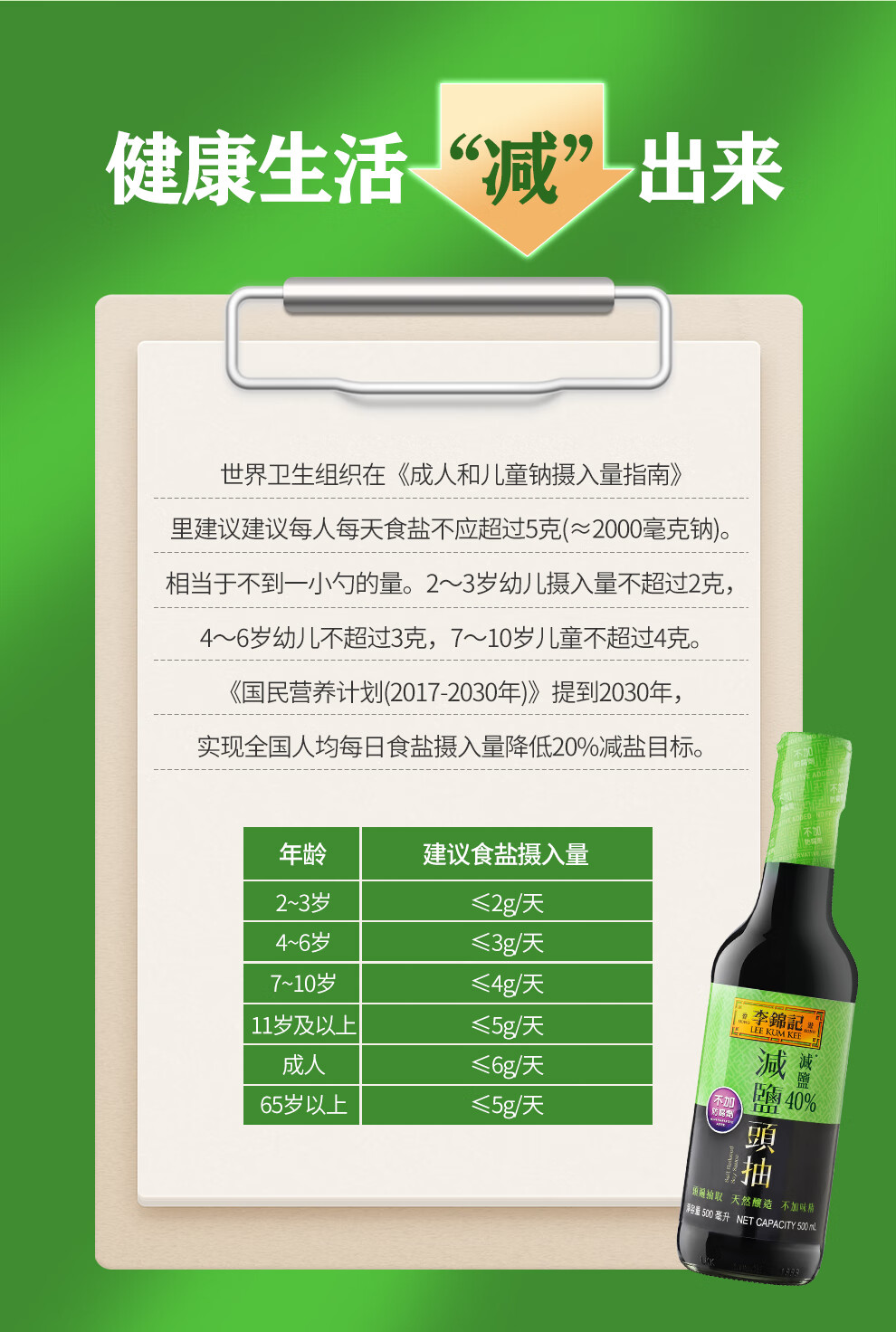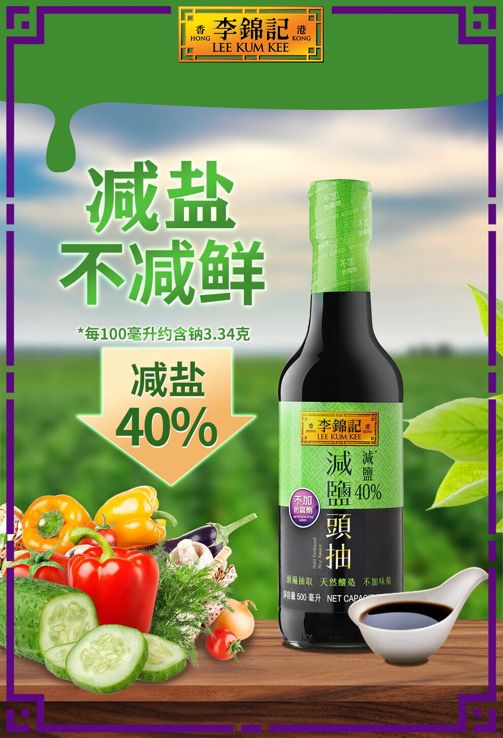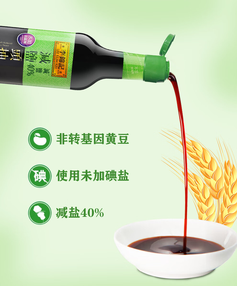 李锦记(LEE KUM KEE)减盐头抽500ml 0添加防腐剂特色酱油家用生抽调味未添加碘盐 减盐头抽500ml