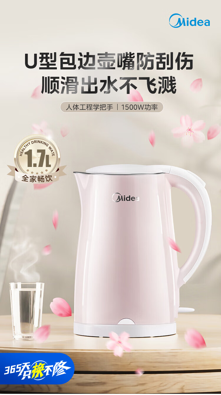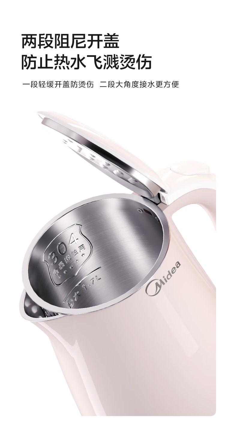 美的(Midea)电热水壶烧水壶养生双层防烫0涂层 食品级304不锈钢1500W快速沸腾1.7L大容量泡茶 HJ1705