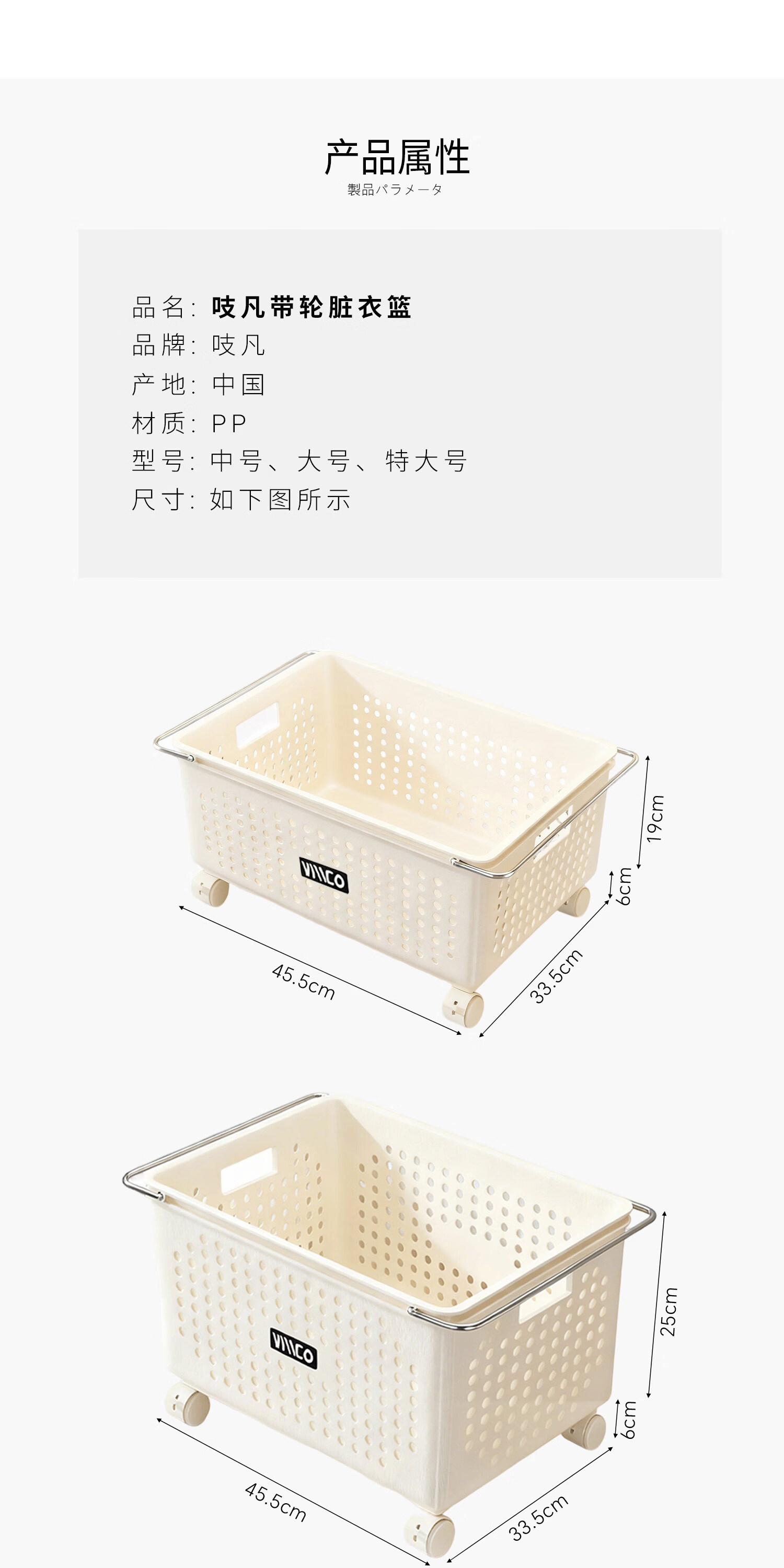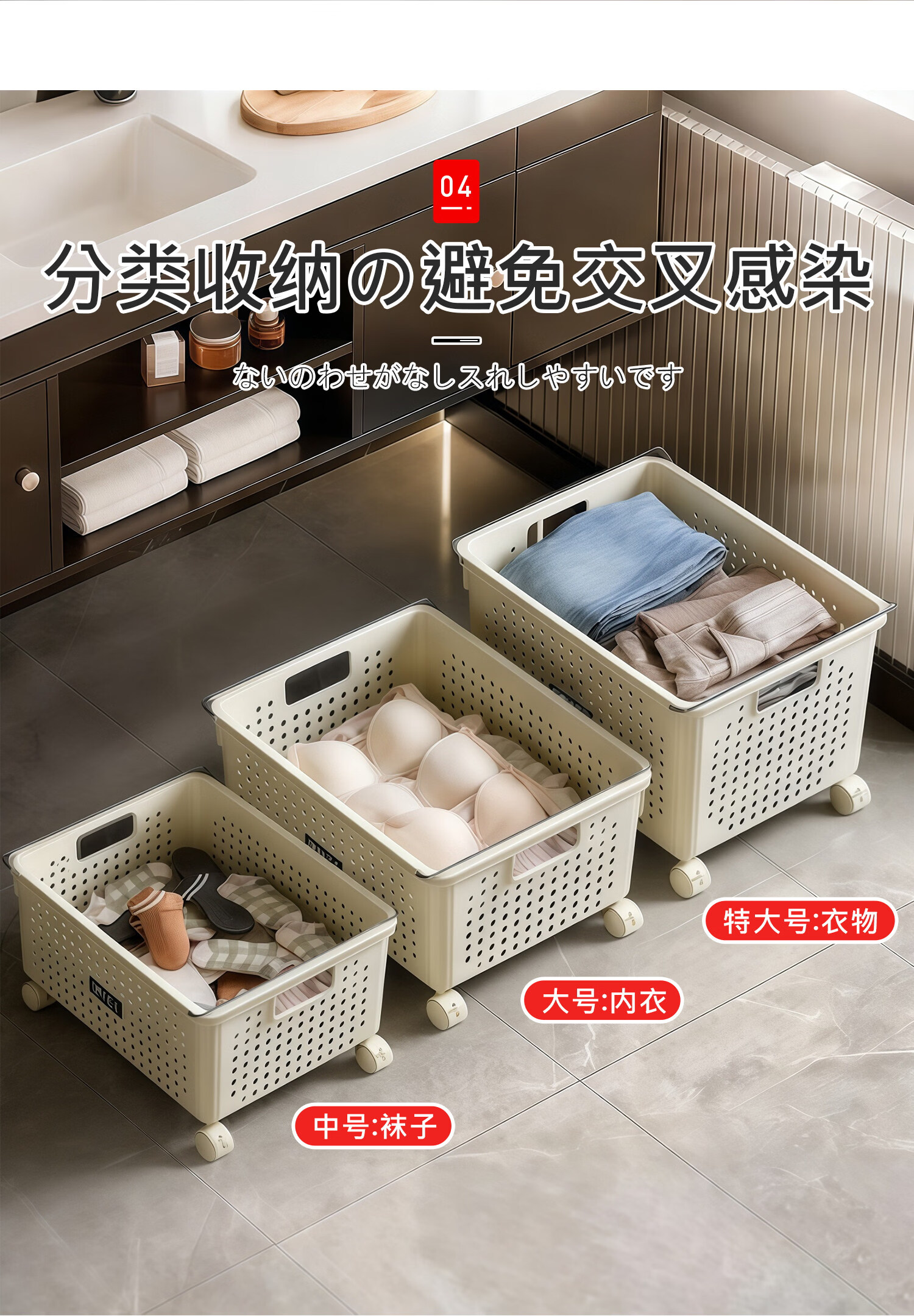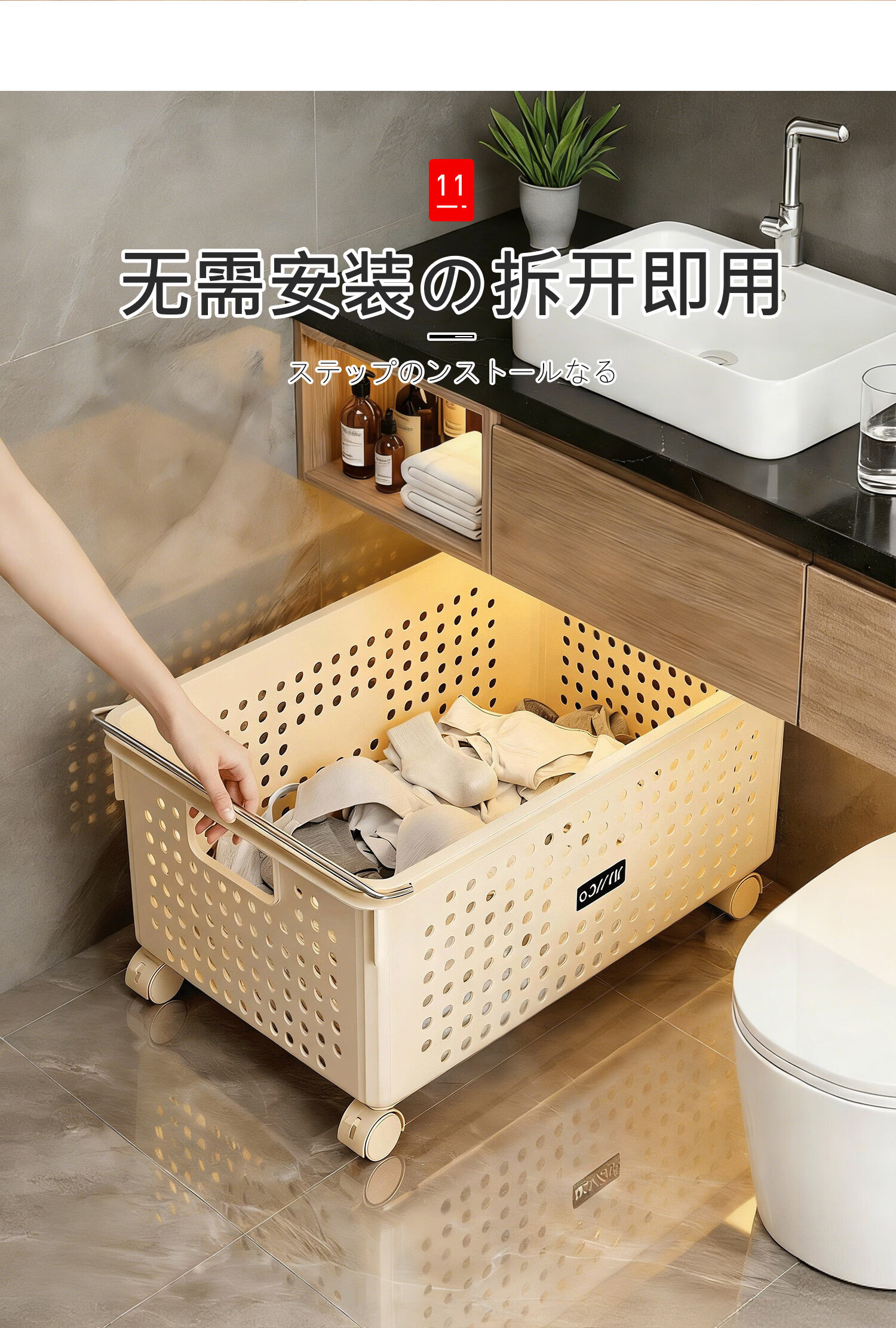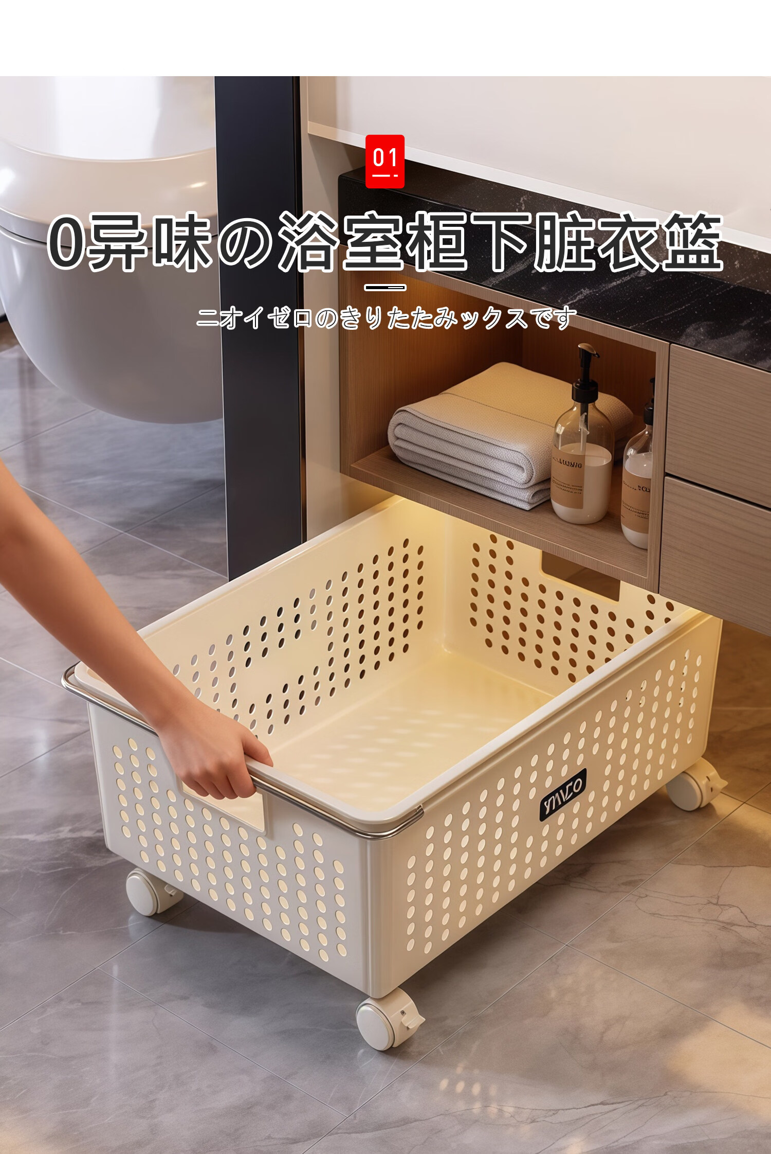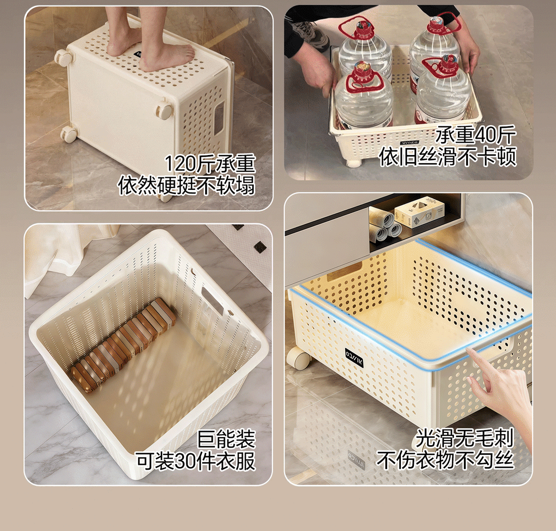 吱凡日本浴室柜下脏衣篓家用脏衣服收纳篮带轮推车杂物洗衣篮储物筐子 特大号脏衣篮【加厚升级】