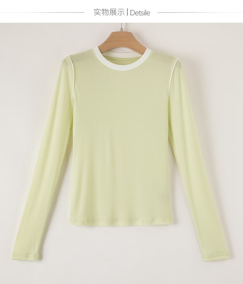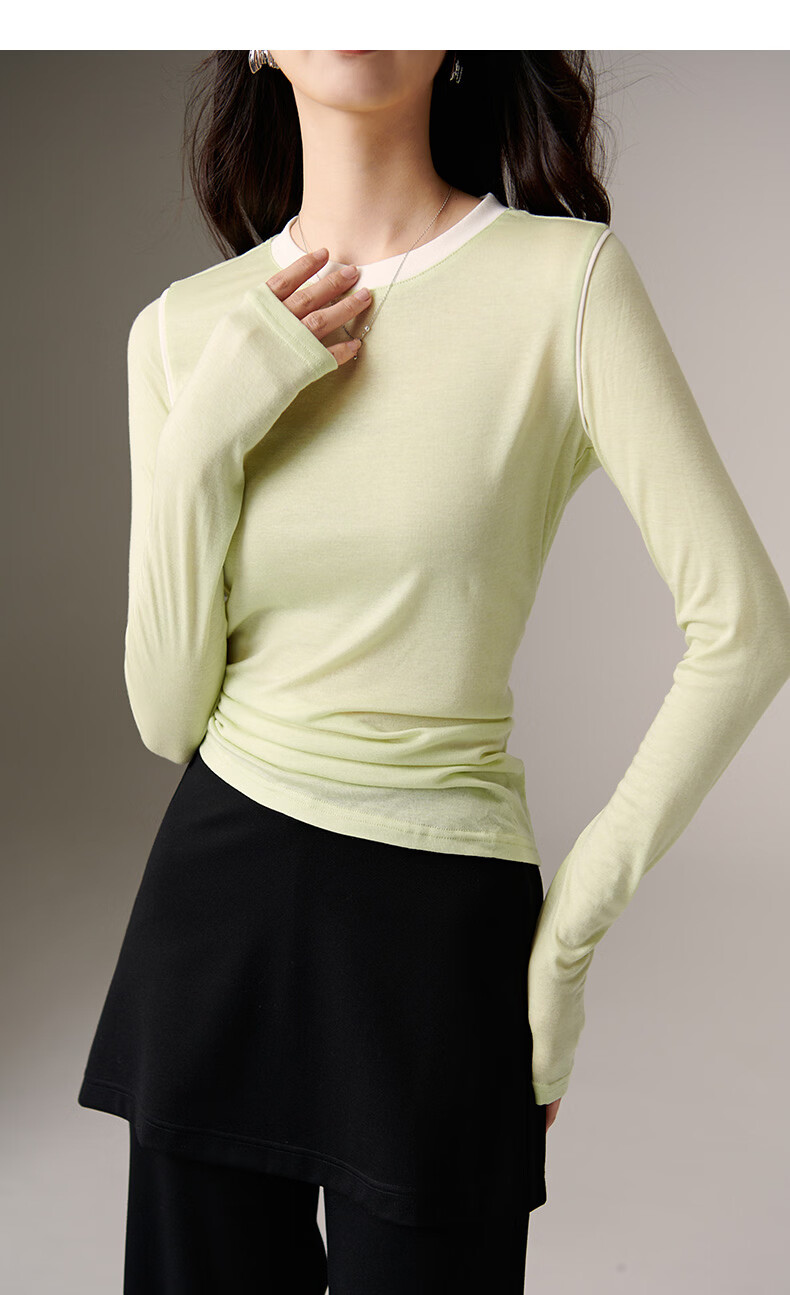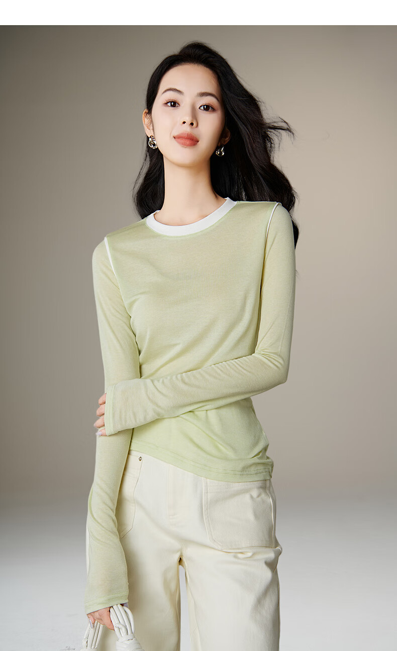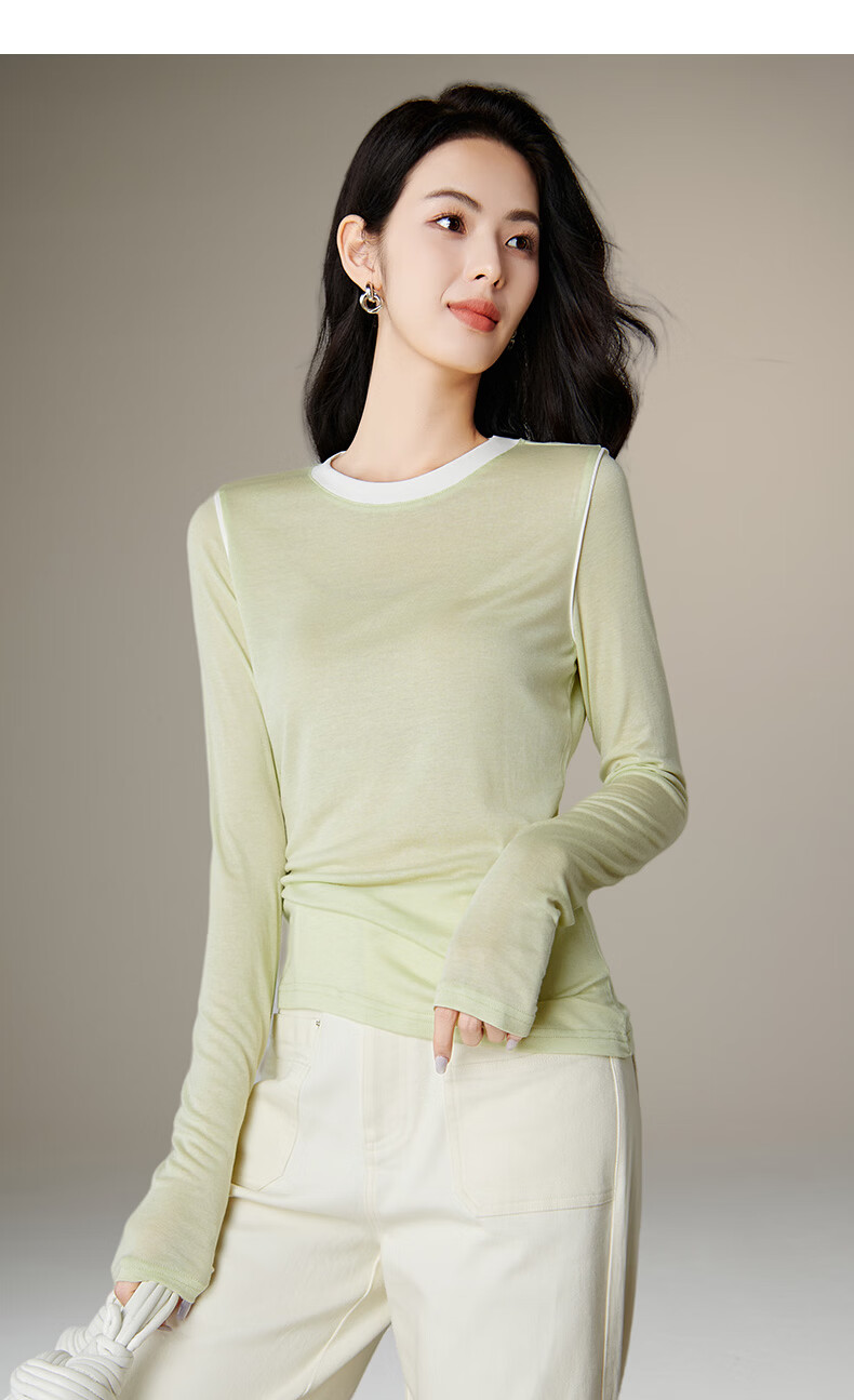 晚白【新品】2026年春款时尚撞色清新休闲上衣莱赛尔亲肤舒适T恤衫女 淡绿色 XL