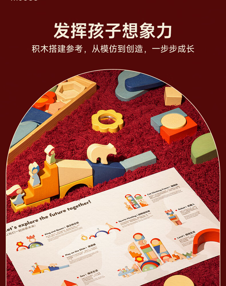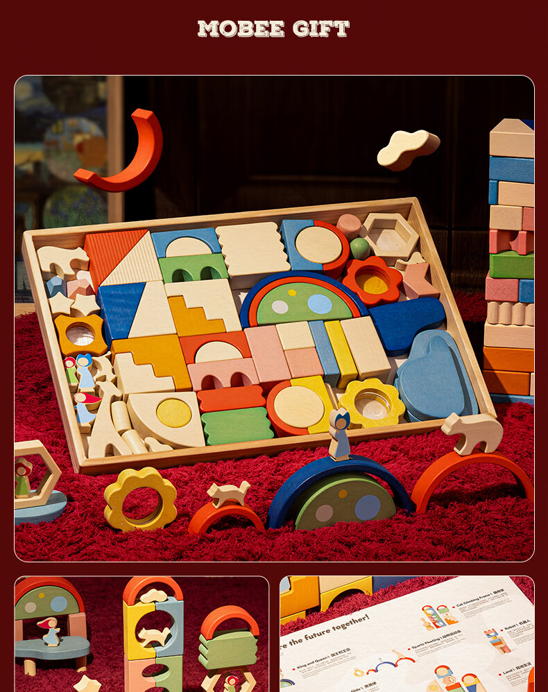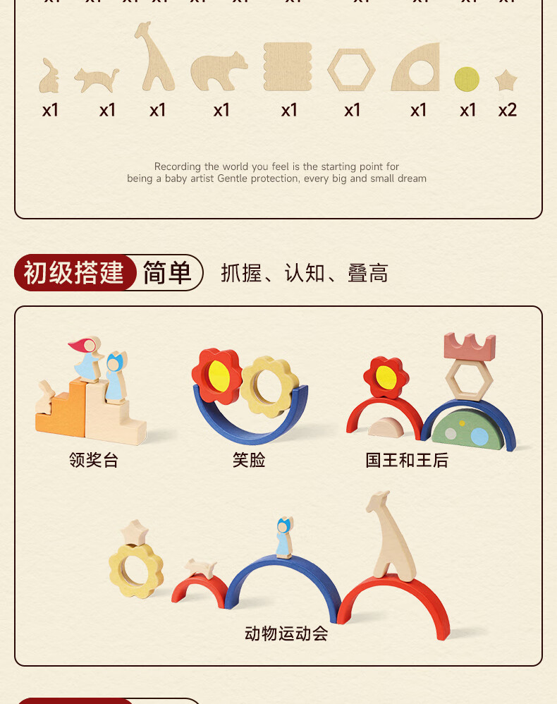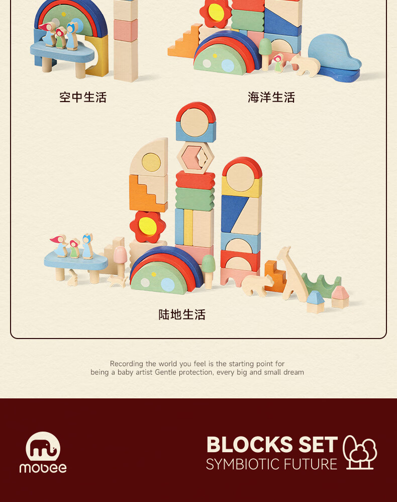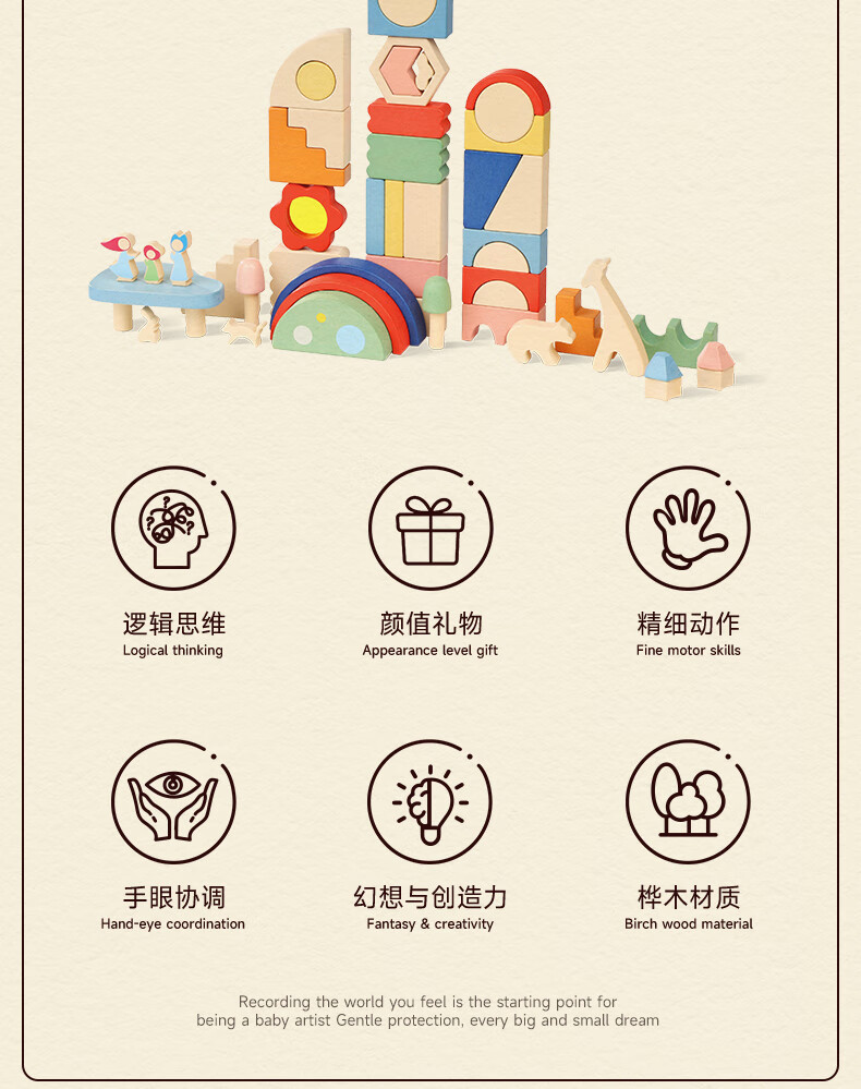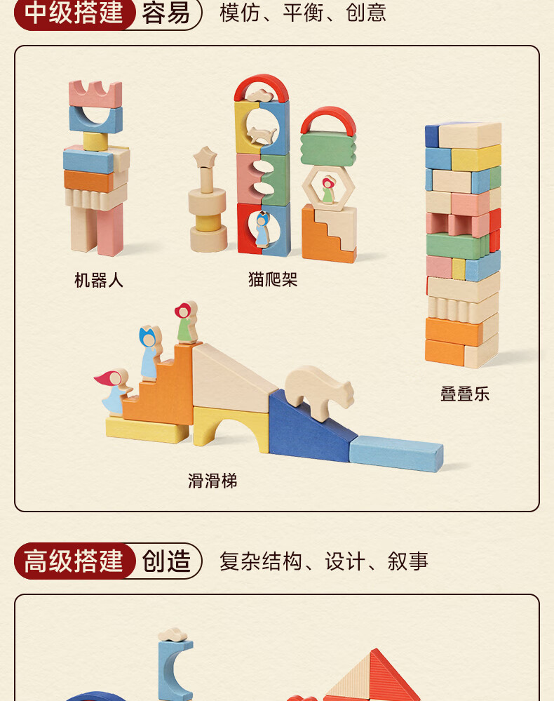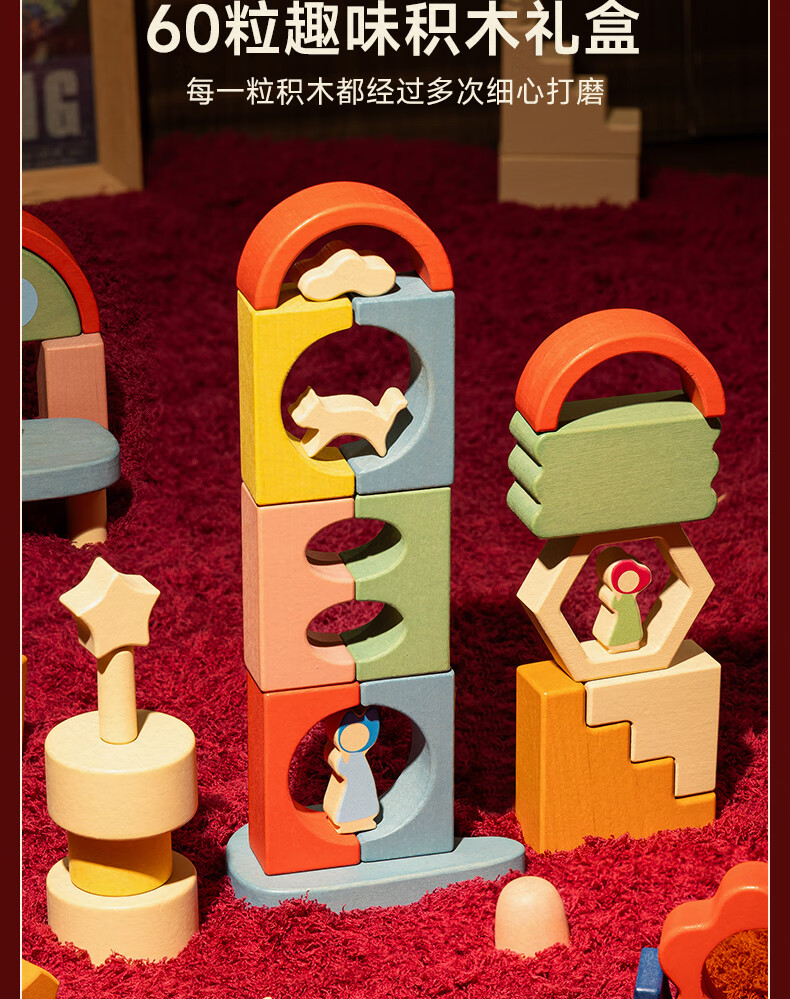 mobee木质儿童益智大颗粒3-6岁拼搭积木60粒宝贝玩具礼物周岁生日新年 巨石小镇叠叠乐积木【42pcs】