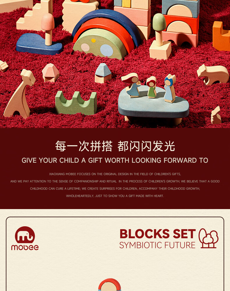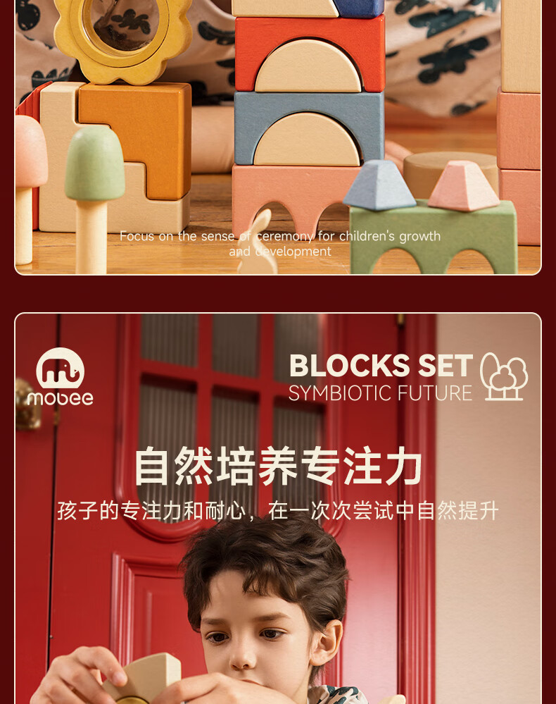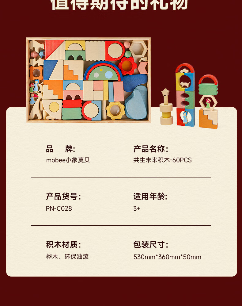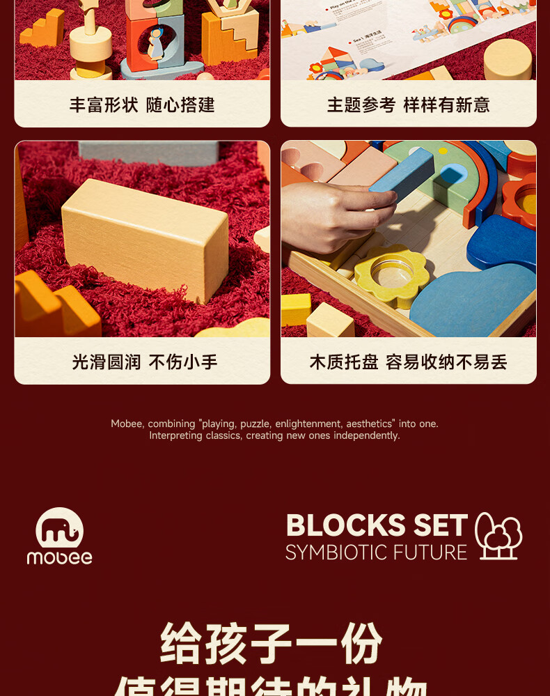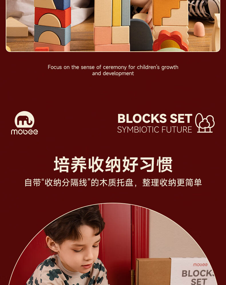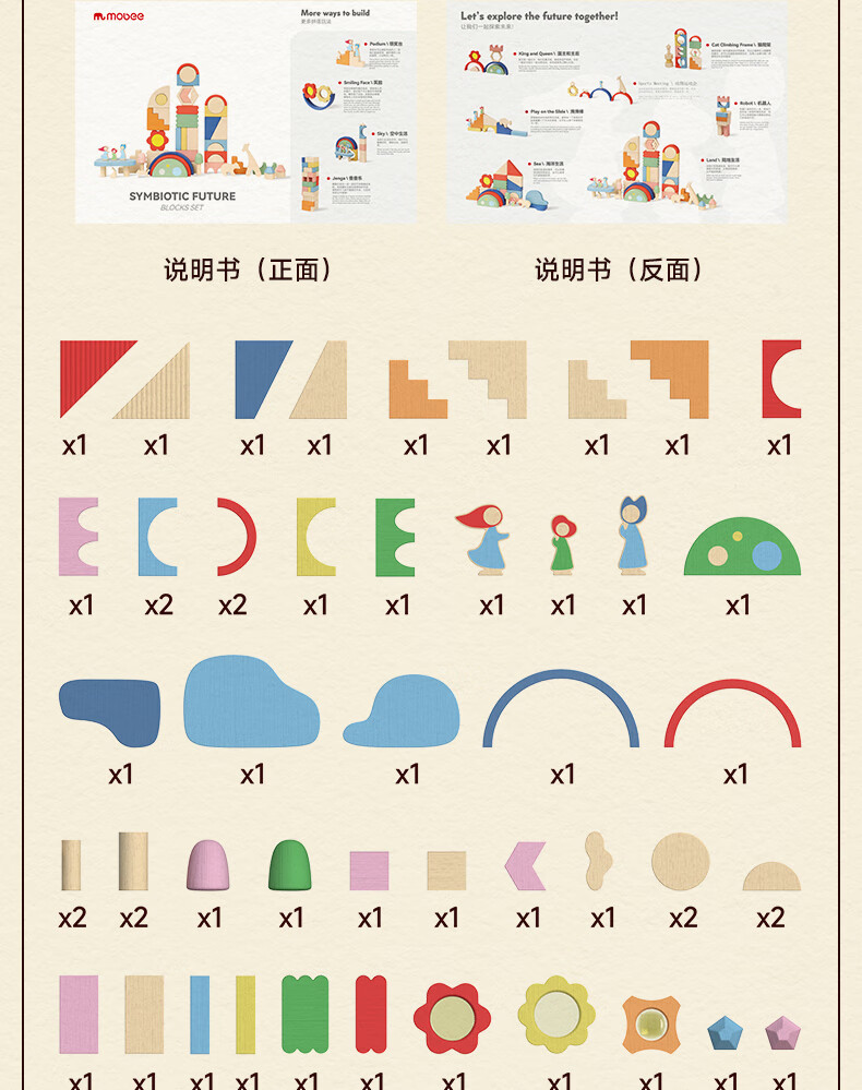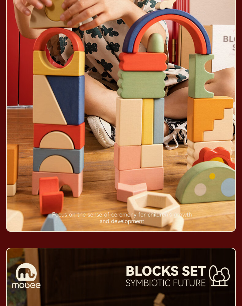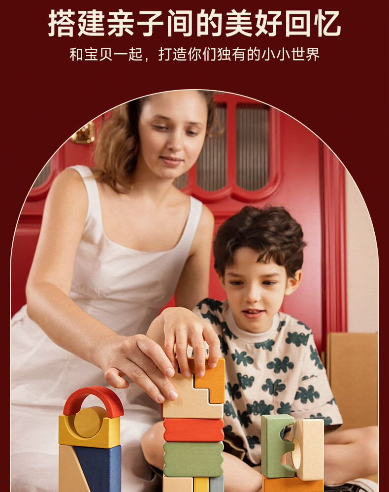 mobee木质儿童益智大颗粒3-6岁拼搭积木60粒宝贝玩具礼物周岁生日新年 巨石小镇叠叠乐积木【42pcs】