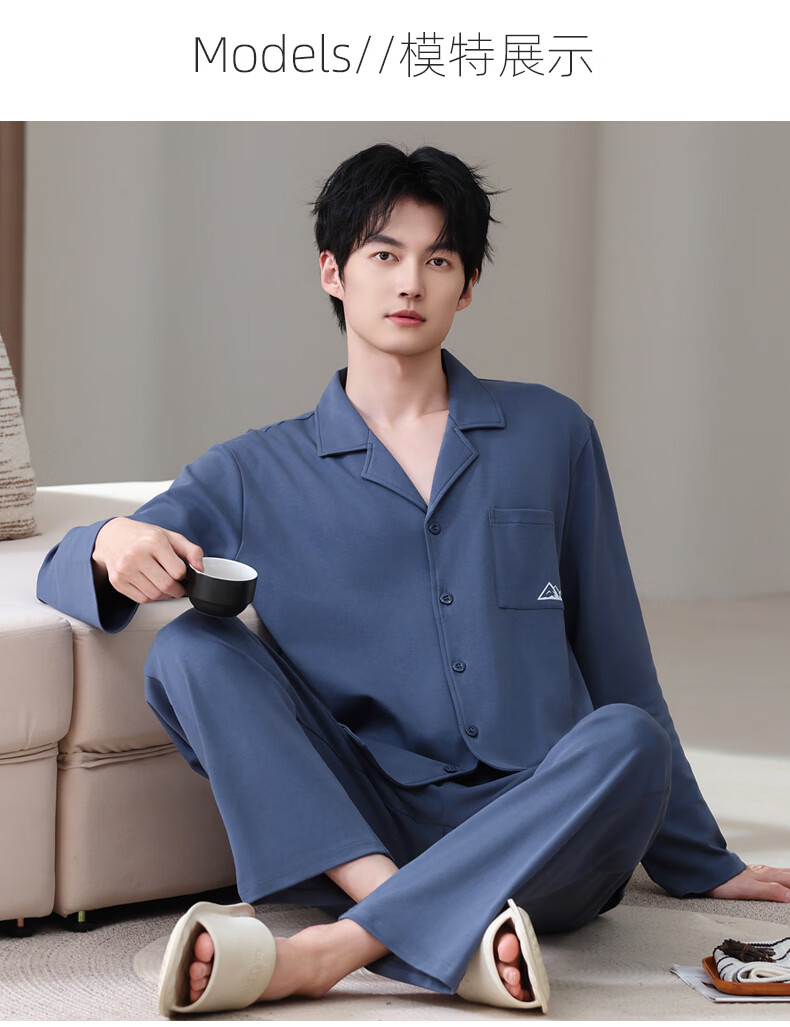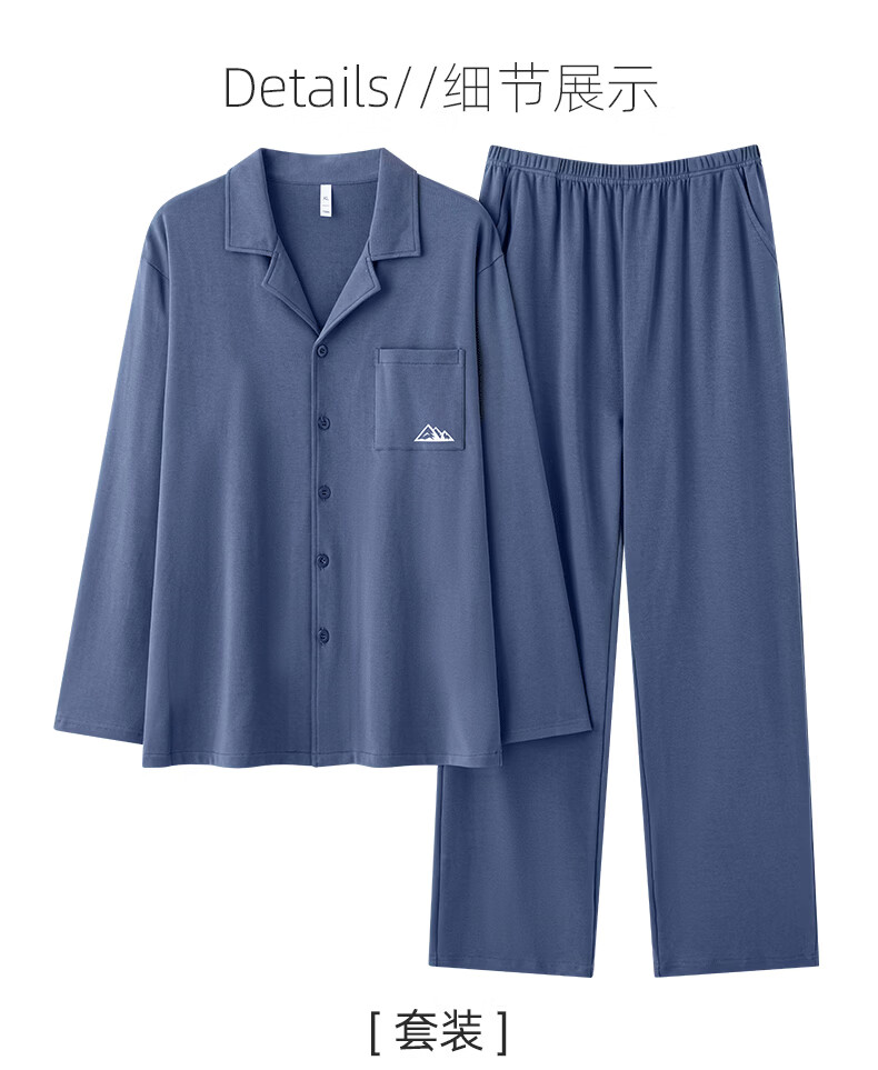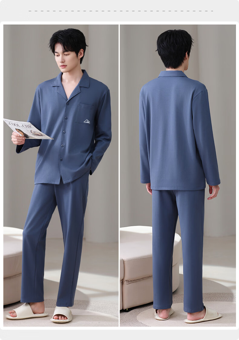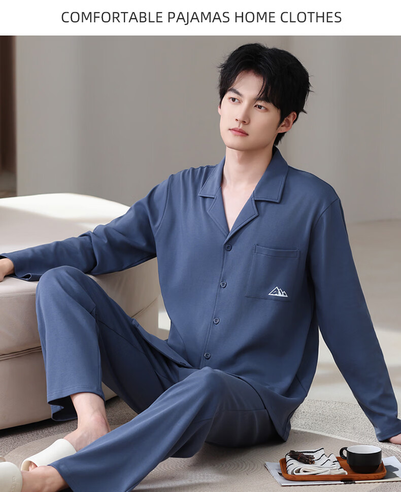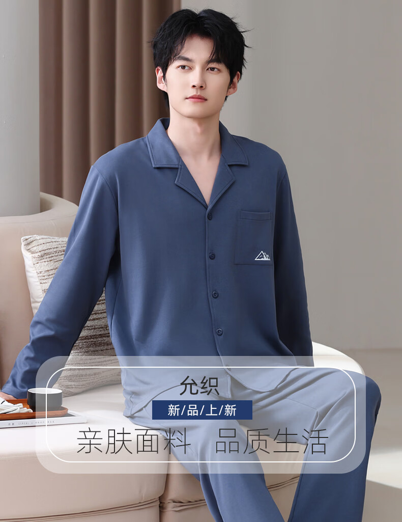 允织莱卡棉睡衣男士春秋季纯棉长袖套装2026年新款男款开衫家居服休闲 8711-蓝灰 L (170) :建议100-135斤穿着