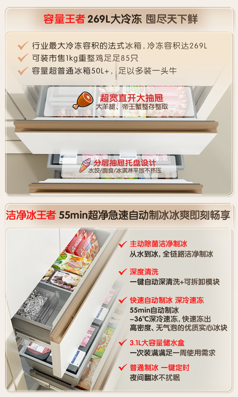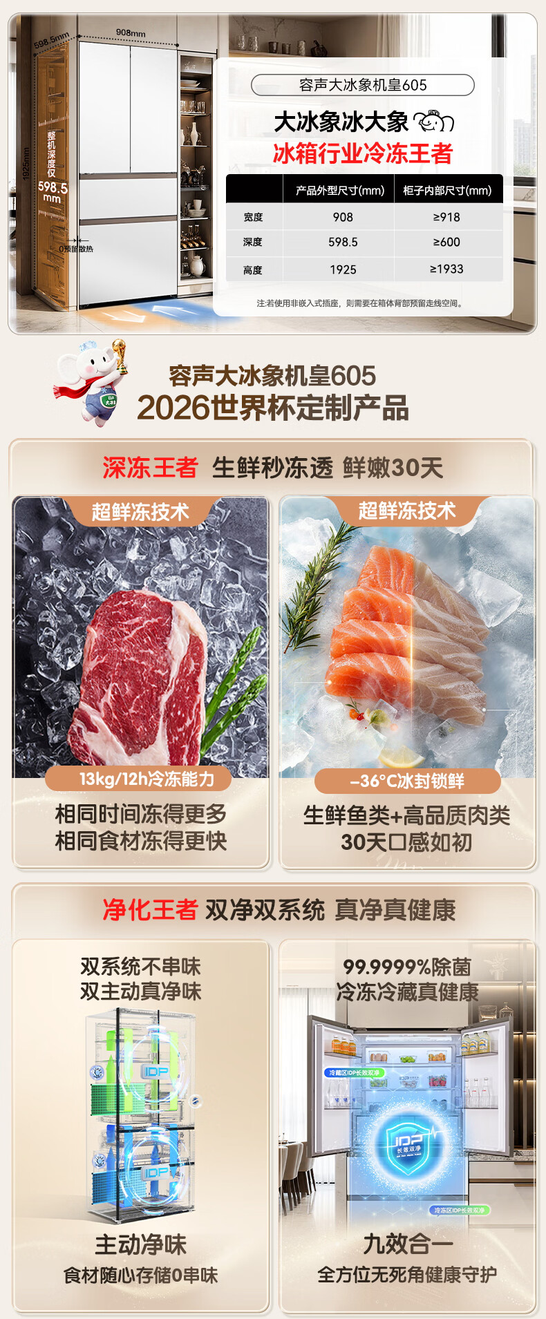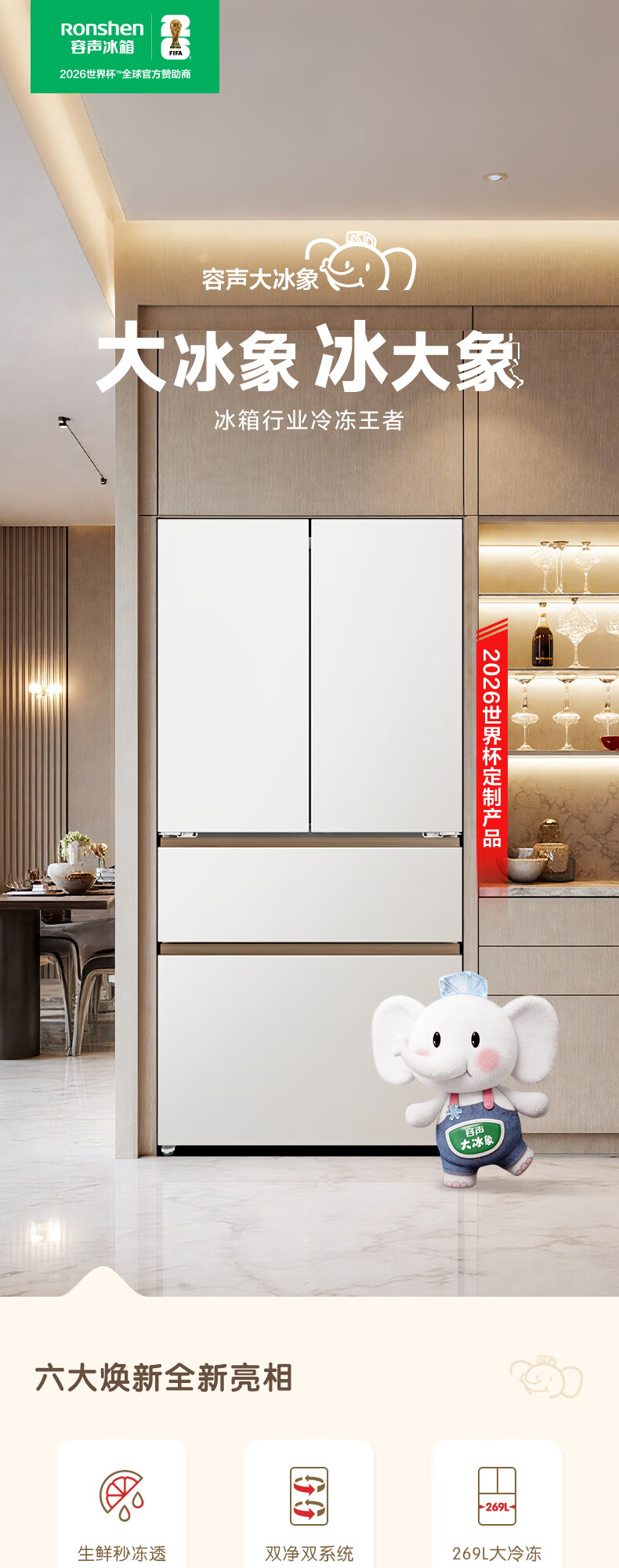 容声世界杯定制大冰象机皇605L法式四开门冰箱双系统超薄嵌入式一级能效制冰国家补贴 BCD-605Q60FZNBD