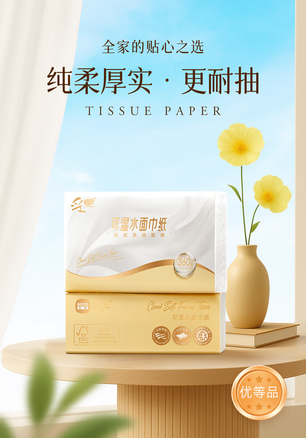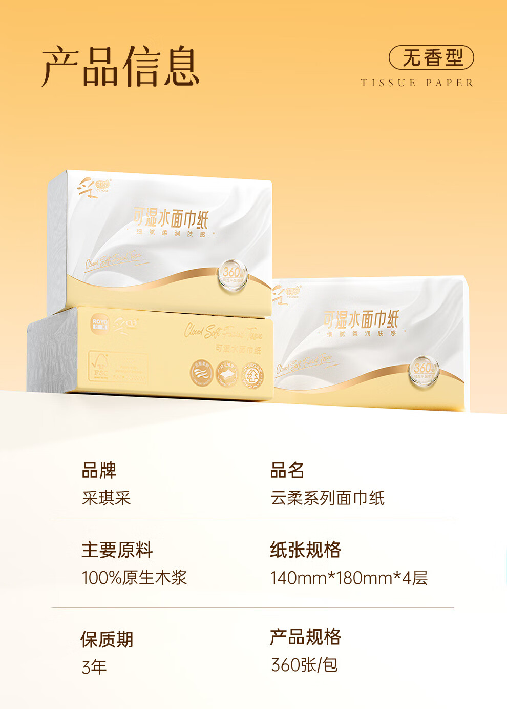 采琪采抽纸4层360张*6包【手提装】优等品100%原木亲肤面巾纸餐巾纸批发