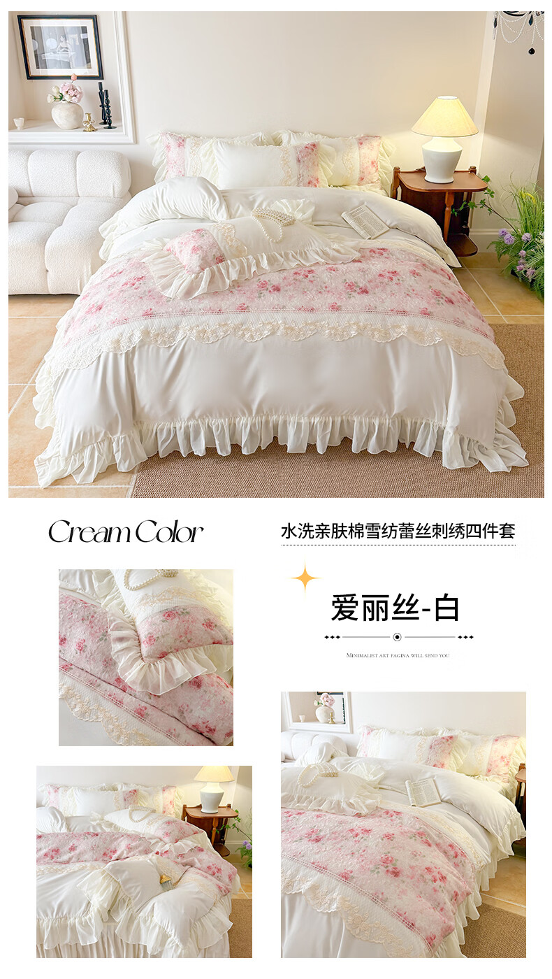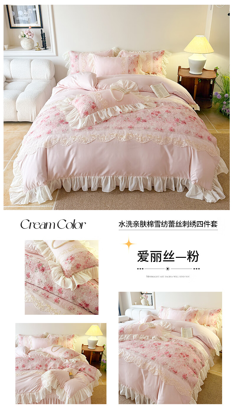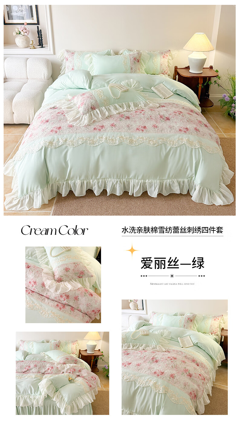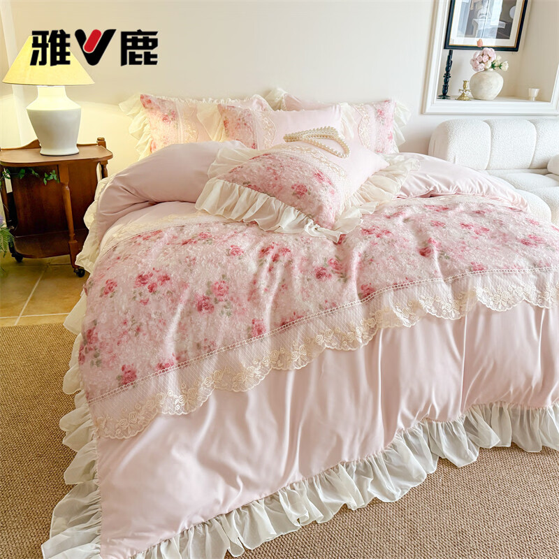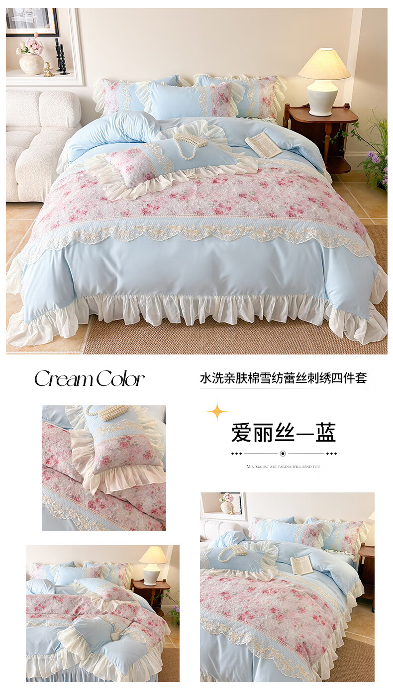 雅鹿水洗亲肤棉雪纺花边蕾丝刺绣法式床裙韩版四件套家用公主风 爱丽丝-蓝 1.8 床笠款 (被套200*230cm) 四件套