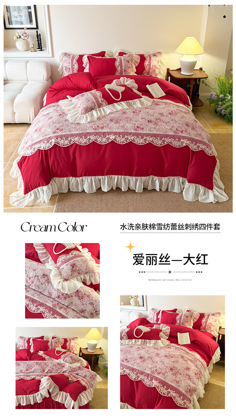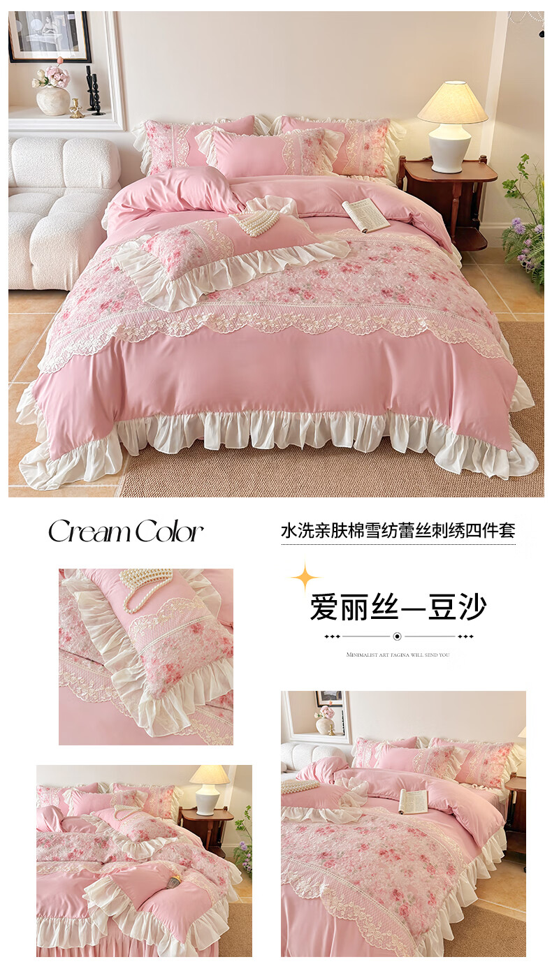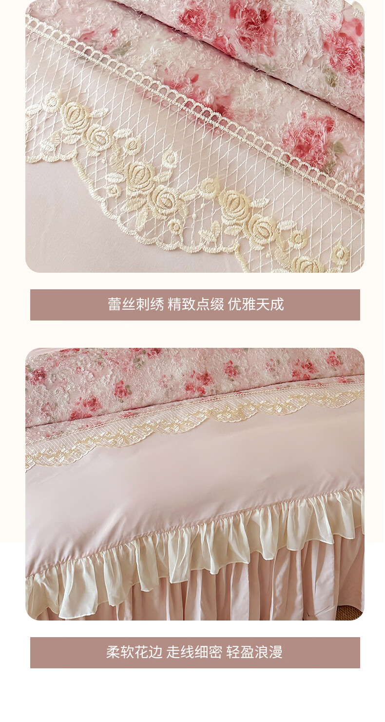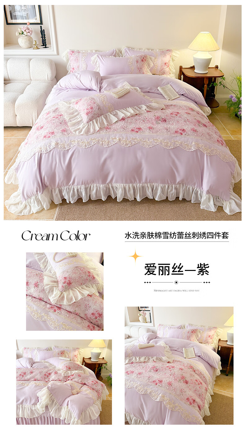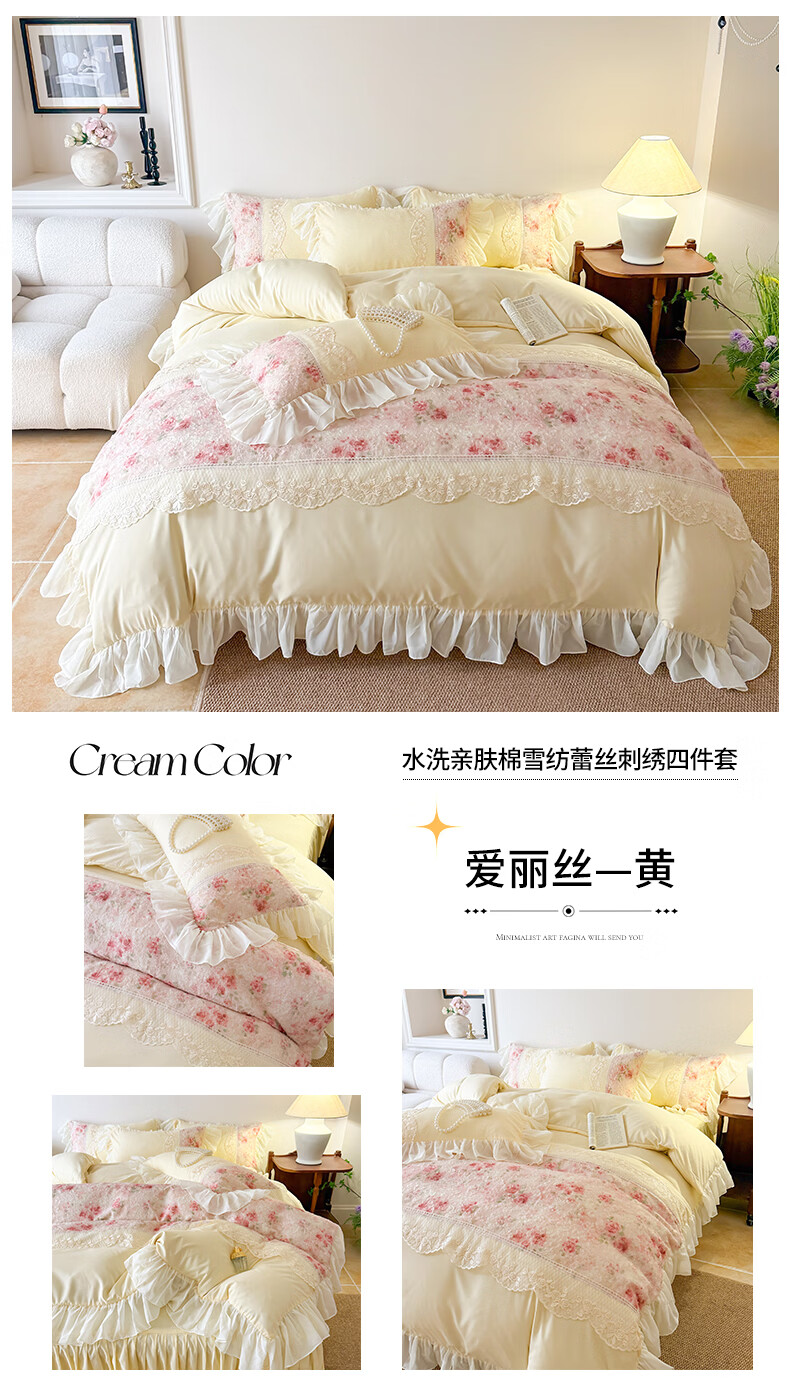 雅鹿水洗亲肤棉雪纺花边蕾丝刺绣法式床裙韩版四件套家用公主风 爱丽丝-蓝 1.8 床笠款 (被套200*230cm) 四件套