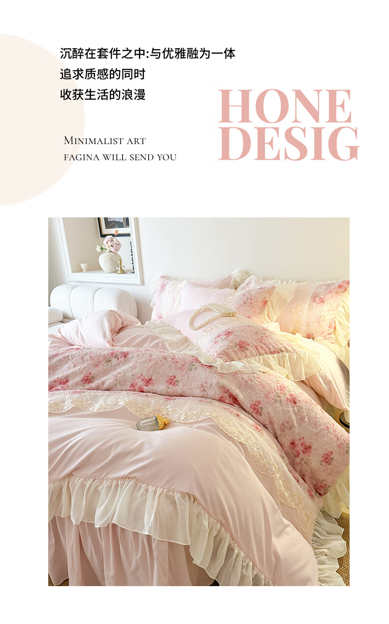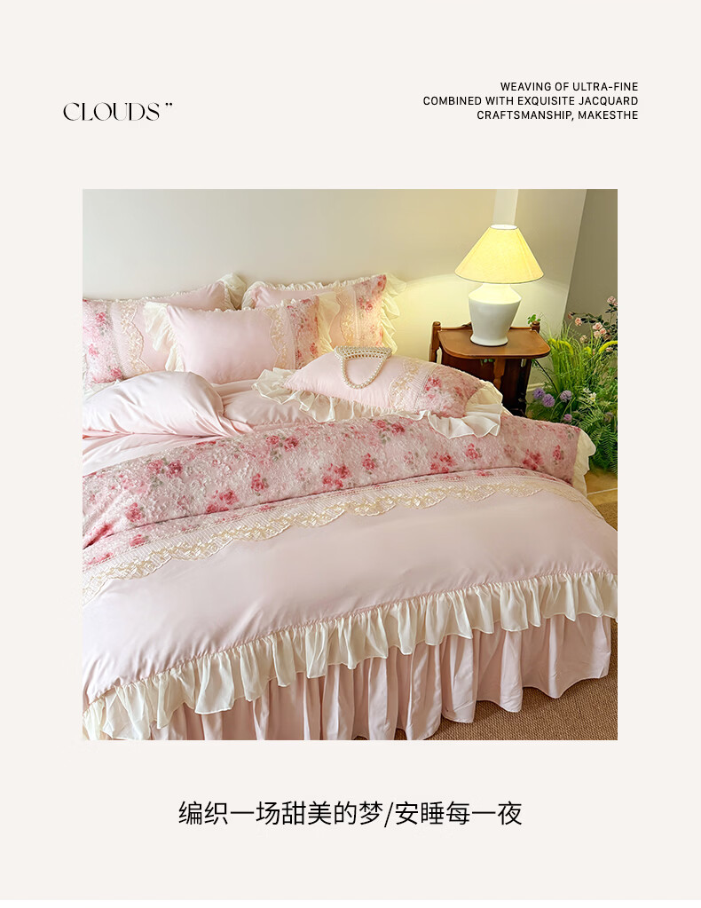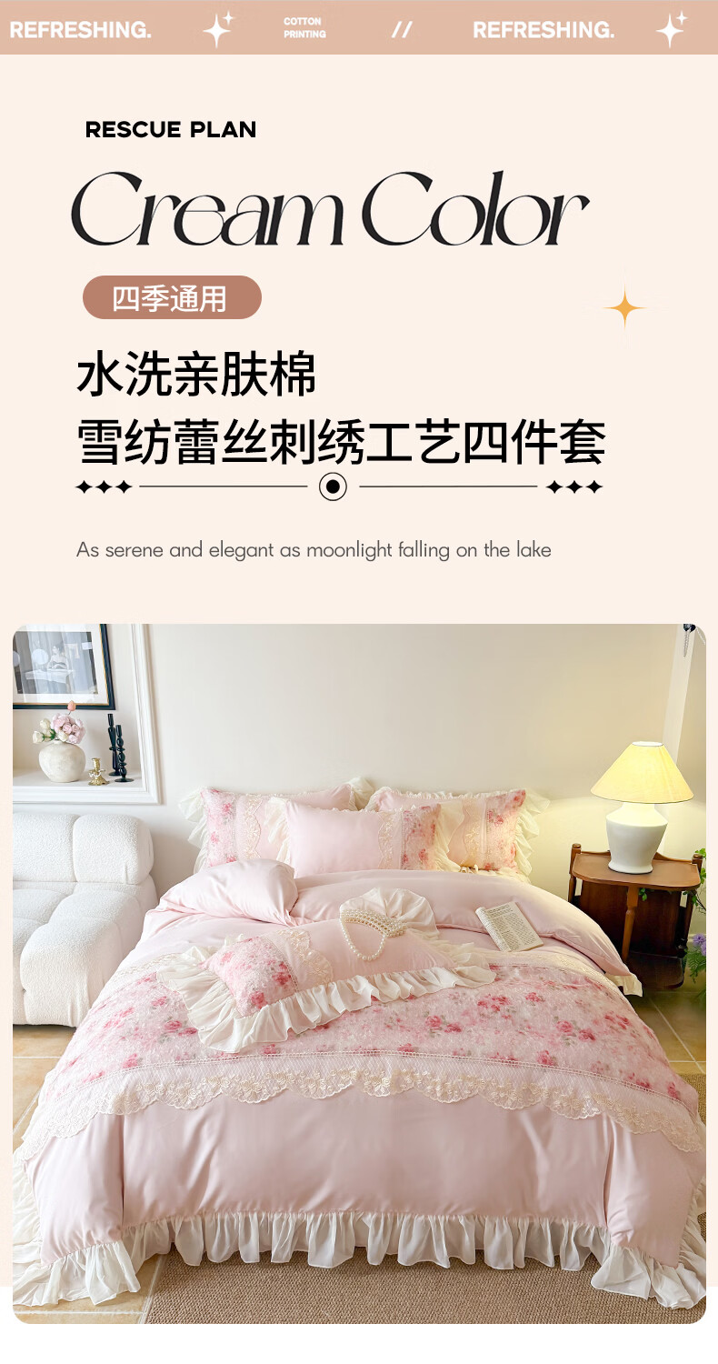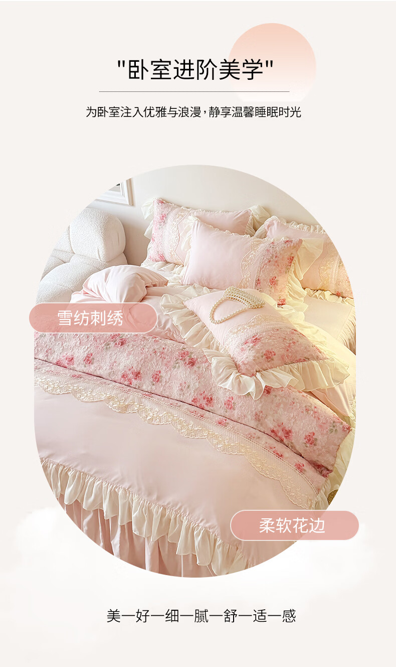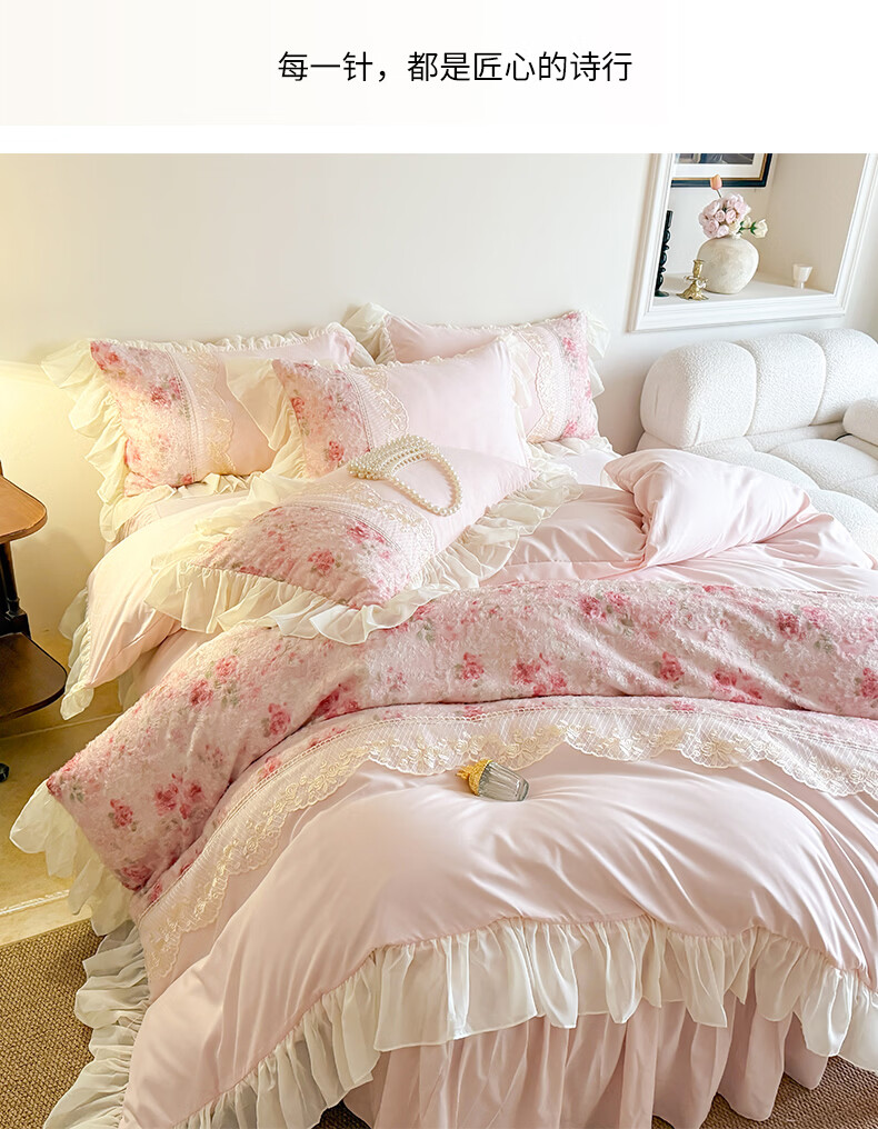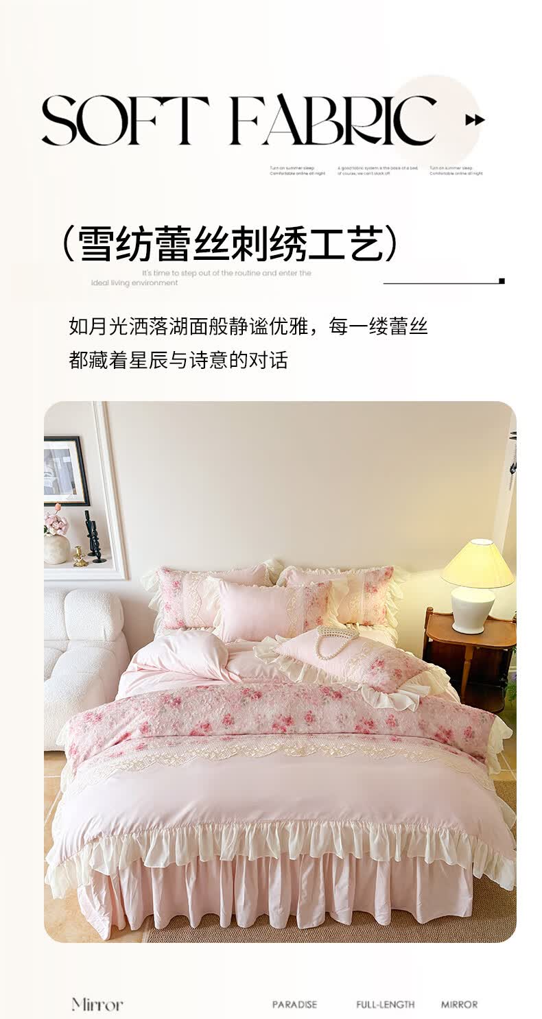 雅鹿水洗亲肤棉雪纺花边蕾丝刺绣法式床裙韩版四件套家用公主风 爱丽丝-蓝 1.8 床笠款 (被套200*230cm) 四件套
