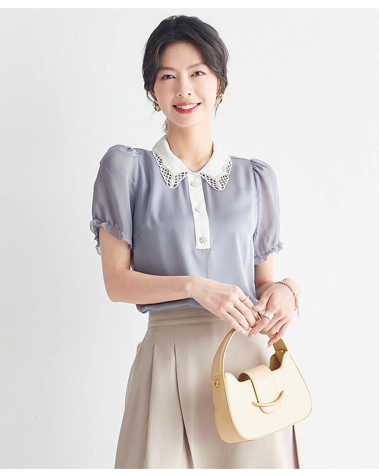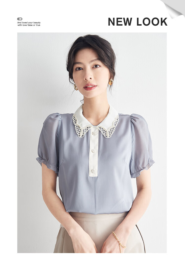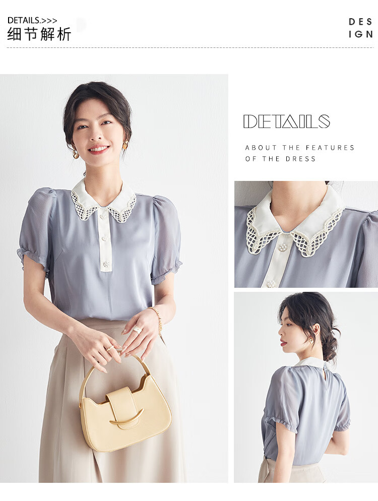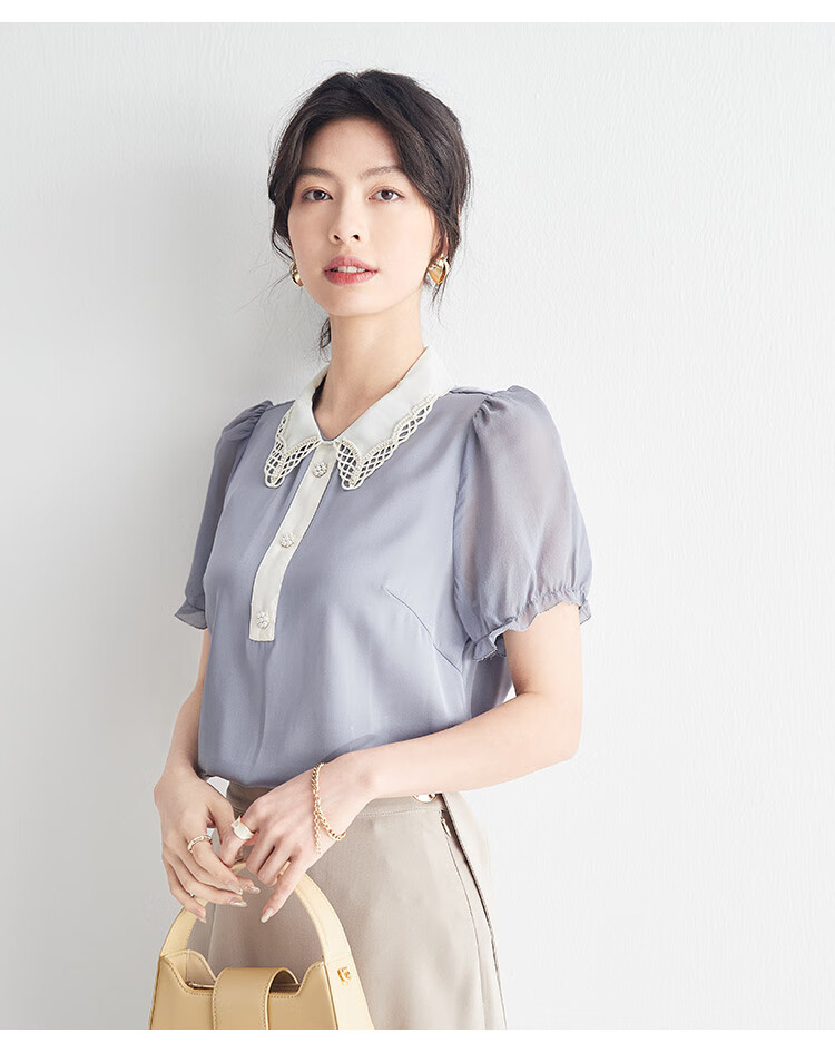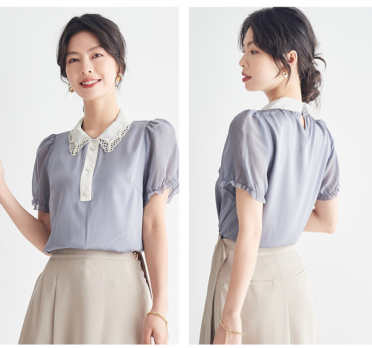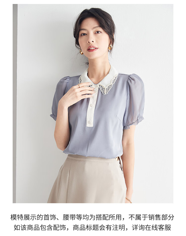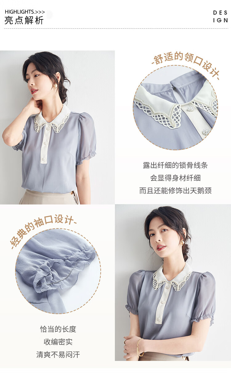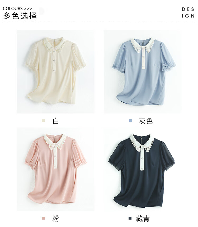 帕罗夏季新款百搭真丝短袖t恤女时尚设计感小众蕾丝边泡泡袖上衣 灰色 L 165/88A