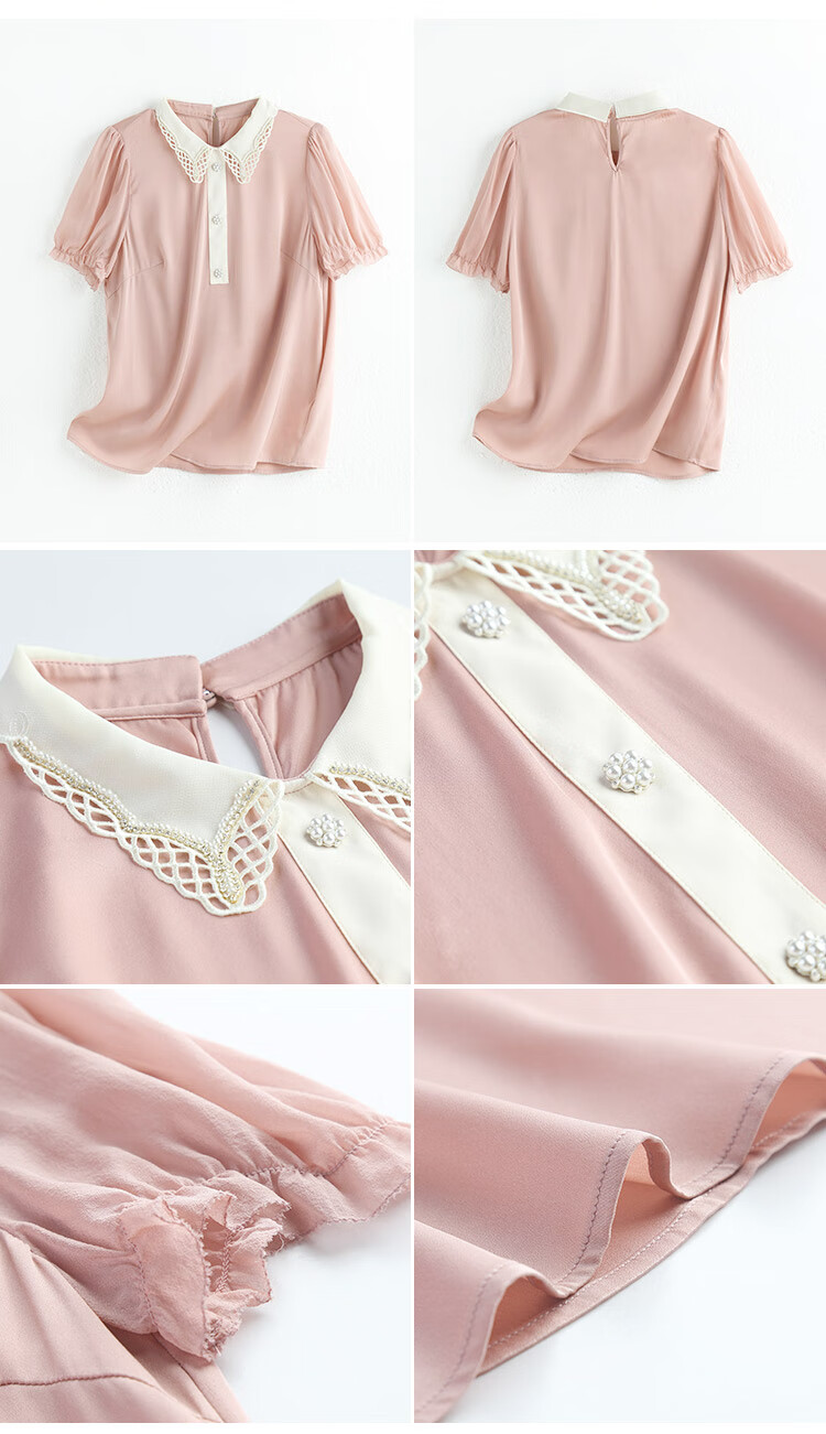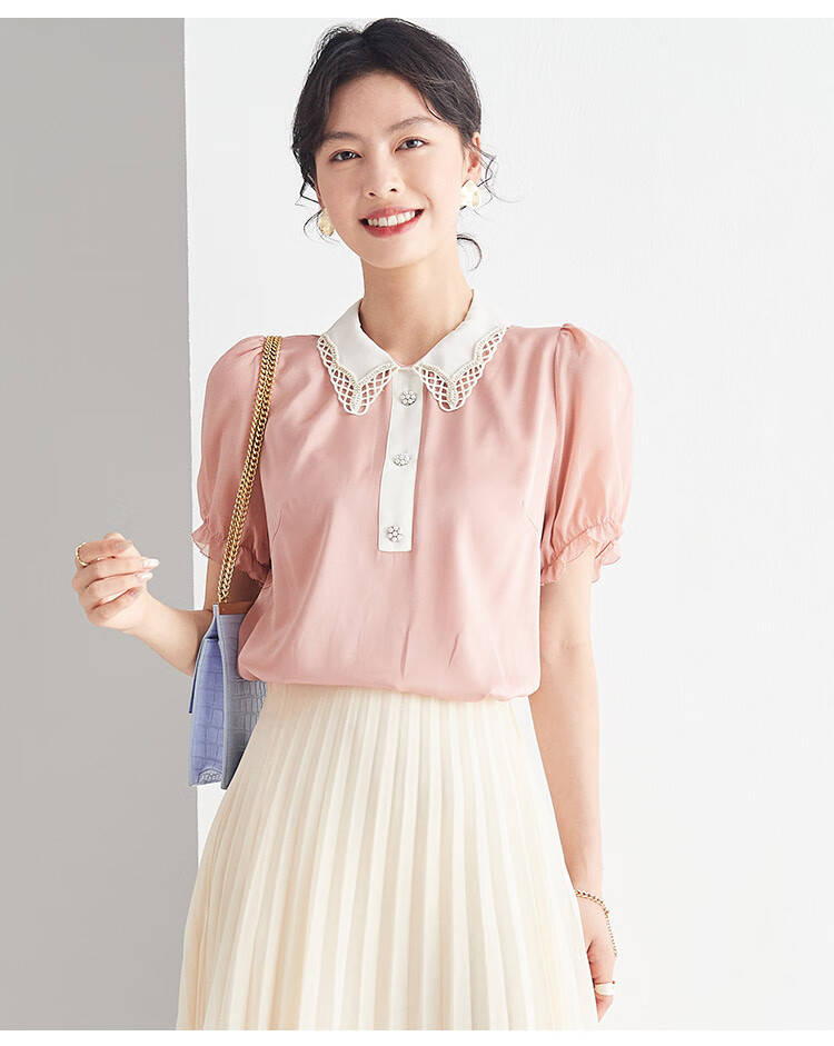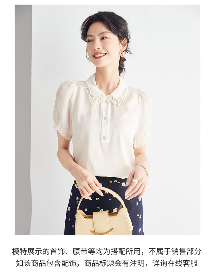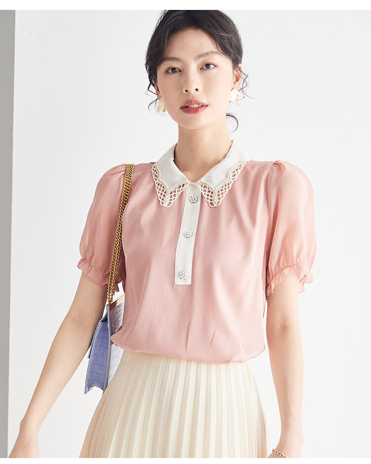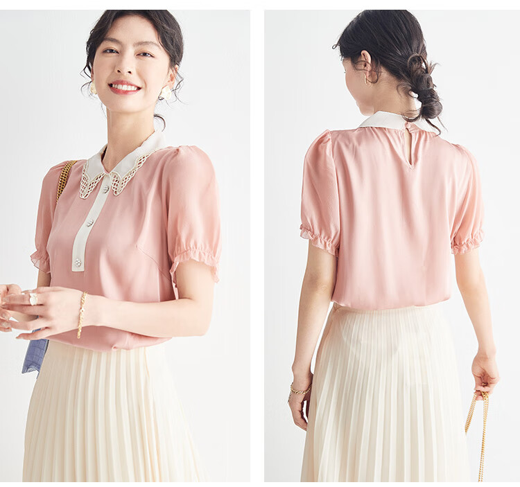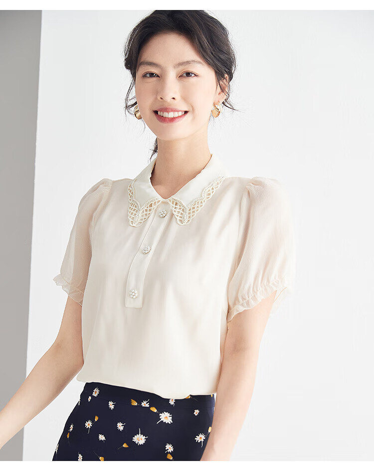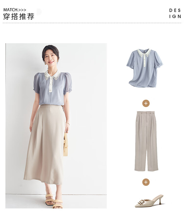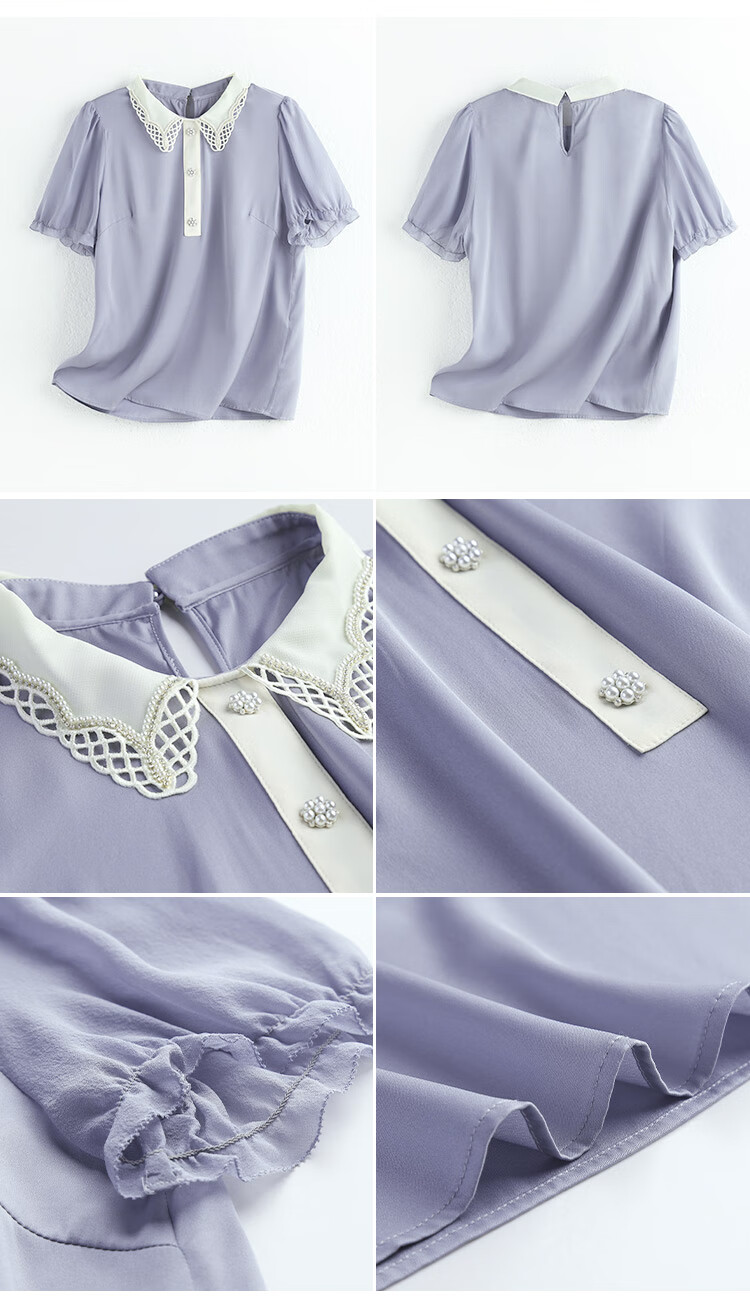 帕罗夏季新款百搭真丝短袖t恤女时尚设计感小众蕾丝边泡泡袖上衣 灰色 L 165/88A
