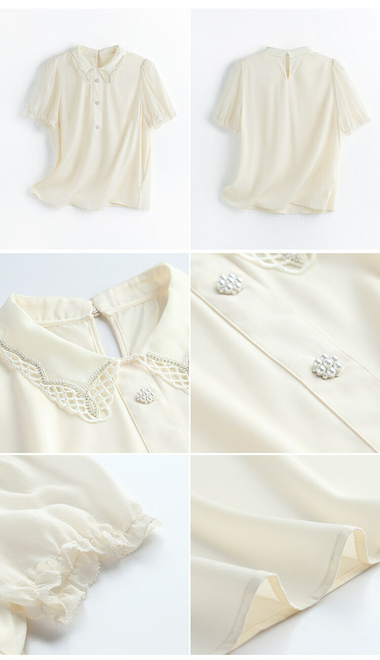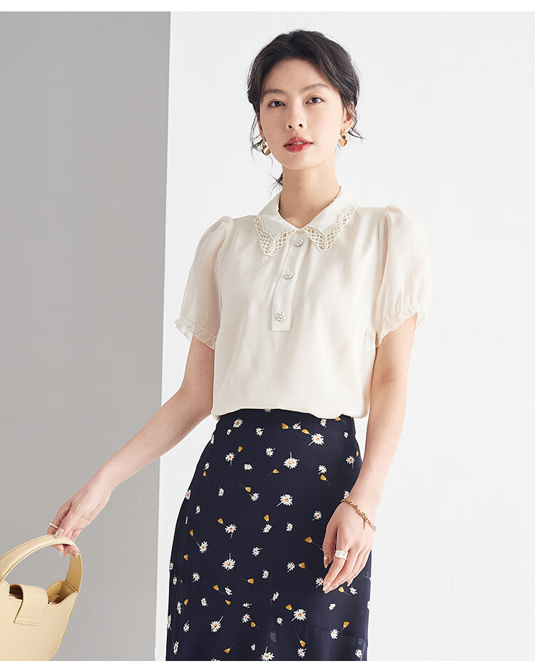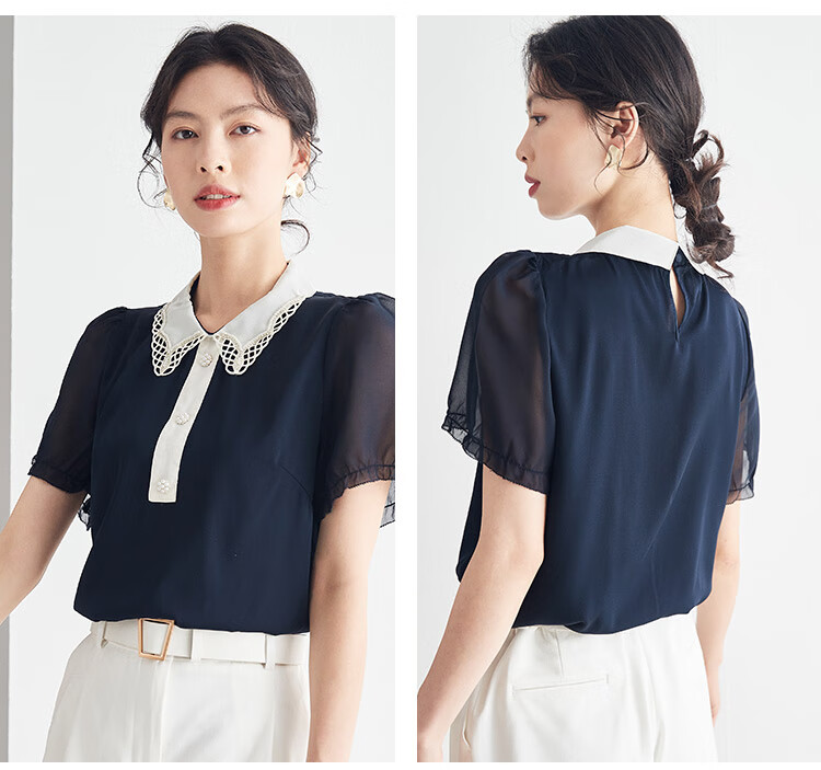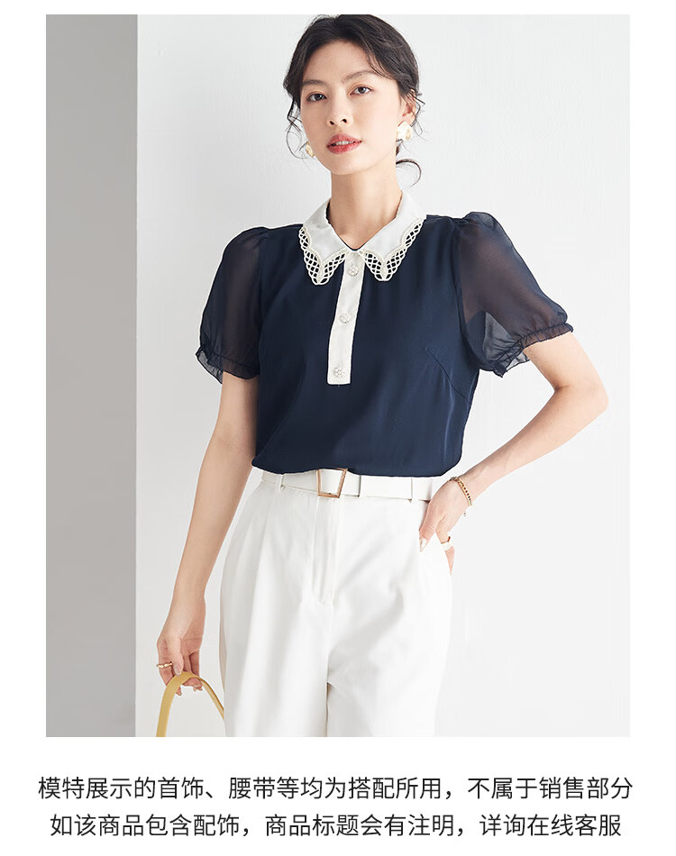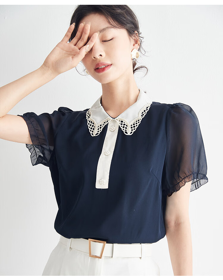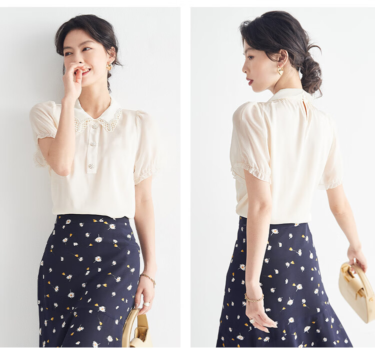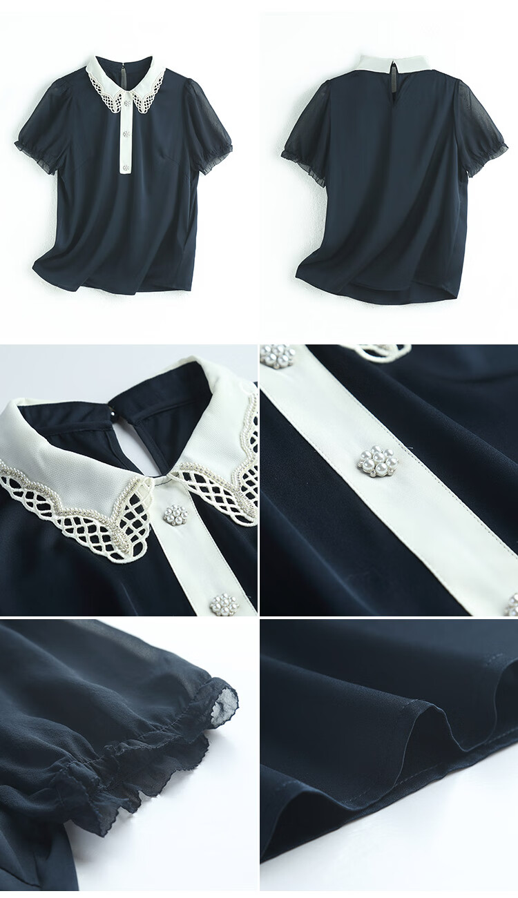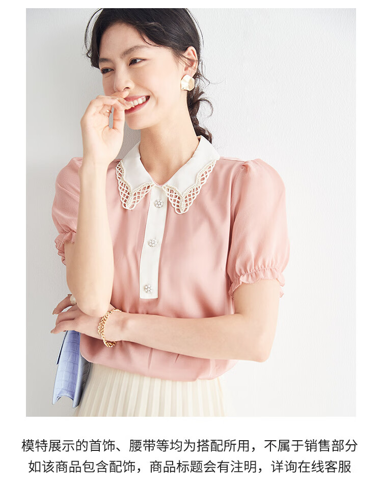 帕罗夏季新款百搭真丝短袖t恤女时尚设计感小众蕾丝边泡泡袖上衣 灰色 L 165/88A
