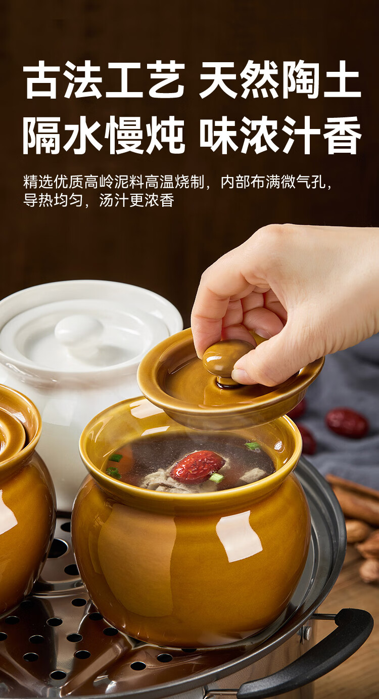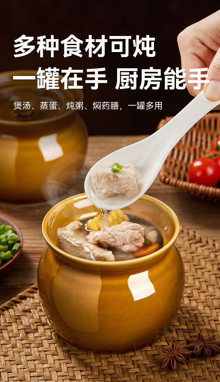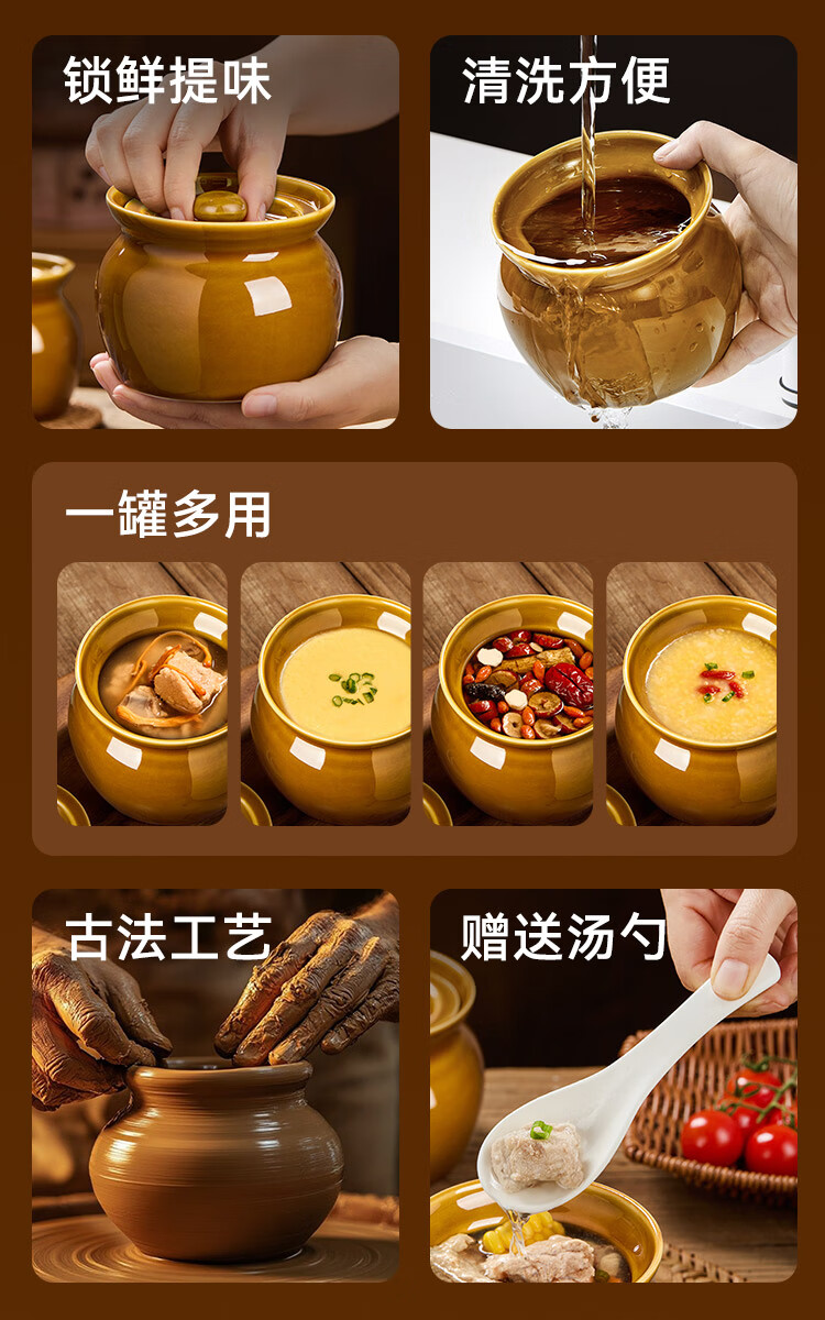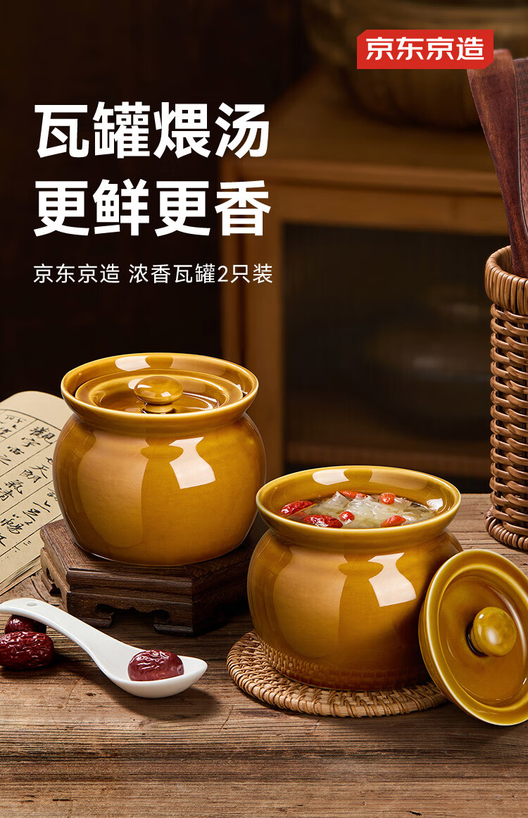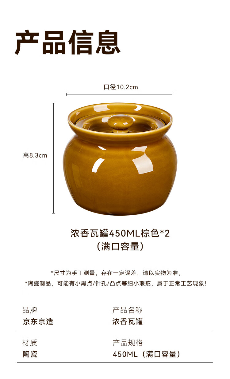 京东京造 炖盅【传统瓦罐】陶瓷蒸蛋辅食带盖赠勺子 瓦罐450ML棕色2只装