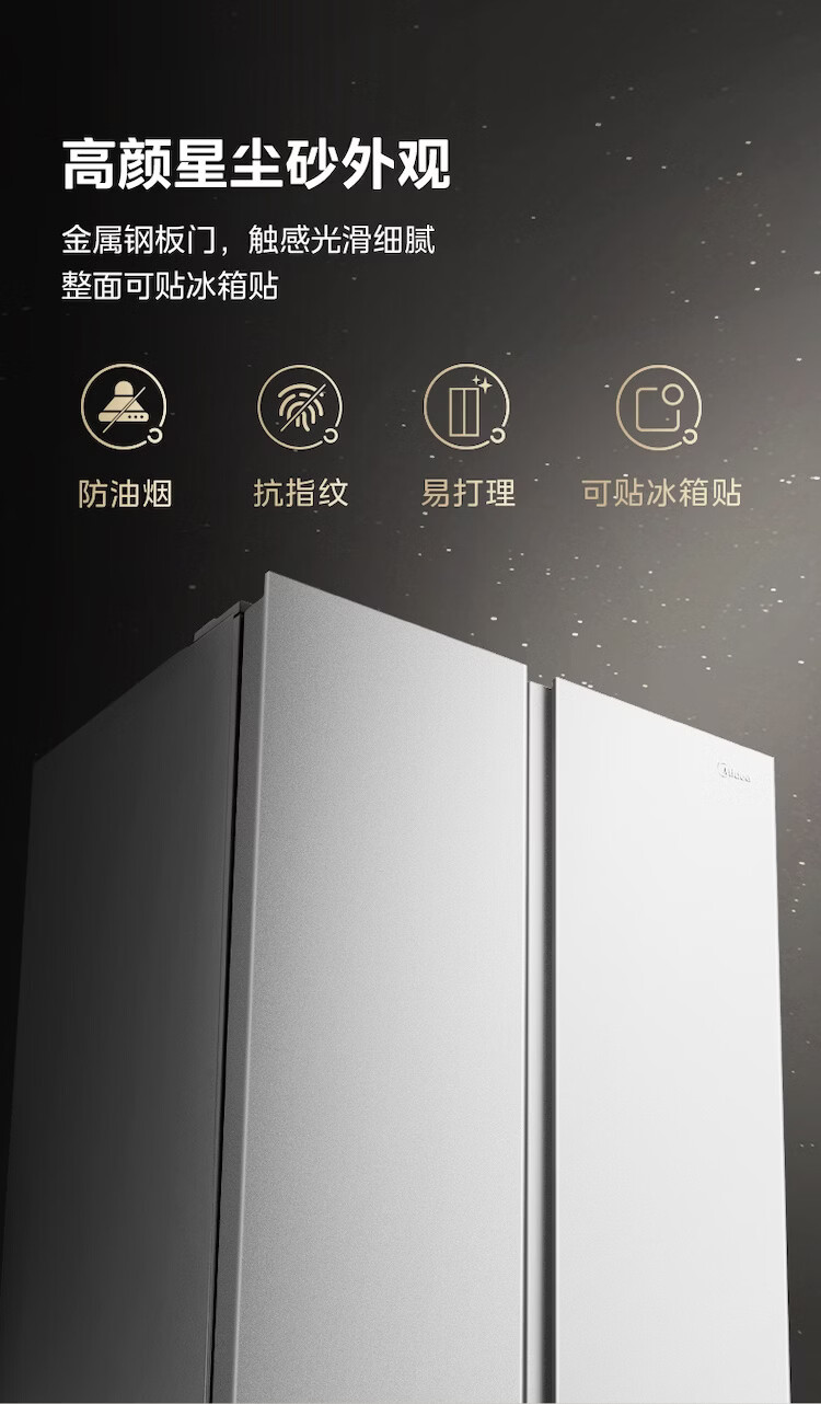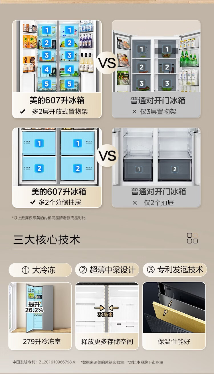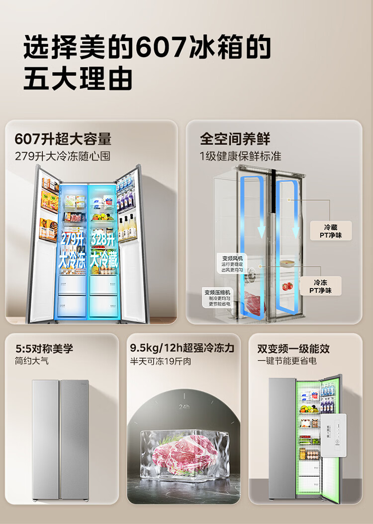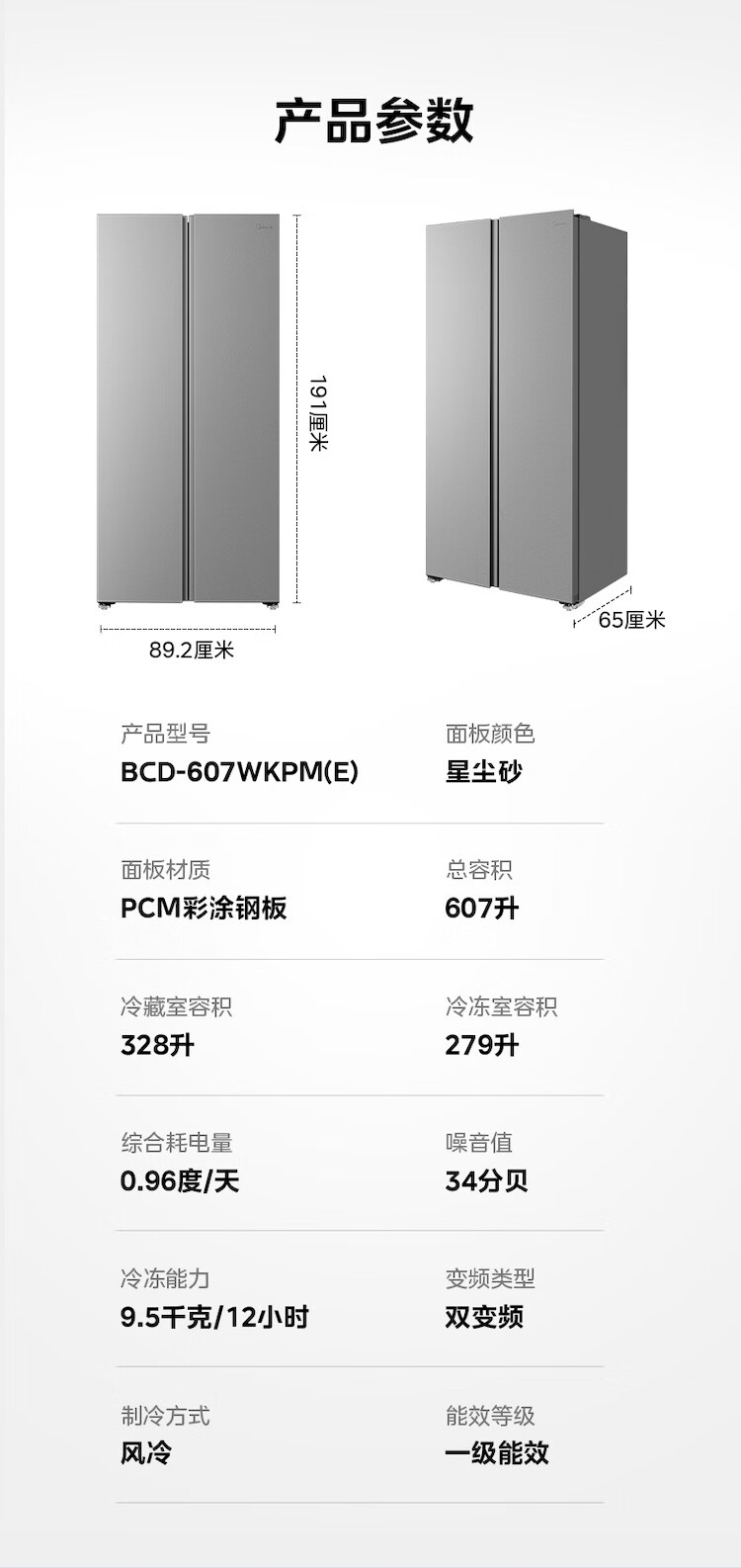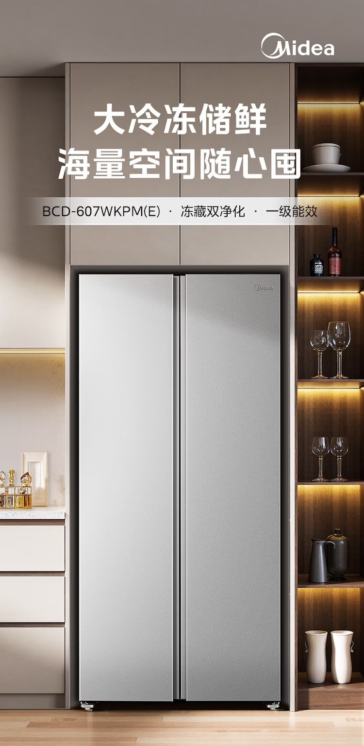 美的(Midea)607pro双开门冰箱超大容量一级能效家用风冷无霜大冷冻节能星辰砂BCD-607WKPM(E)以旧换新国家补贴