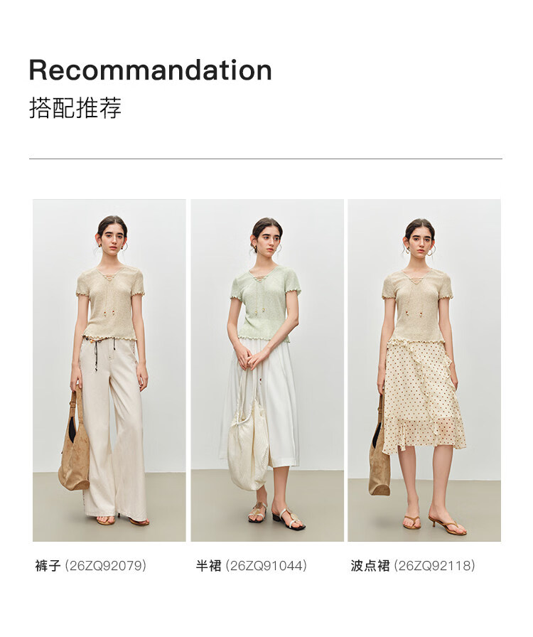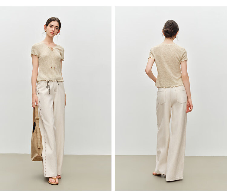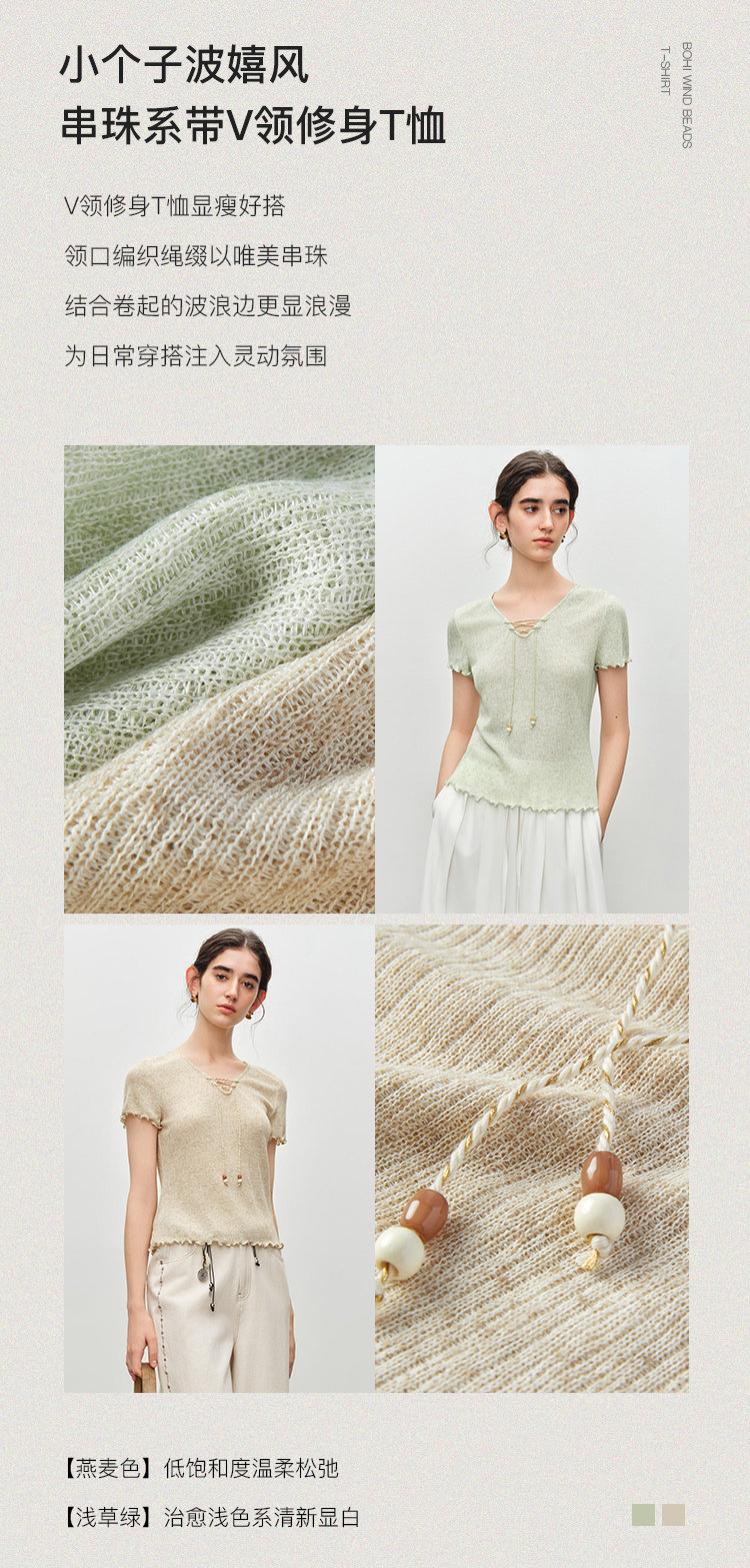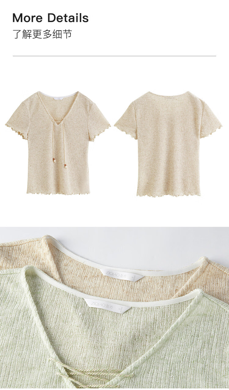 自巧小个子波嬉风串珠系带v领修身针织t恤女2026夏季新款短袖上衣 燕麦色 XXS (尺码:1)