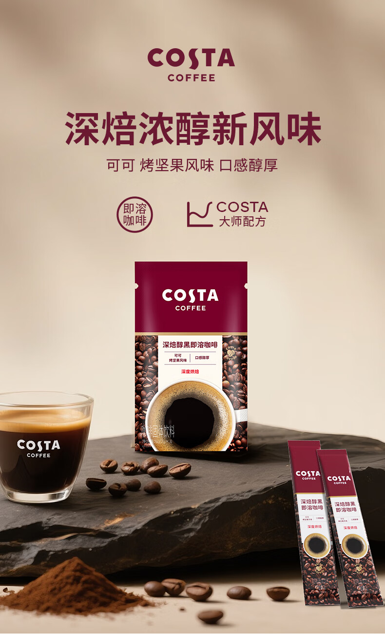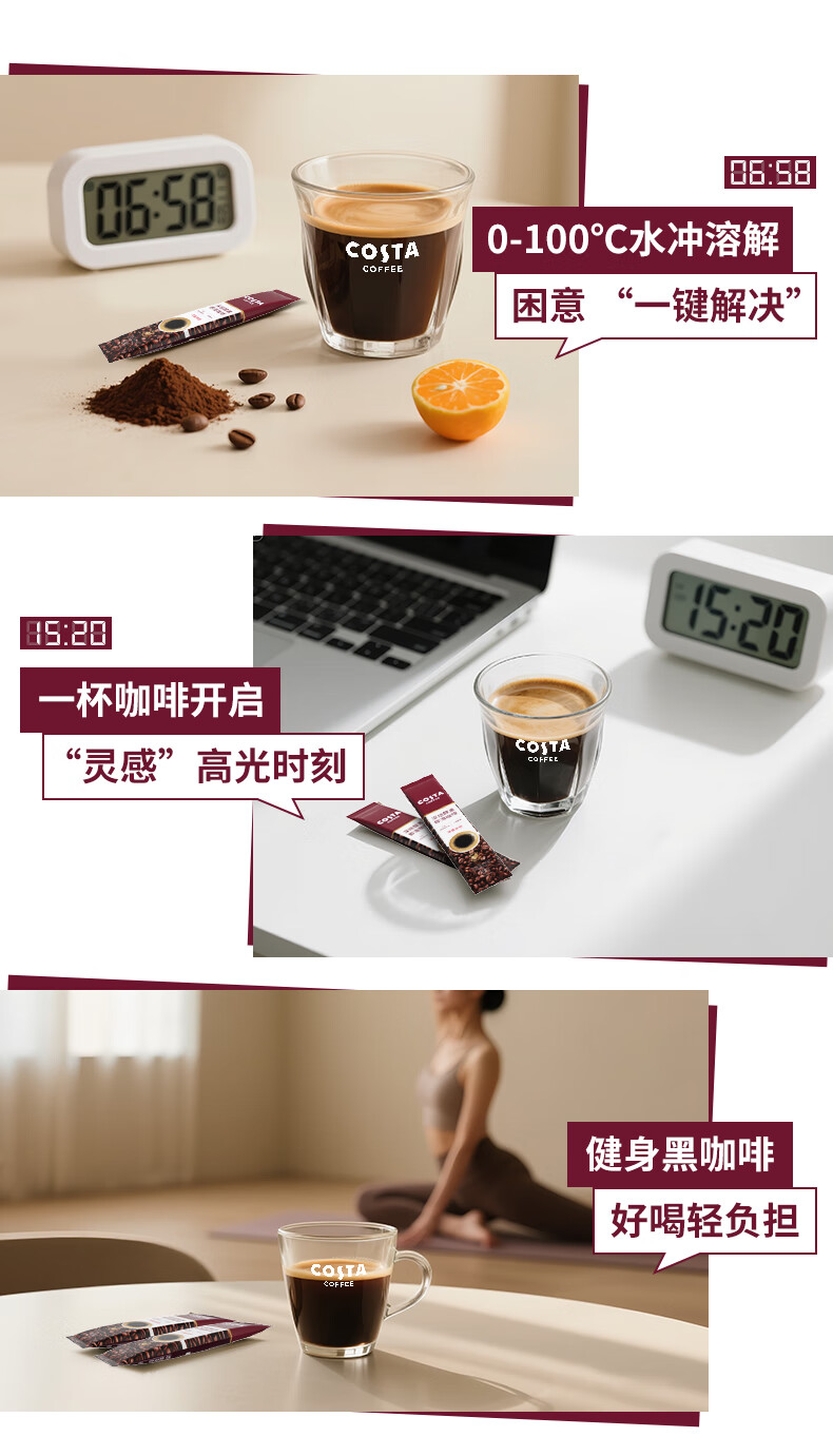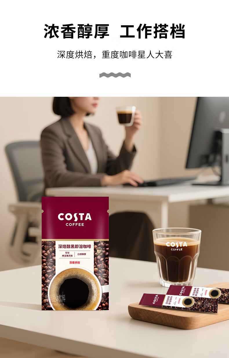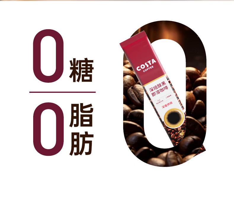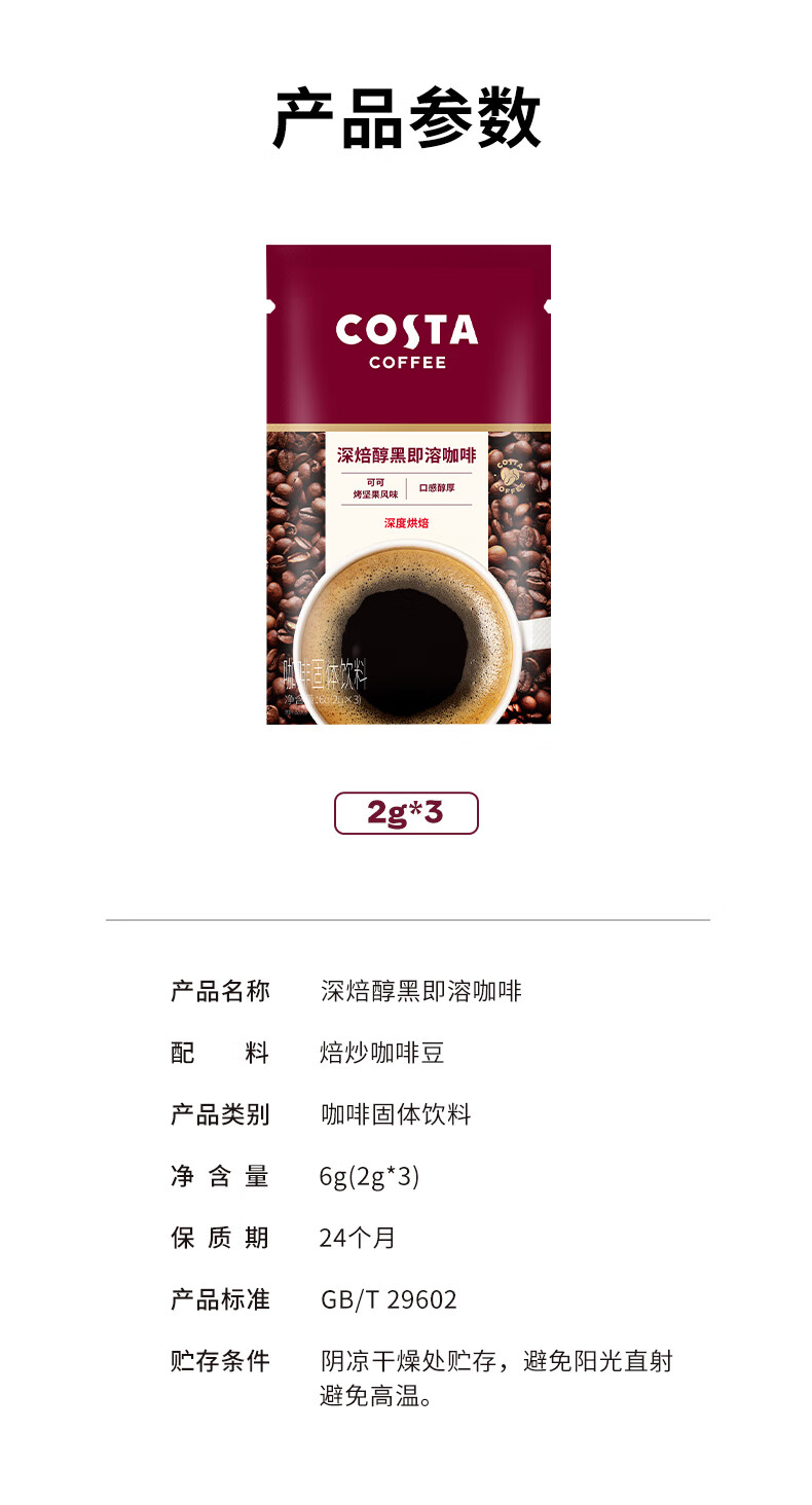 COSTA速溶咖啡美式深烘0糖0脂纯黑咖啡粉冷热即溶400次运动健身2g*3条