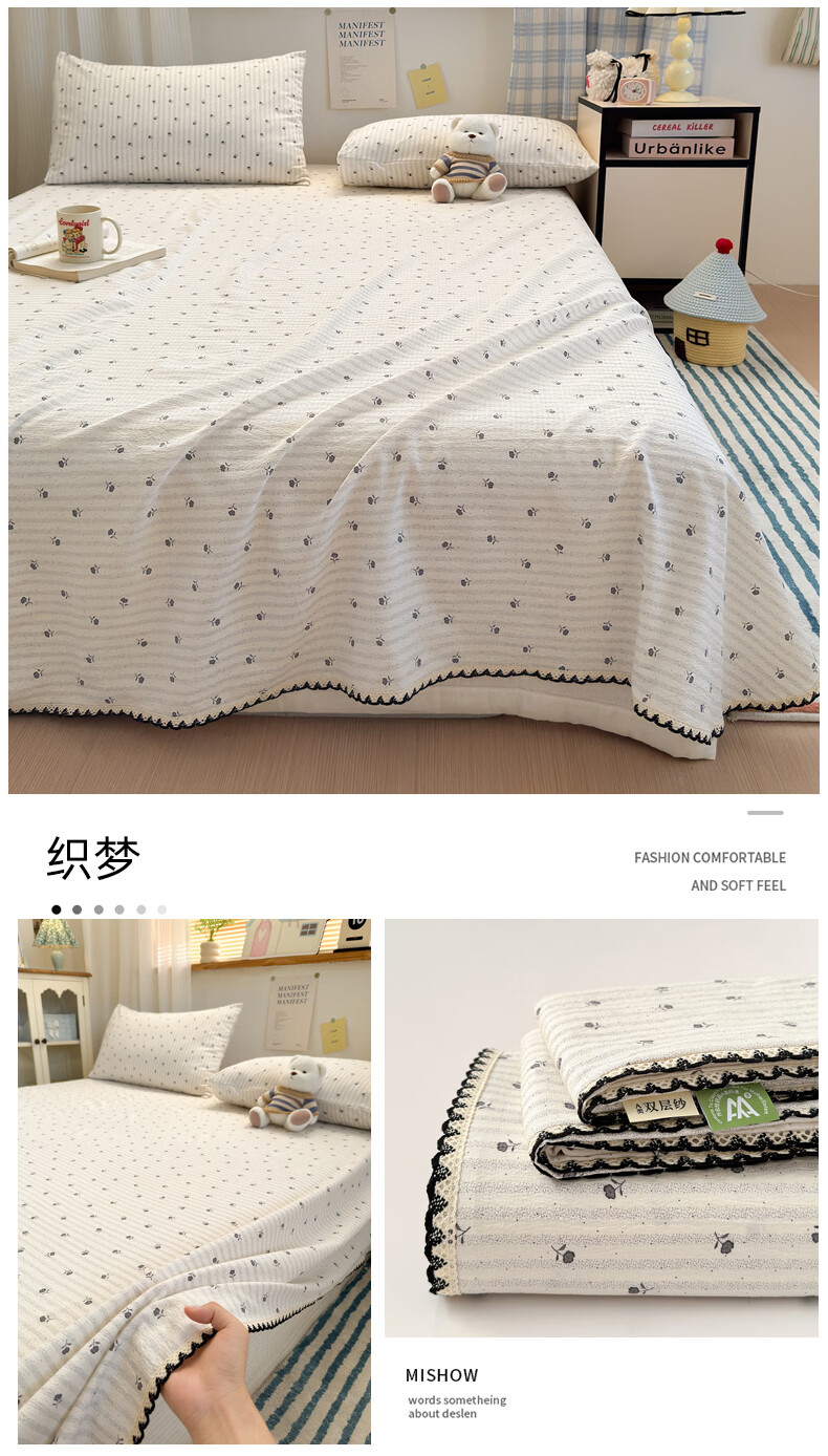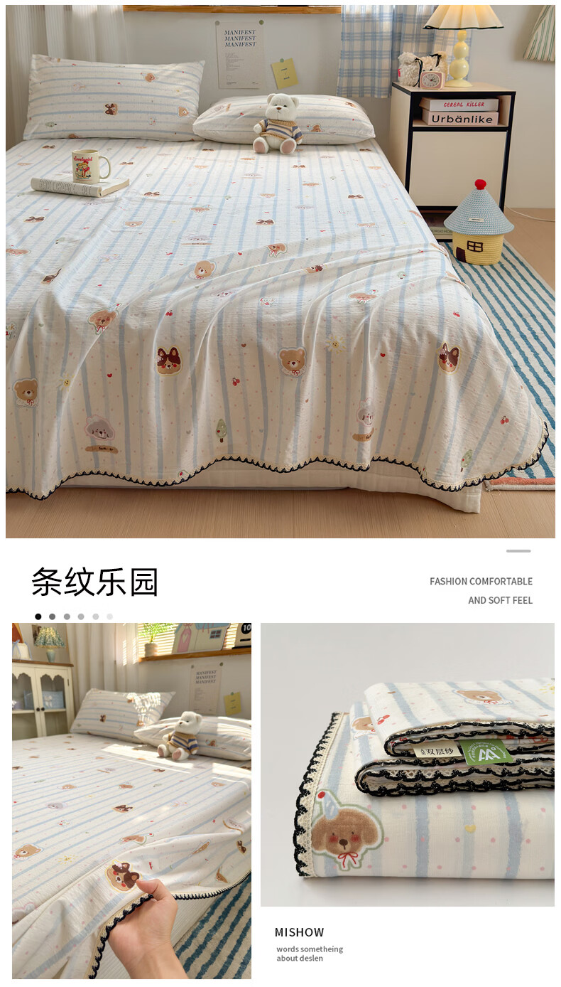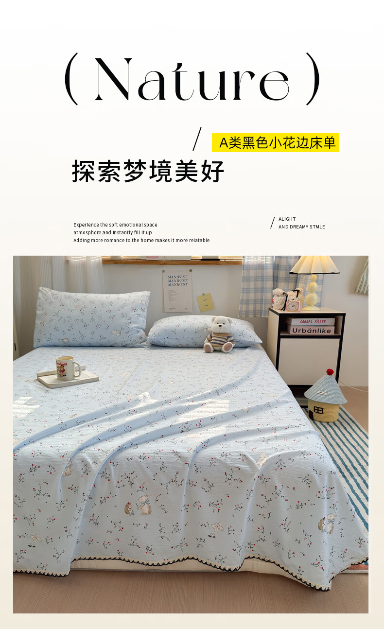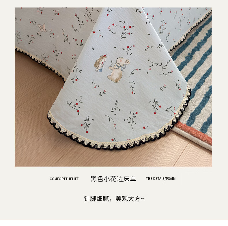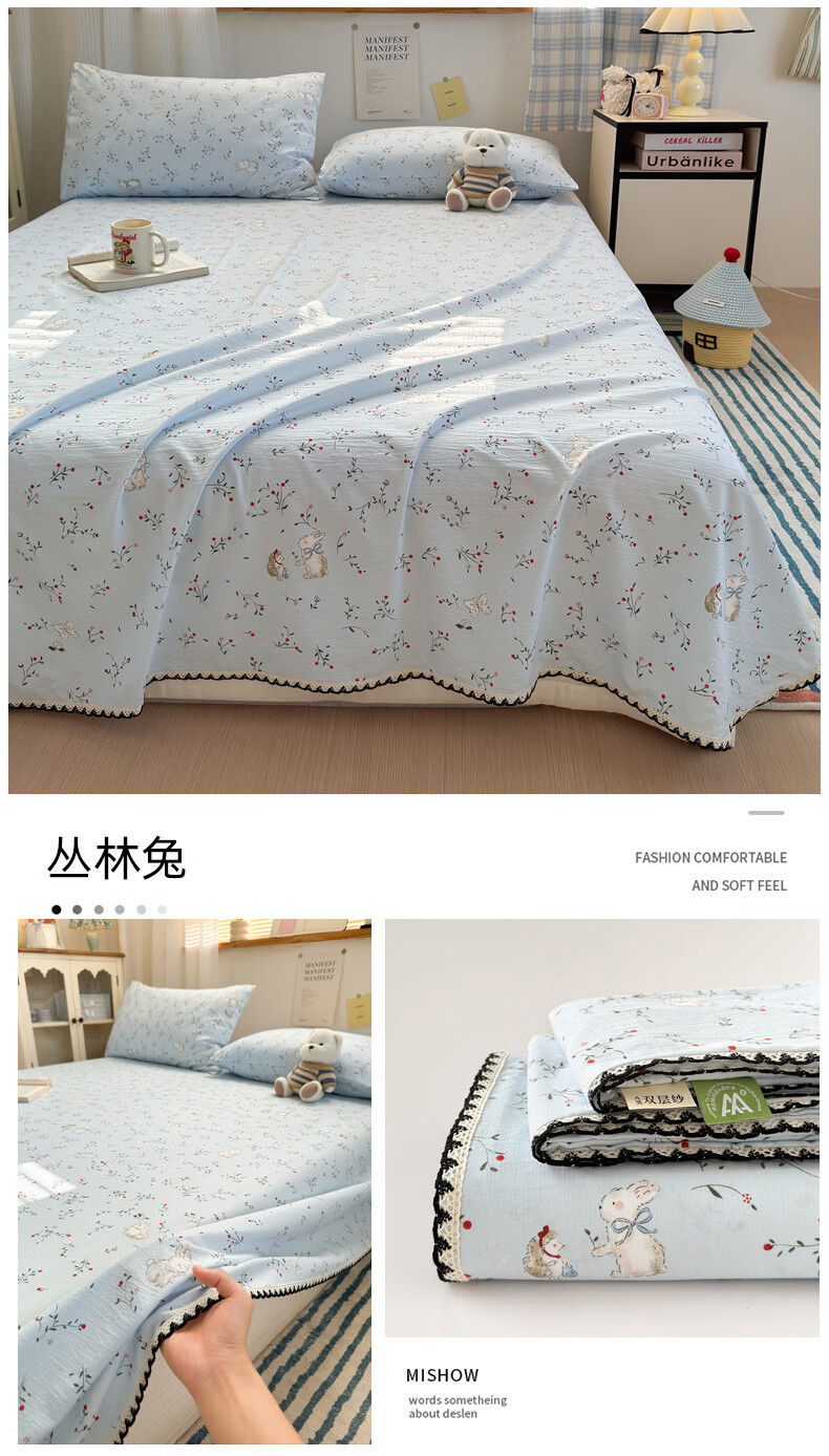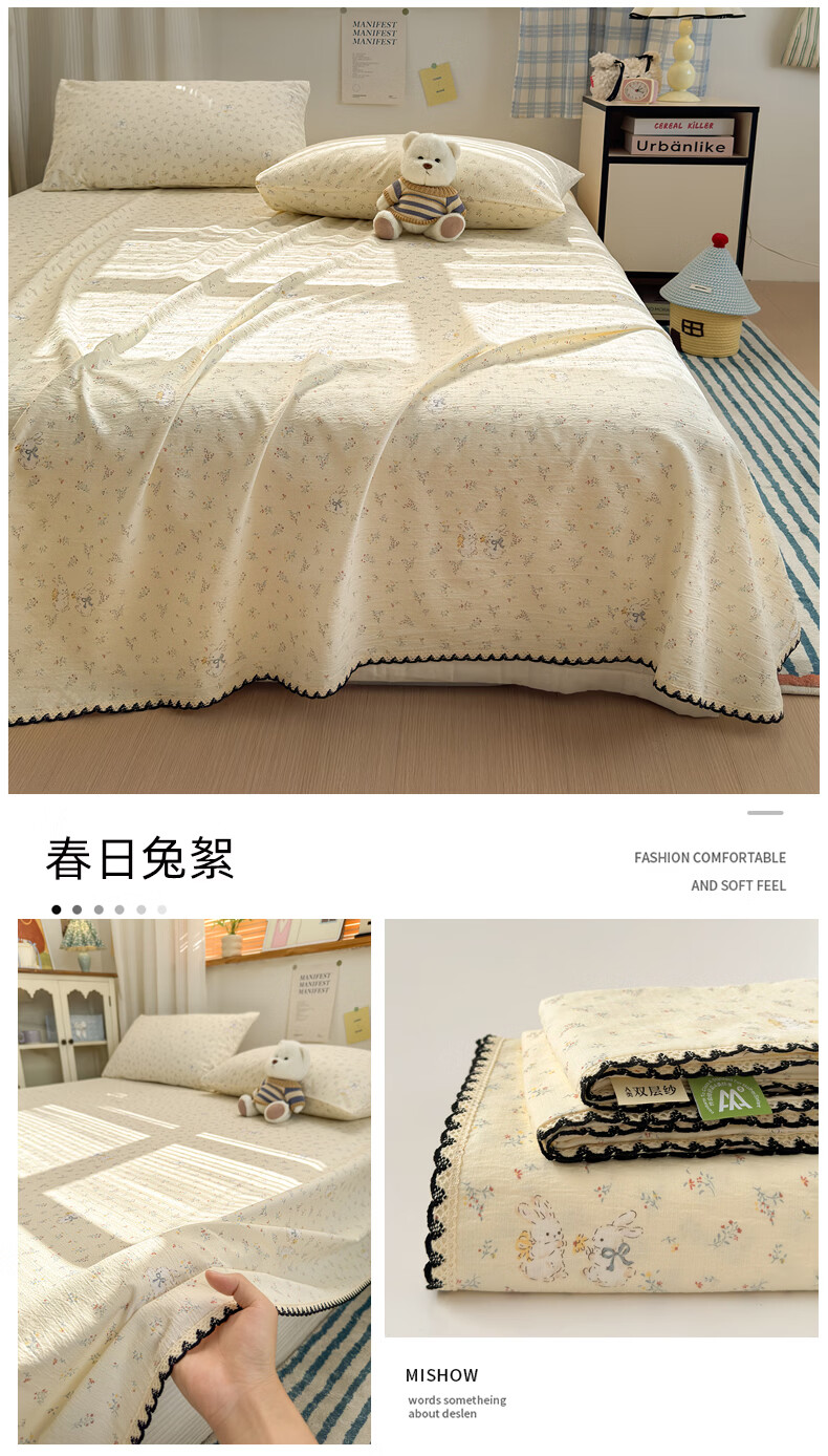 雅鹿花边双层纱床单1.5米x2米单件小清新被单枕套三件套宿舍单人床单 春日兔絮 【精美花边 柔软亲肤】 单床单-200x230cm 【适合1.5m床】