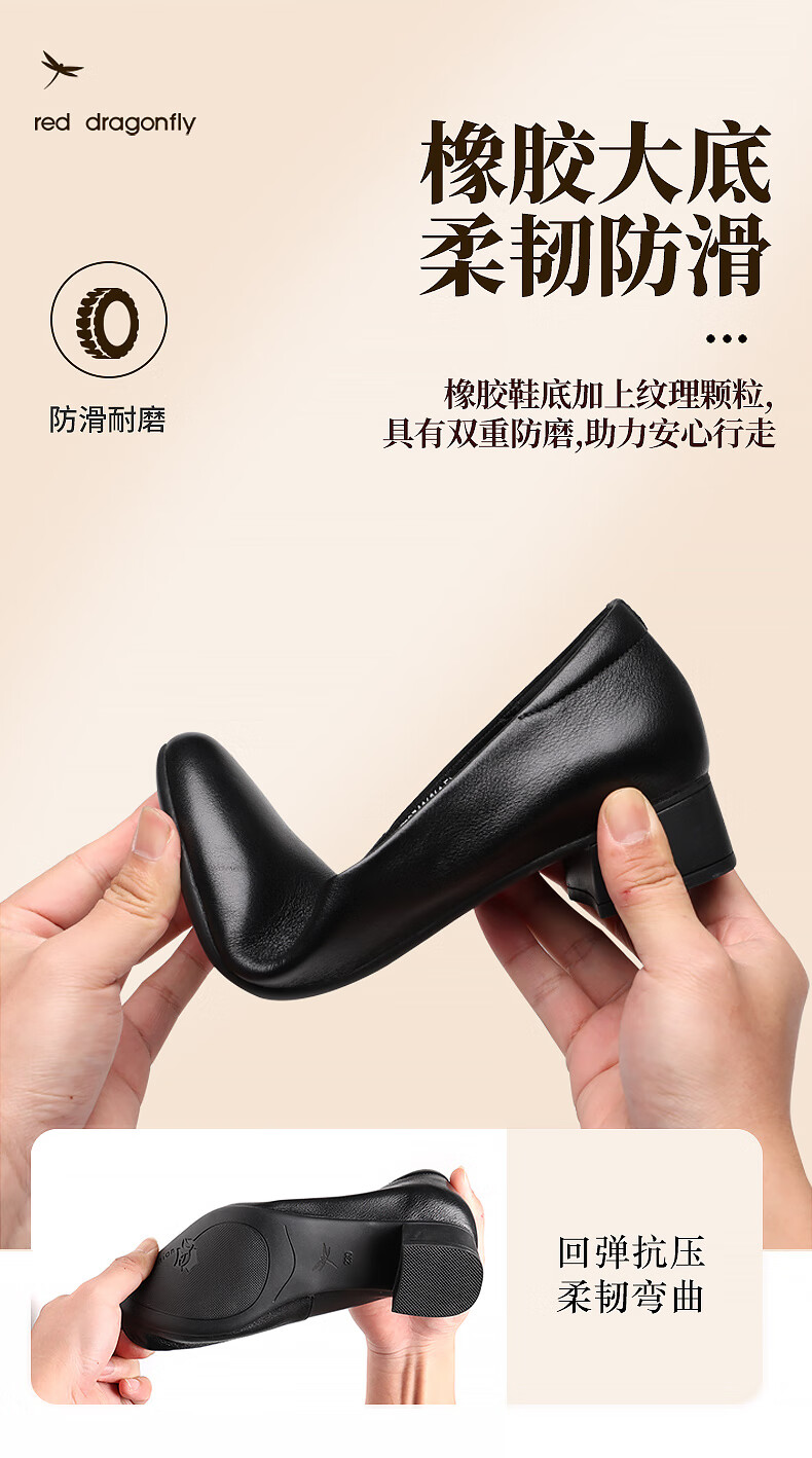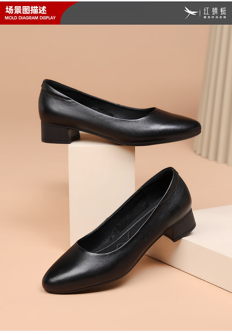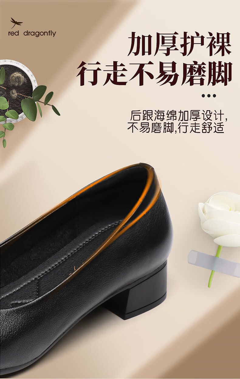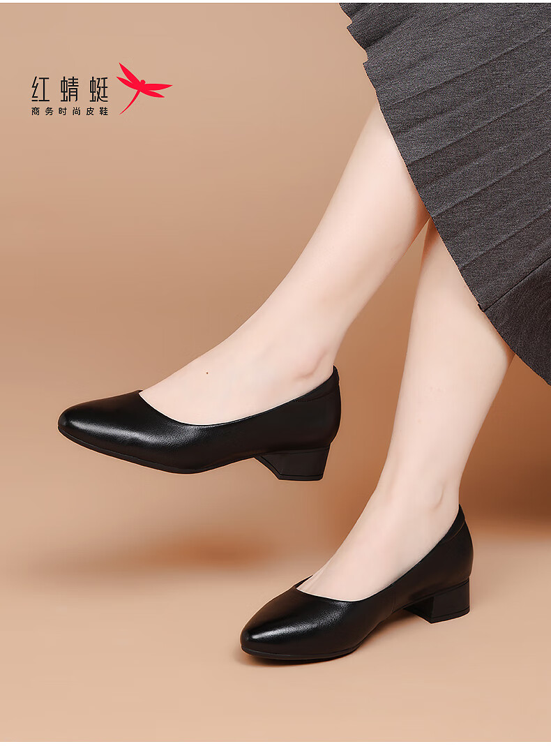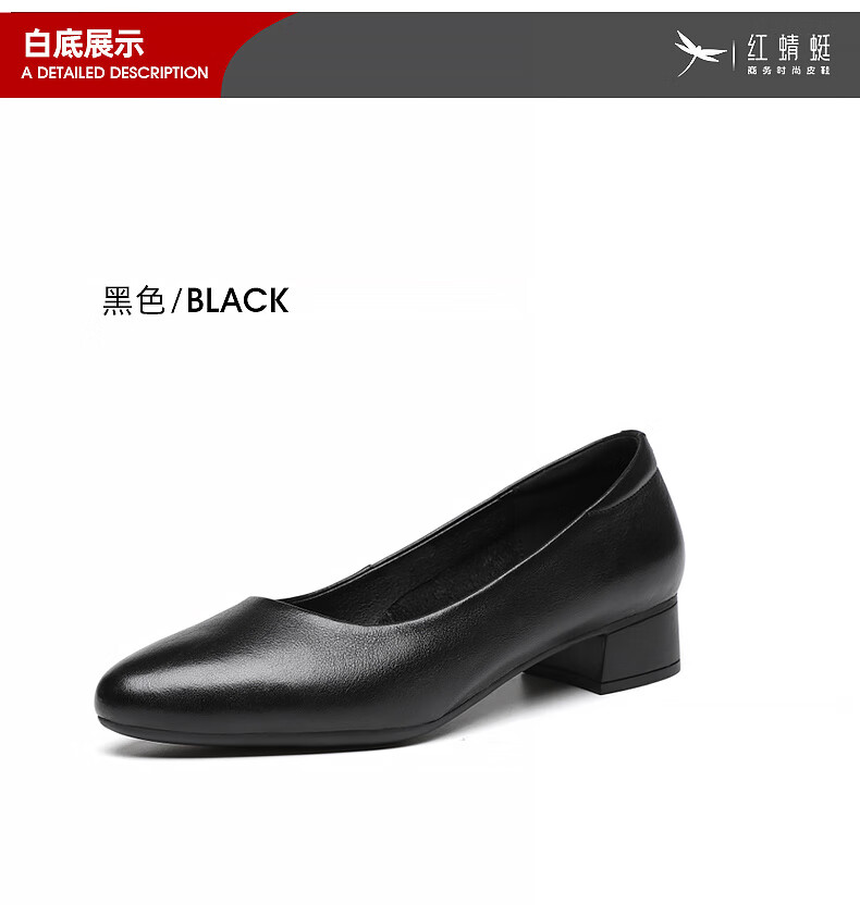 红蜻蜓单鞋女粗跟浅口女鞋中跟套脚鞋子女显瘦皮鞋WTB435931G黑色36