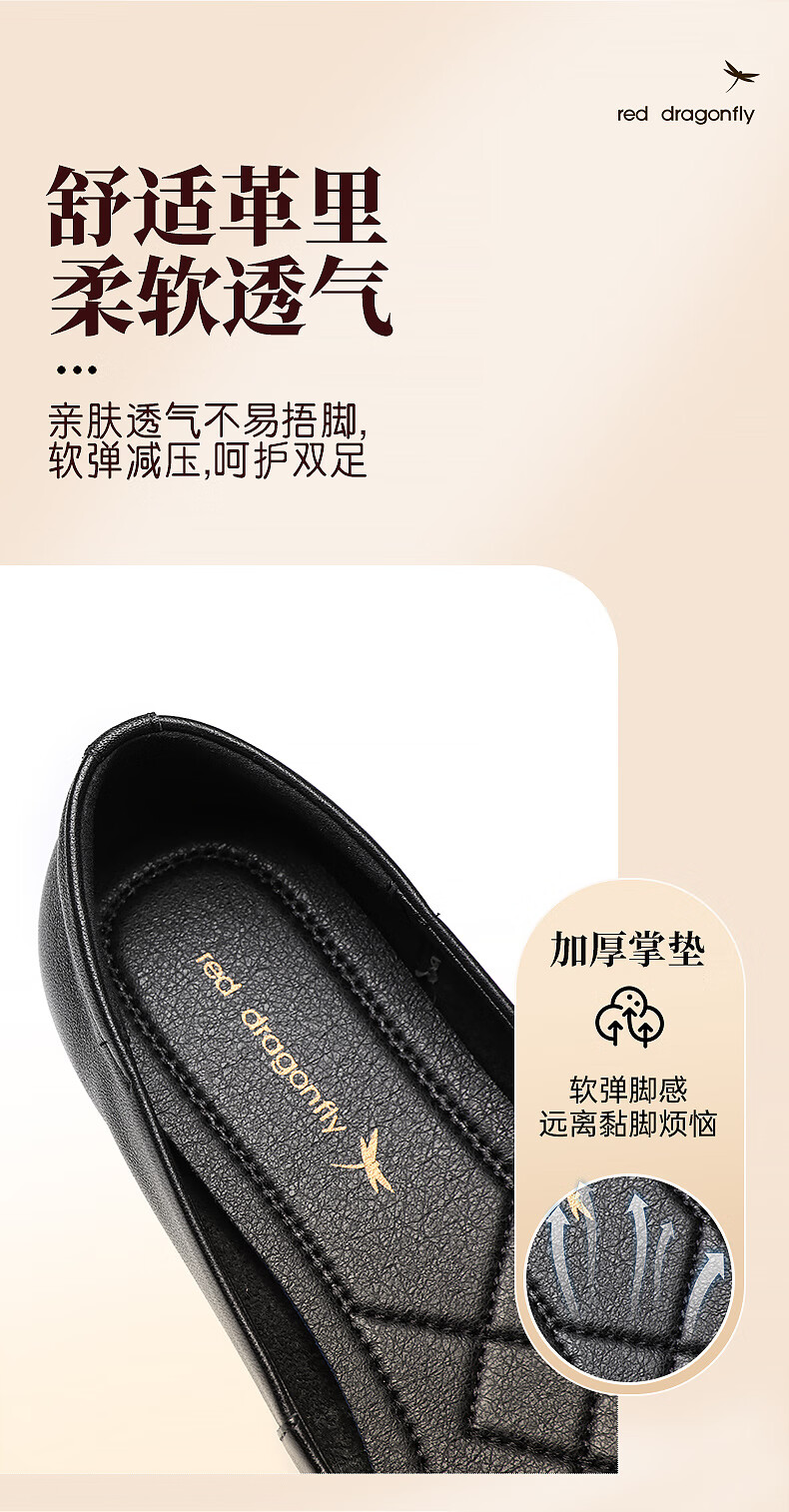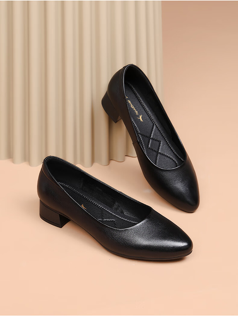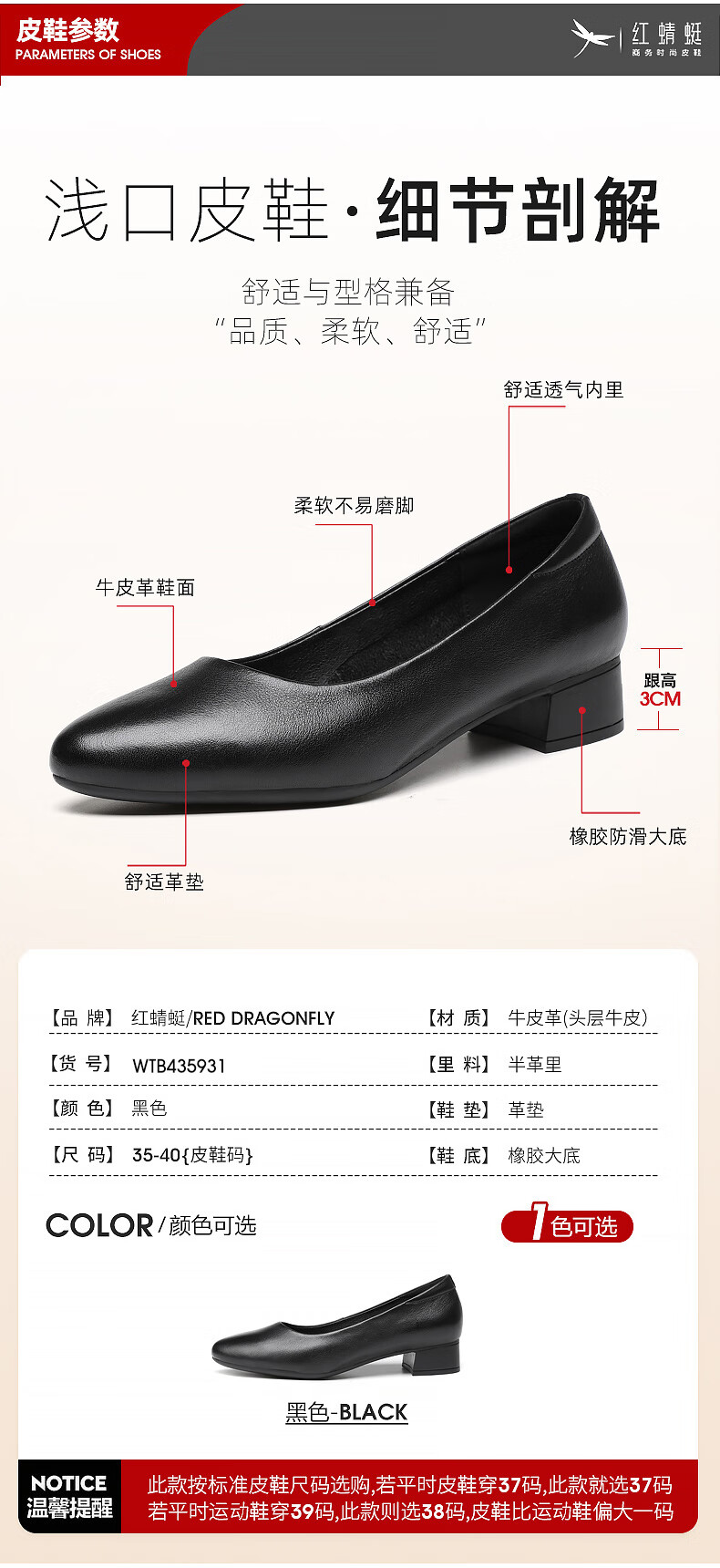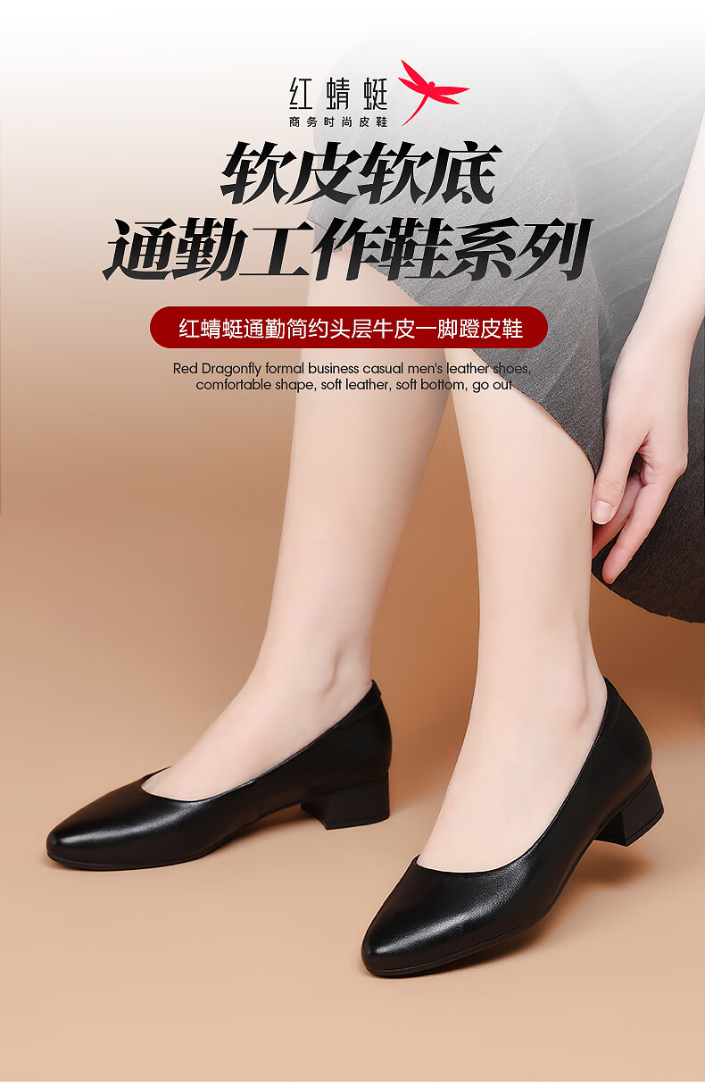 红蜻蜓单鞋女粗跟浅口女鞋中跟套脚鞋子女显瘦皮鞋WTB435931G黑色36