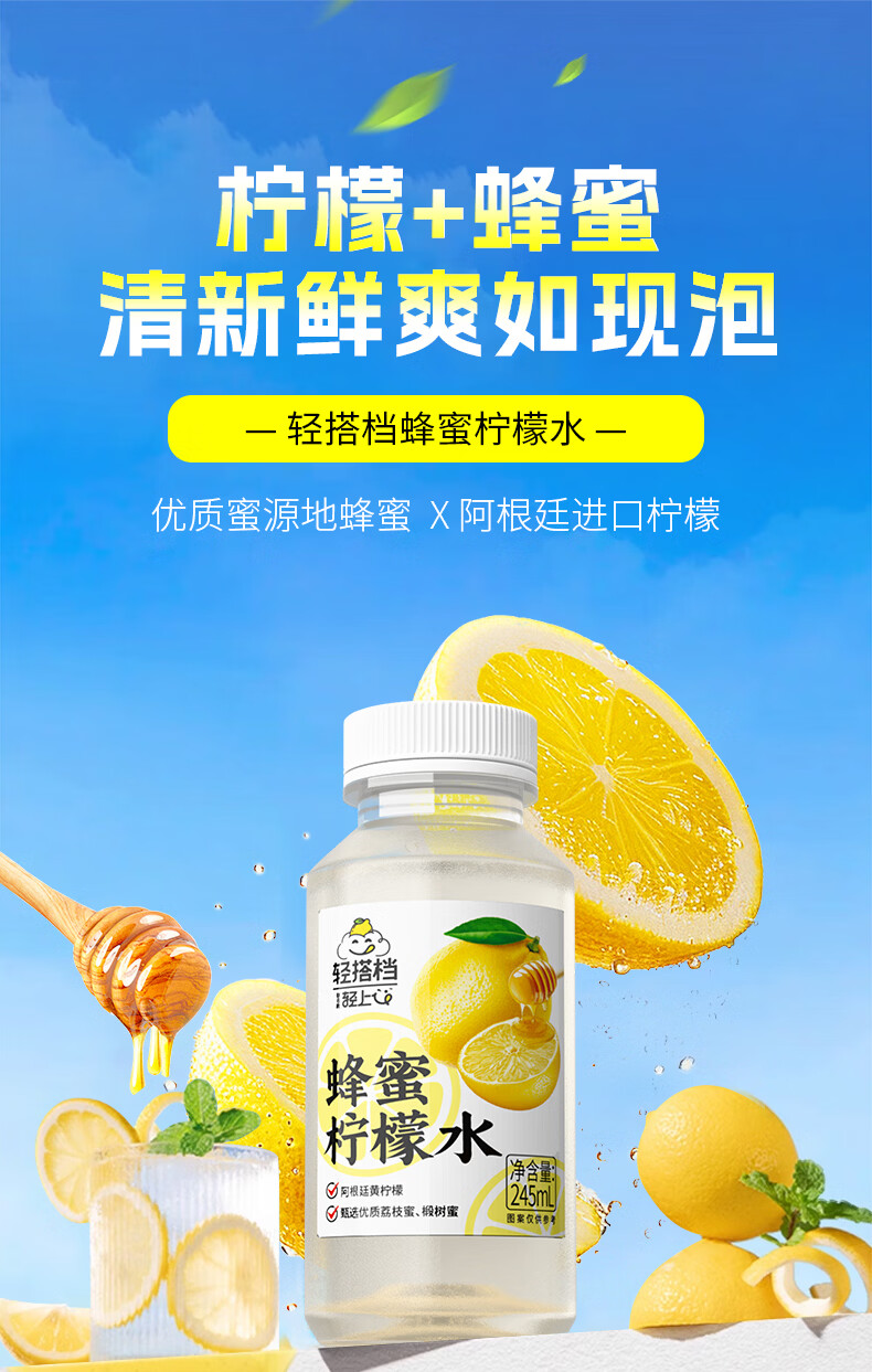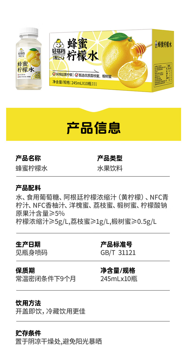 轻上蜜柠檬水饮品 配料表干净 双重NFC果汁清凉饮料蜂蜜饮料 蜂蜜柠檬水245ml*10