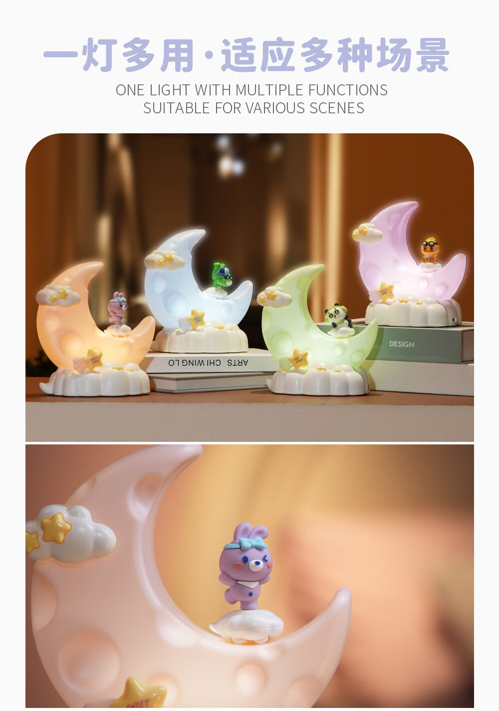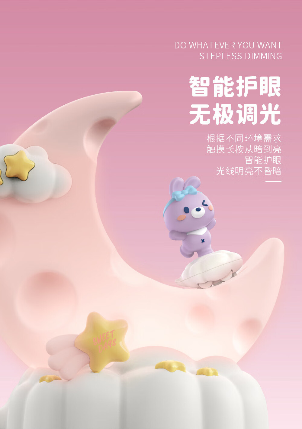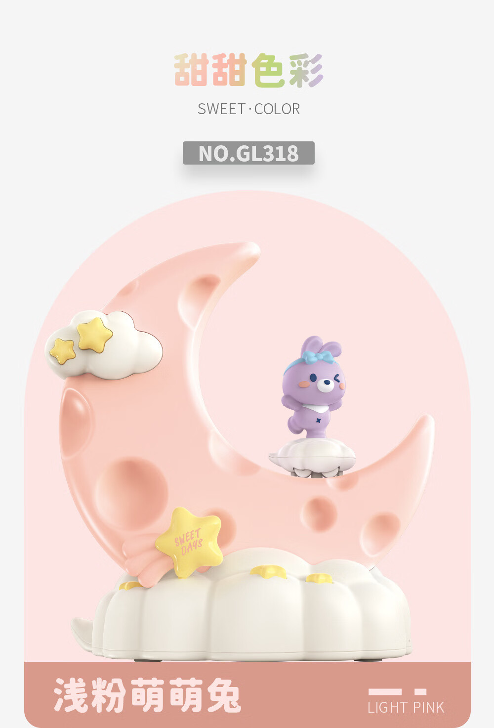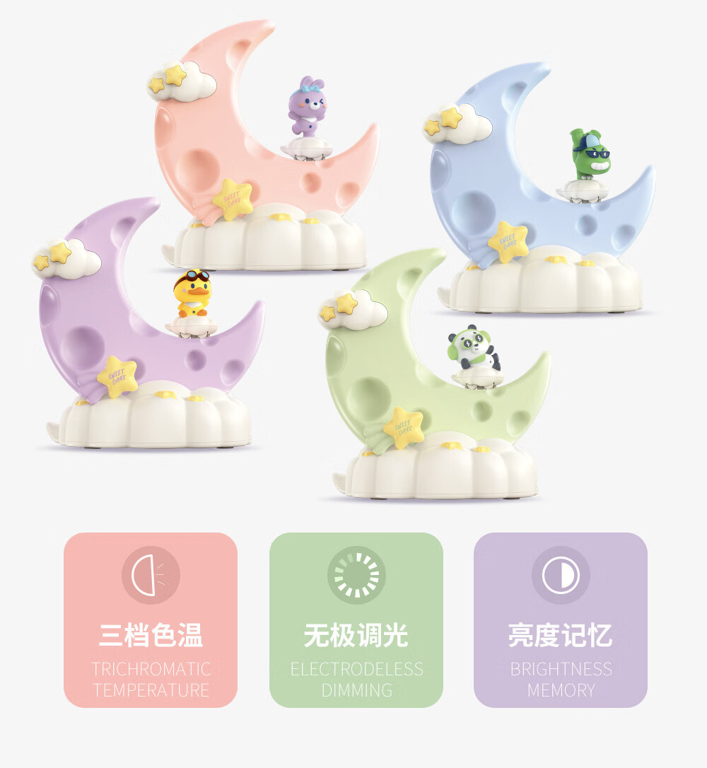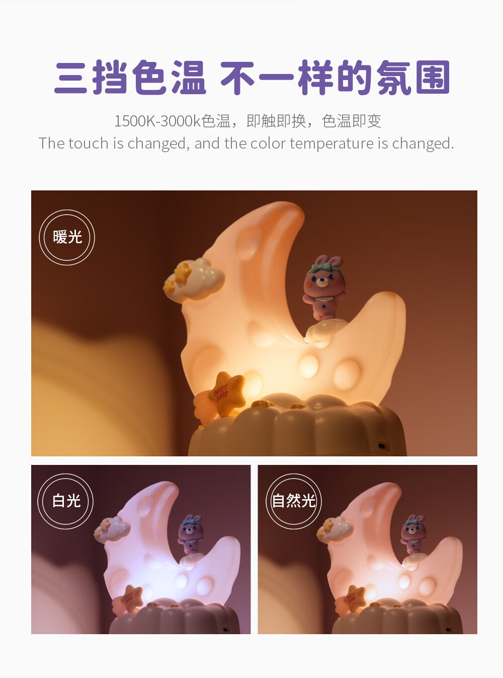 OUMIROLED触控三色调光USB台灯卡通创意月亮可充电礼物卧室摆件小夜灯 粉色-兔子月亮精美小夜灯【送充电线】