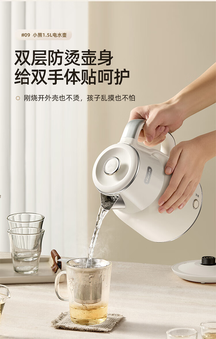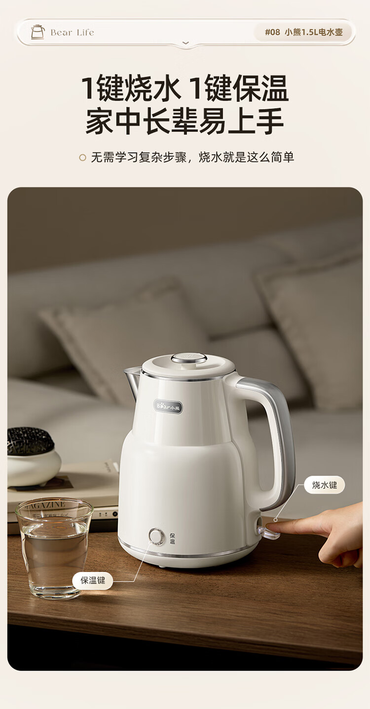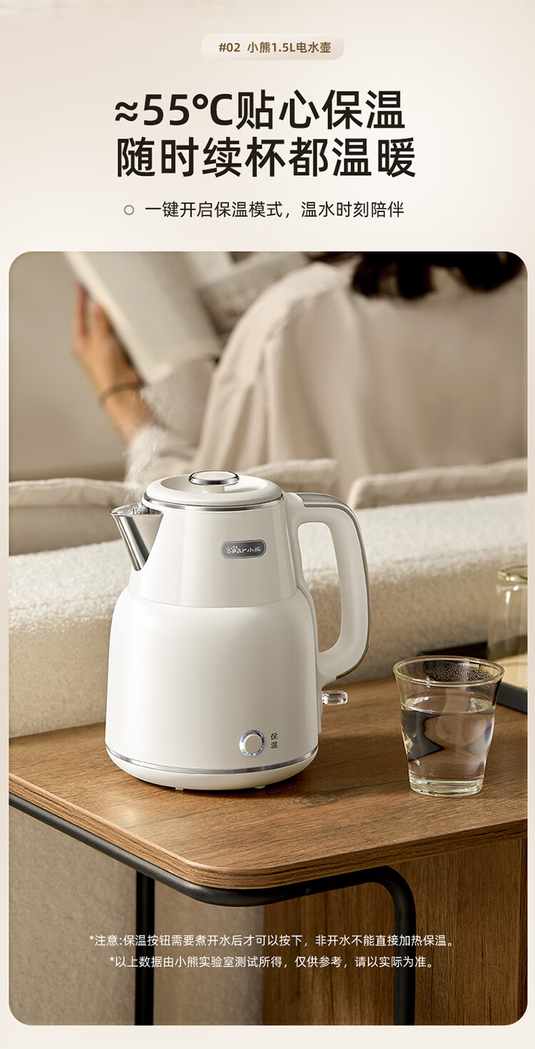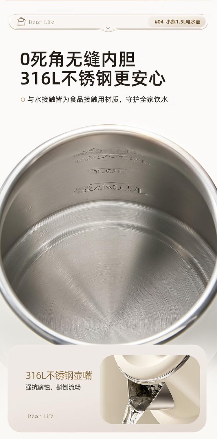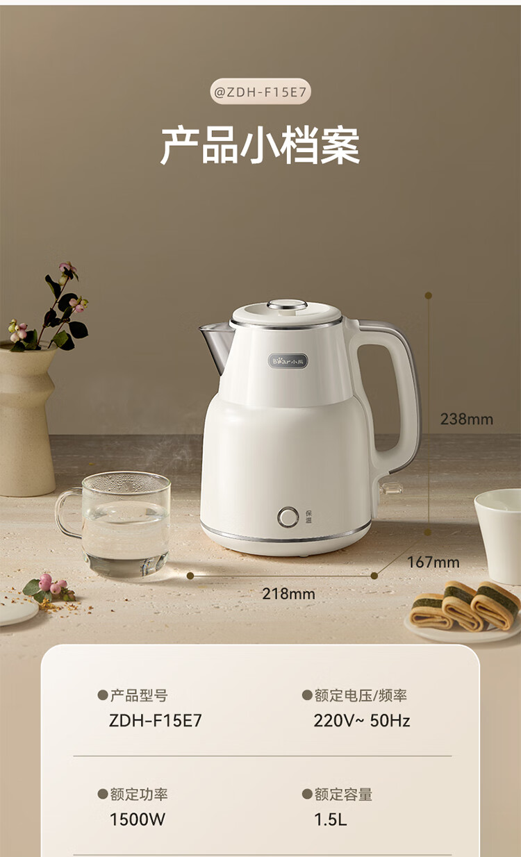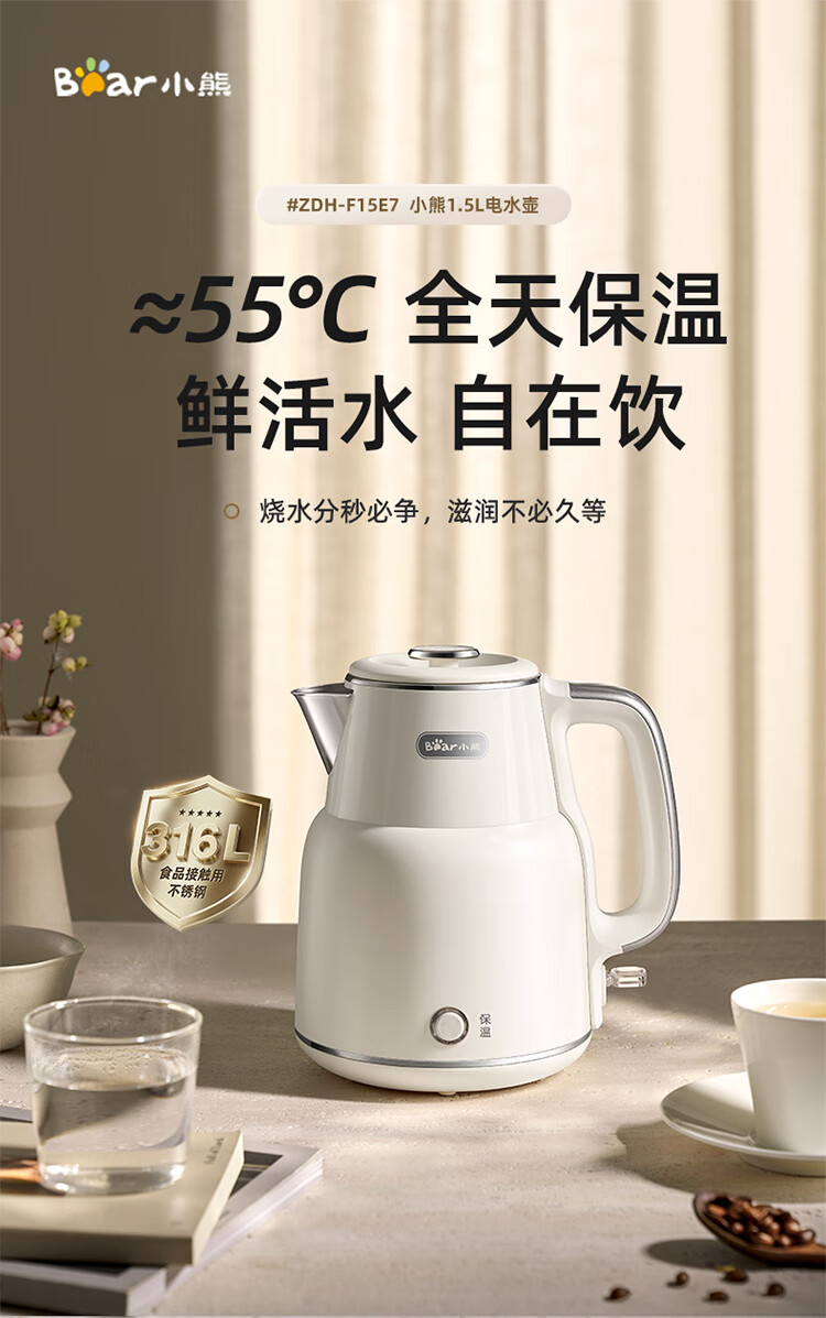 小熊(Bear)烧水壶保温电热水壶316L不锈钢自动断电一体无缝1.5L家用恒温热水壶 ZDH-F15E7