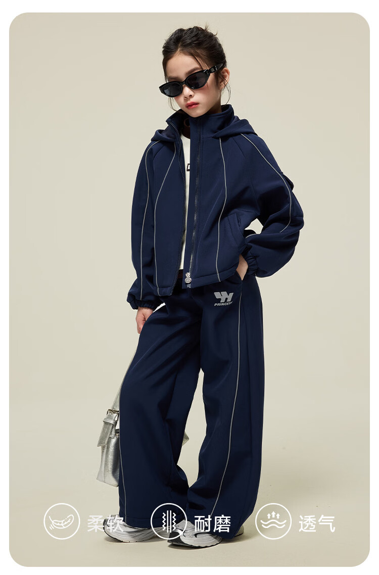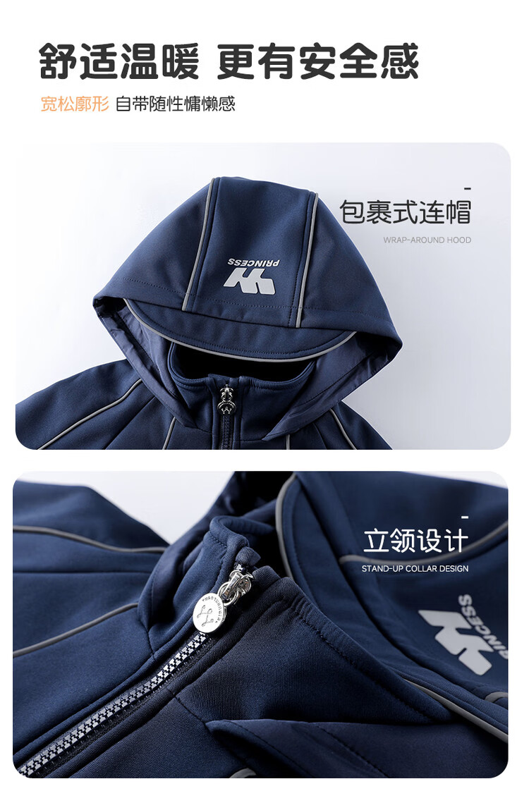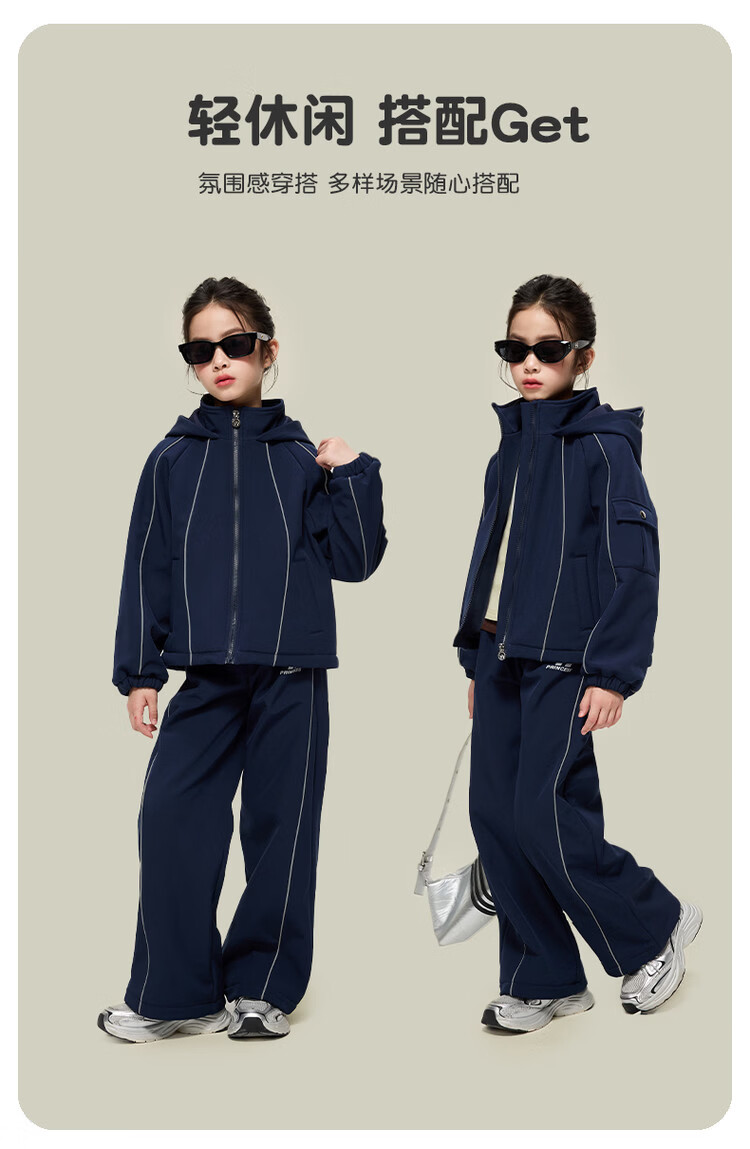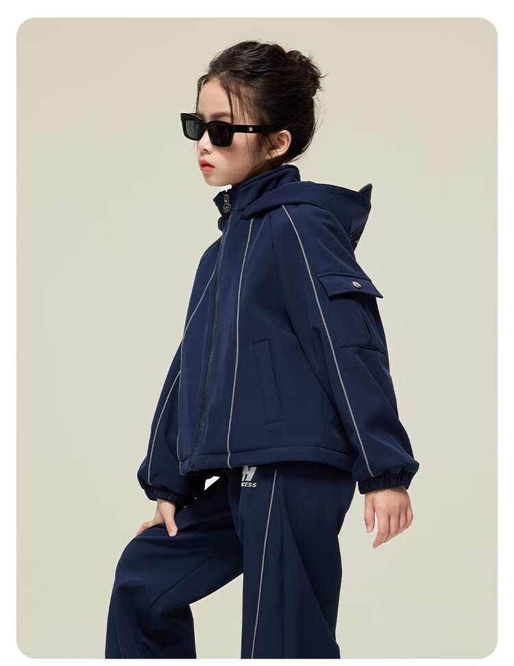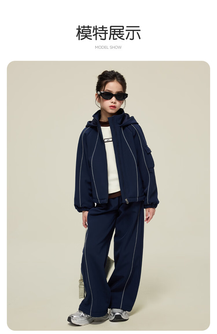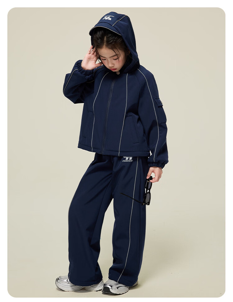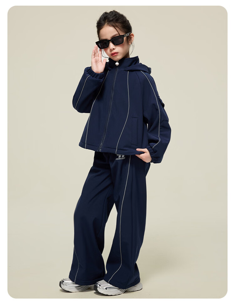 媛媛公主女童运动套装25秋冬新款儿童加绒加厚保暖防风外套休闲裤两件套 藏青色 150