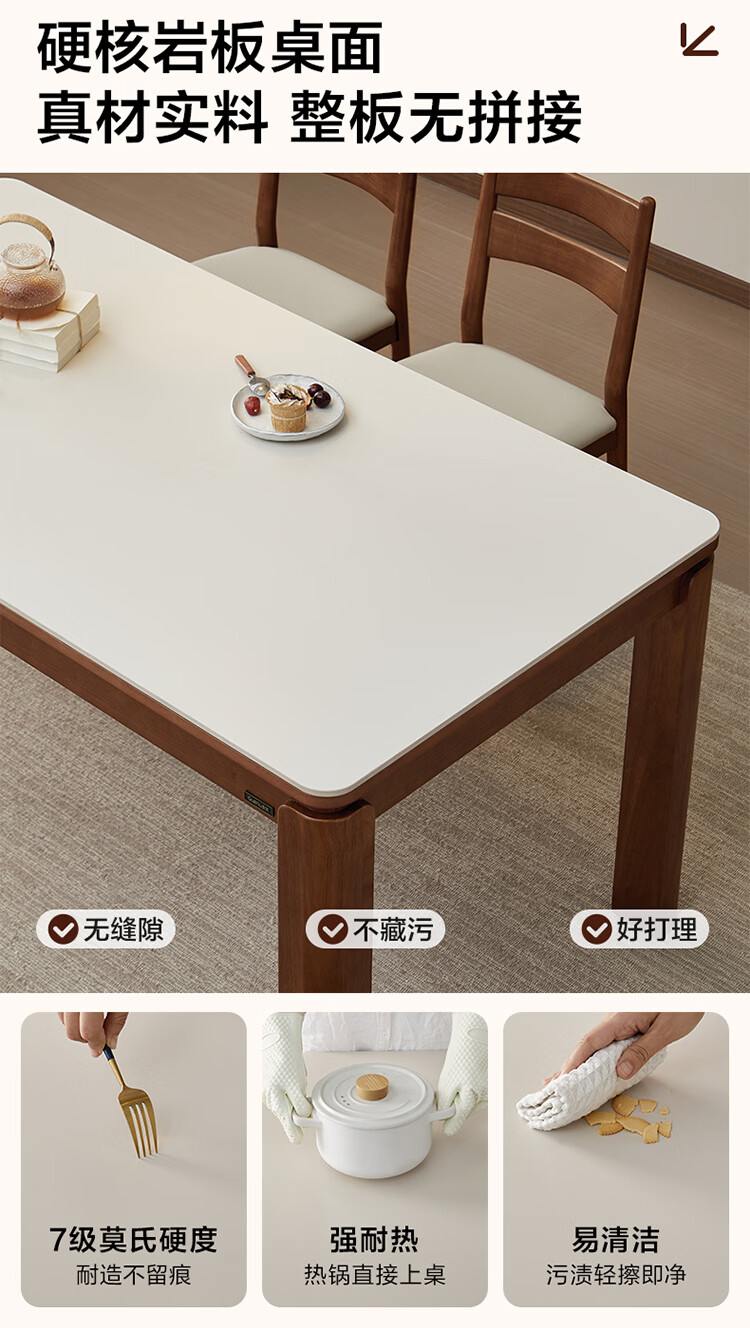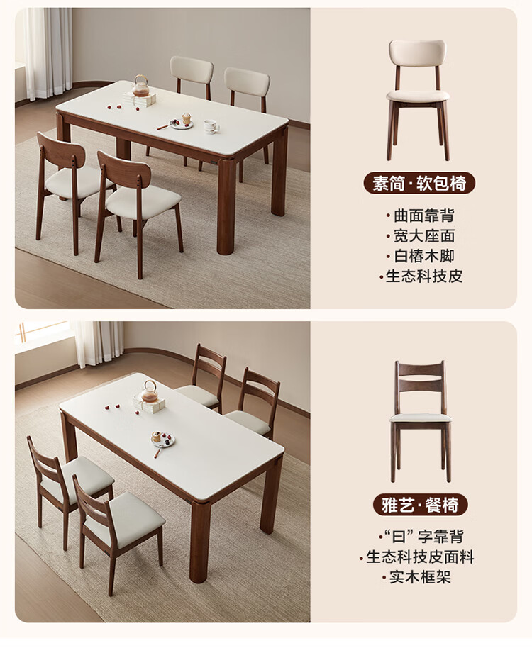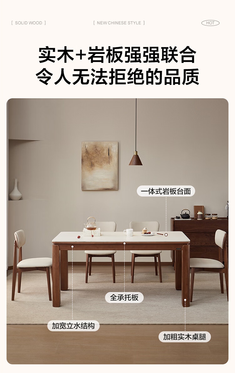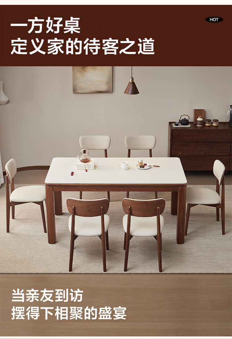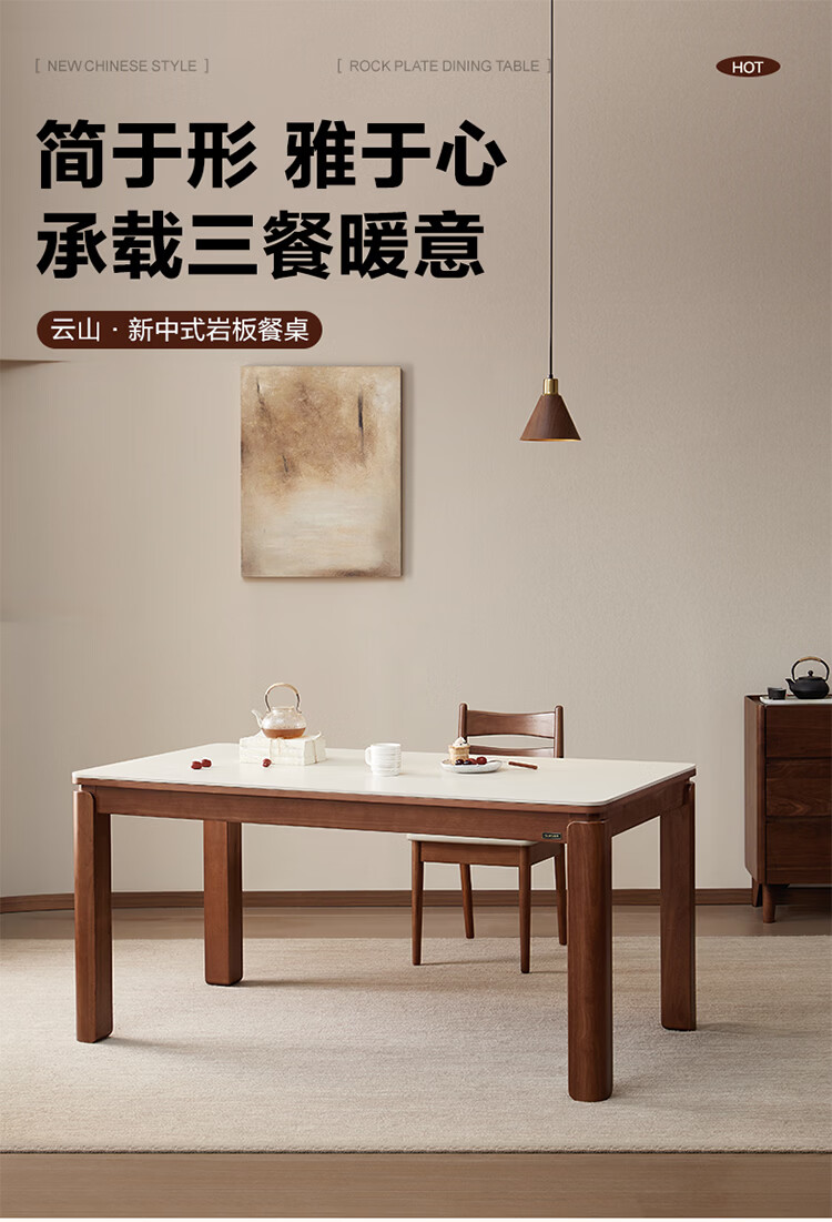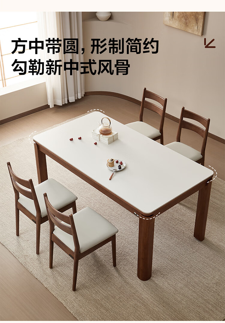 全友家居新中式岩板餐桌家用实木桌脚餐桌椅组合套装家具一桌四椅饭桌 素简软包椅*2