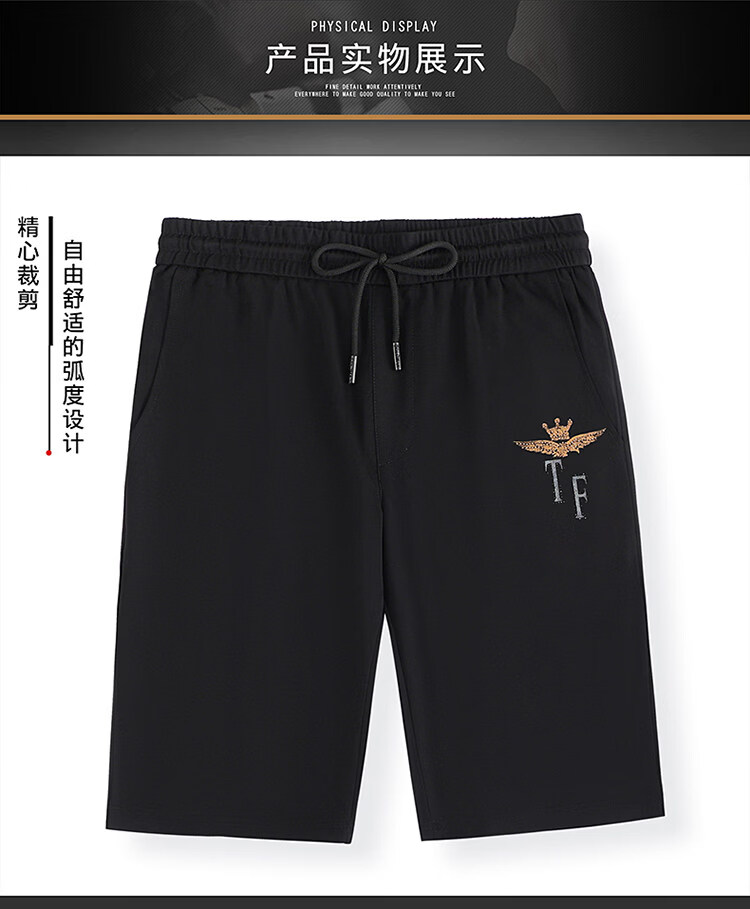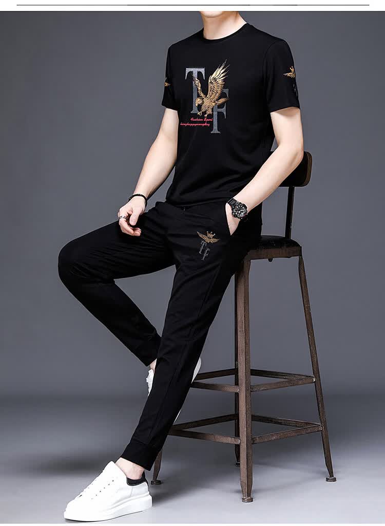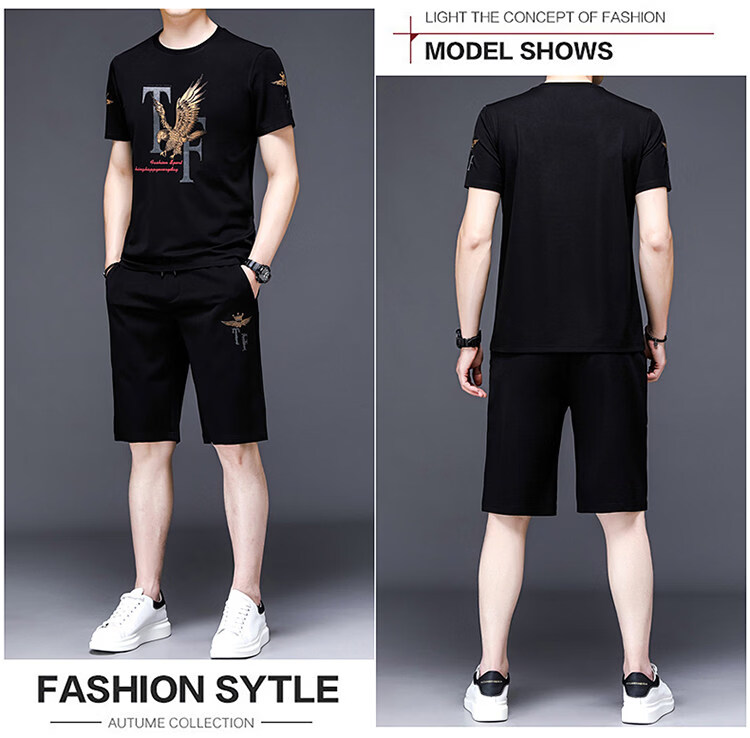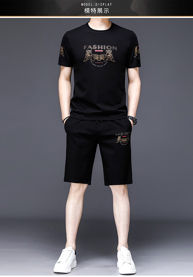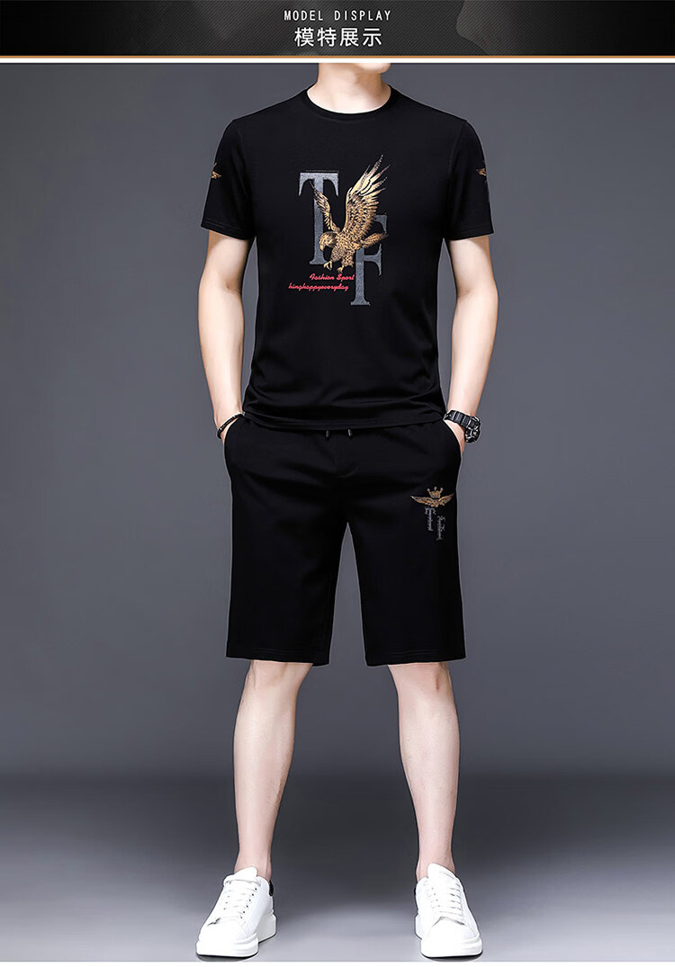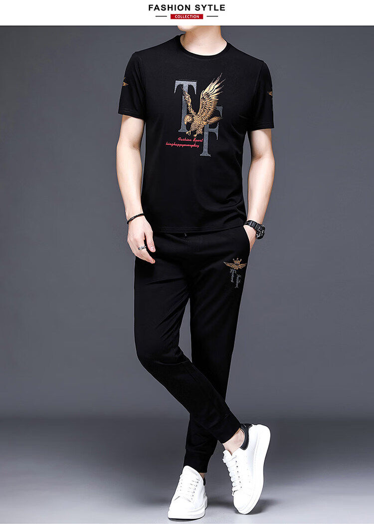 阿玛尼(ARMANI)正品名牌男士休闲运动服套装男夏季桑蚕丝短袖t恤潮男装三件套 国际一线品牌19362黑色短袖+长裤 M 165_【建议90-120斤】
