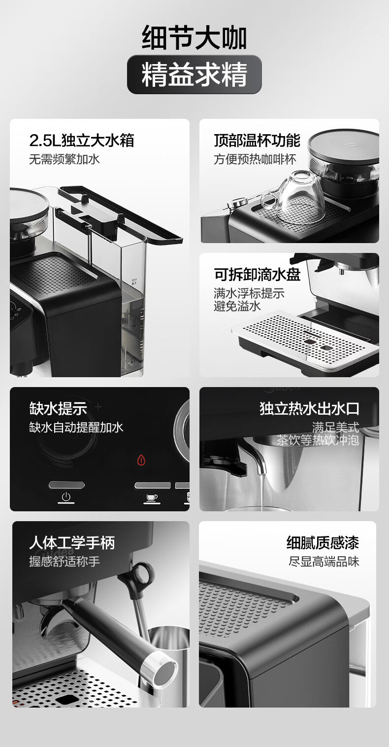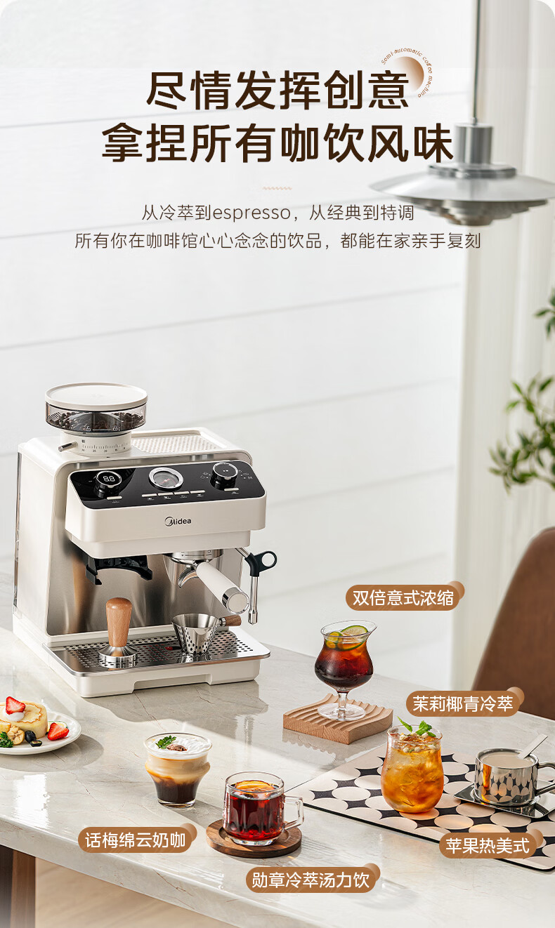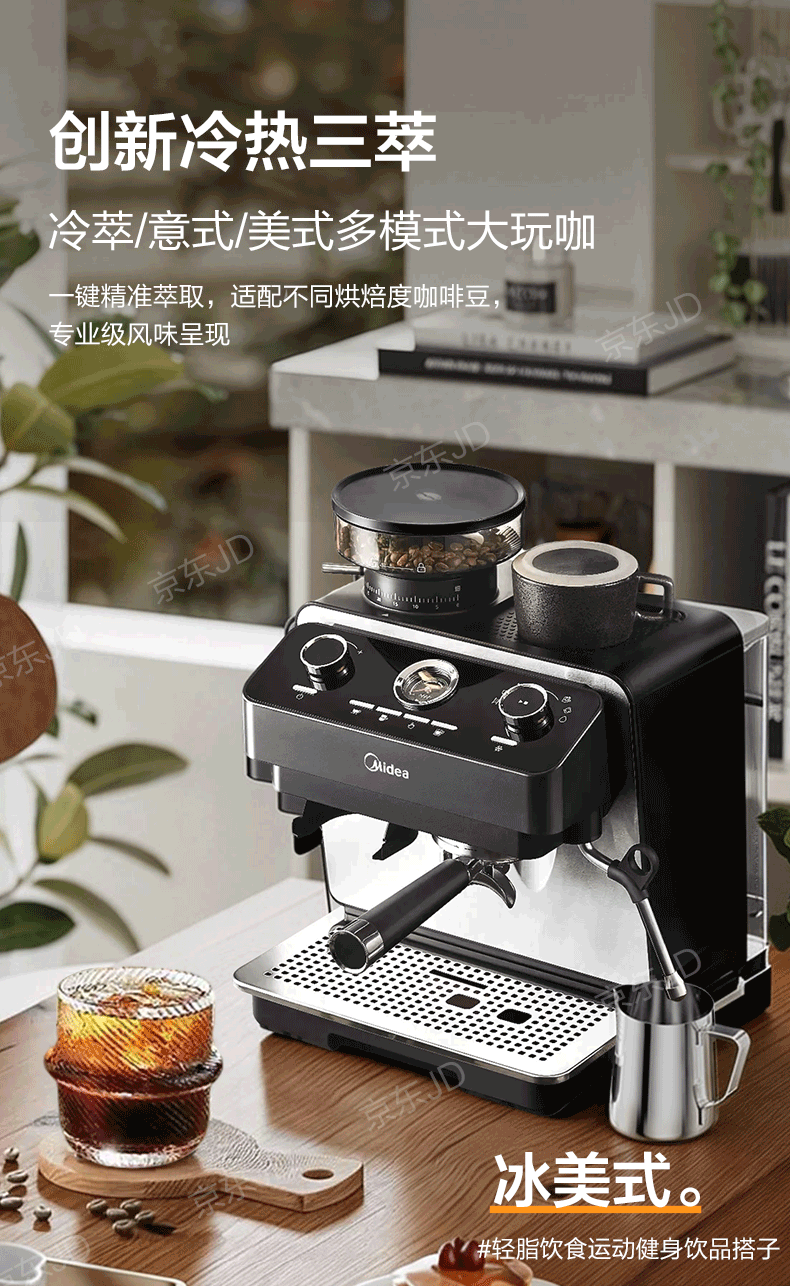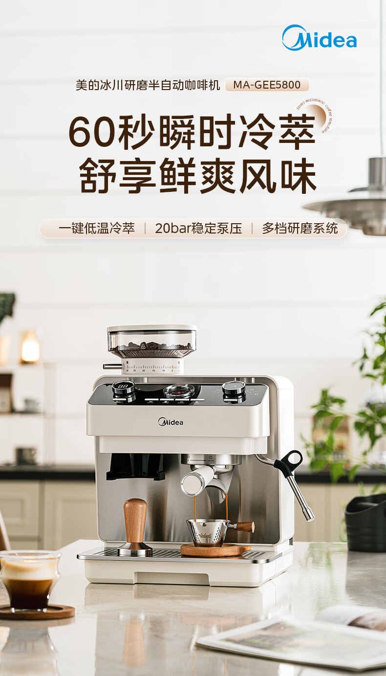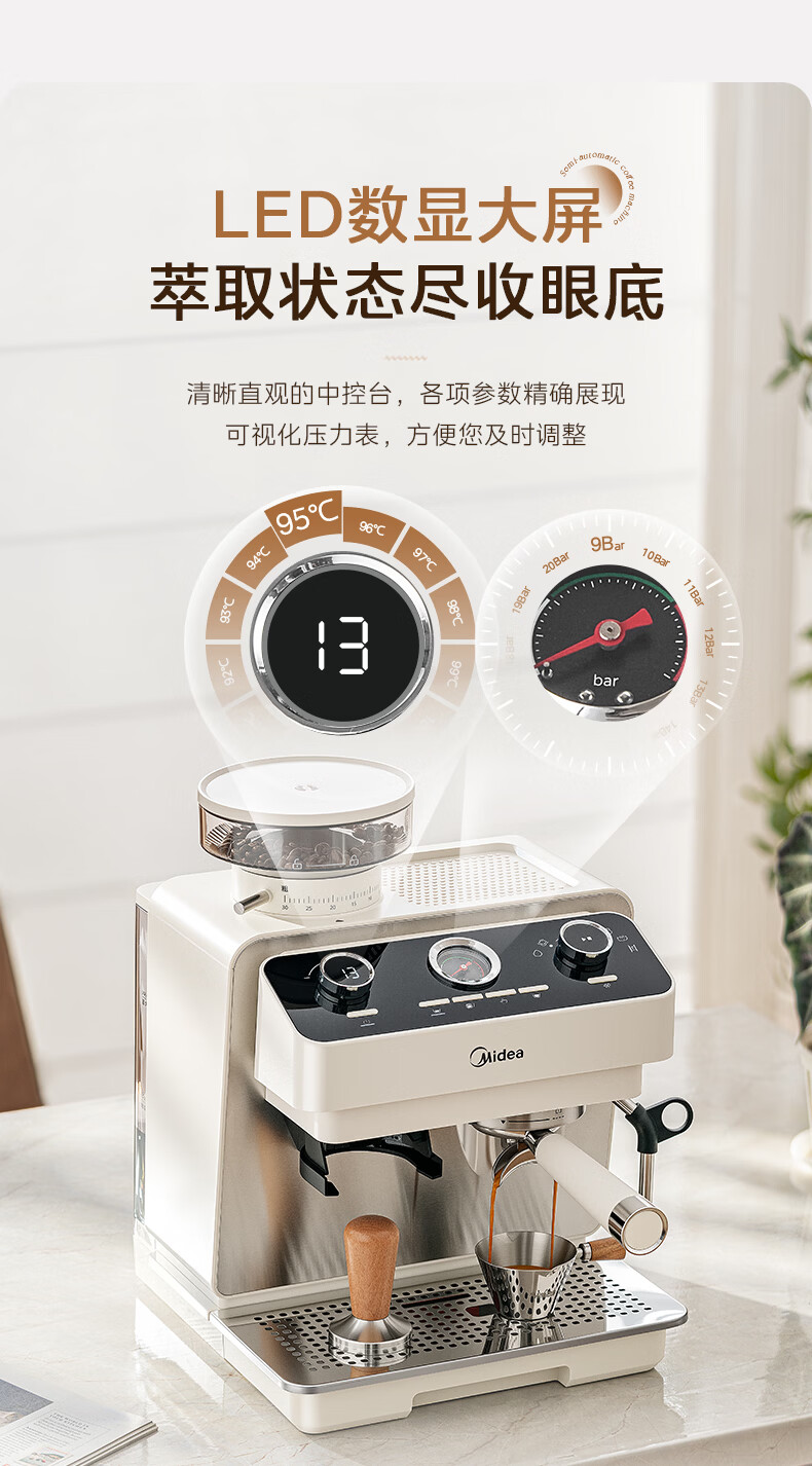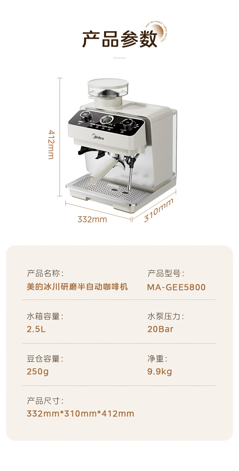 美的(Midea)半自动咖啡机磨豆机冷萃研磨一体机家用意式浓缩双锅炉可视压力30档研磨 【玄武】MA-GE5810黑武士